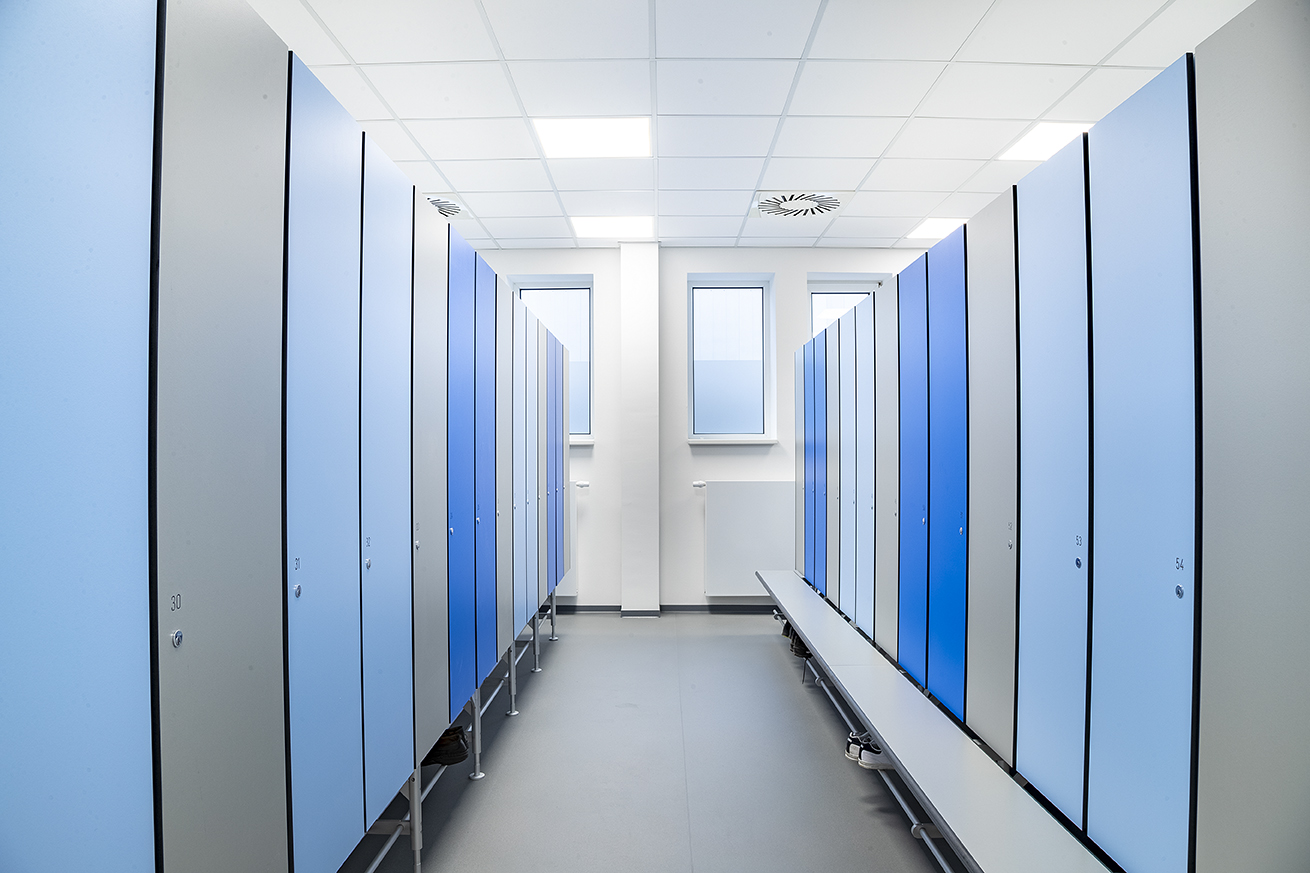 Im Objekt Siemens in Leipzig wurden Schranksysteme des Typo S eingesetzt. Die Ausführung umfasst Stahlkorpusse mit Türen aus 13 mm HPL, montiert auf Untergestellen – teilweise mit und teilweise ohne Sitzbankauflage. Die Türschließung erfolgt über ein Zylinderhebelschloss, und die Türnummerierung ist elegant eingraviert.