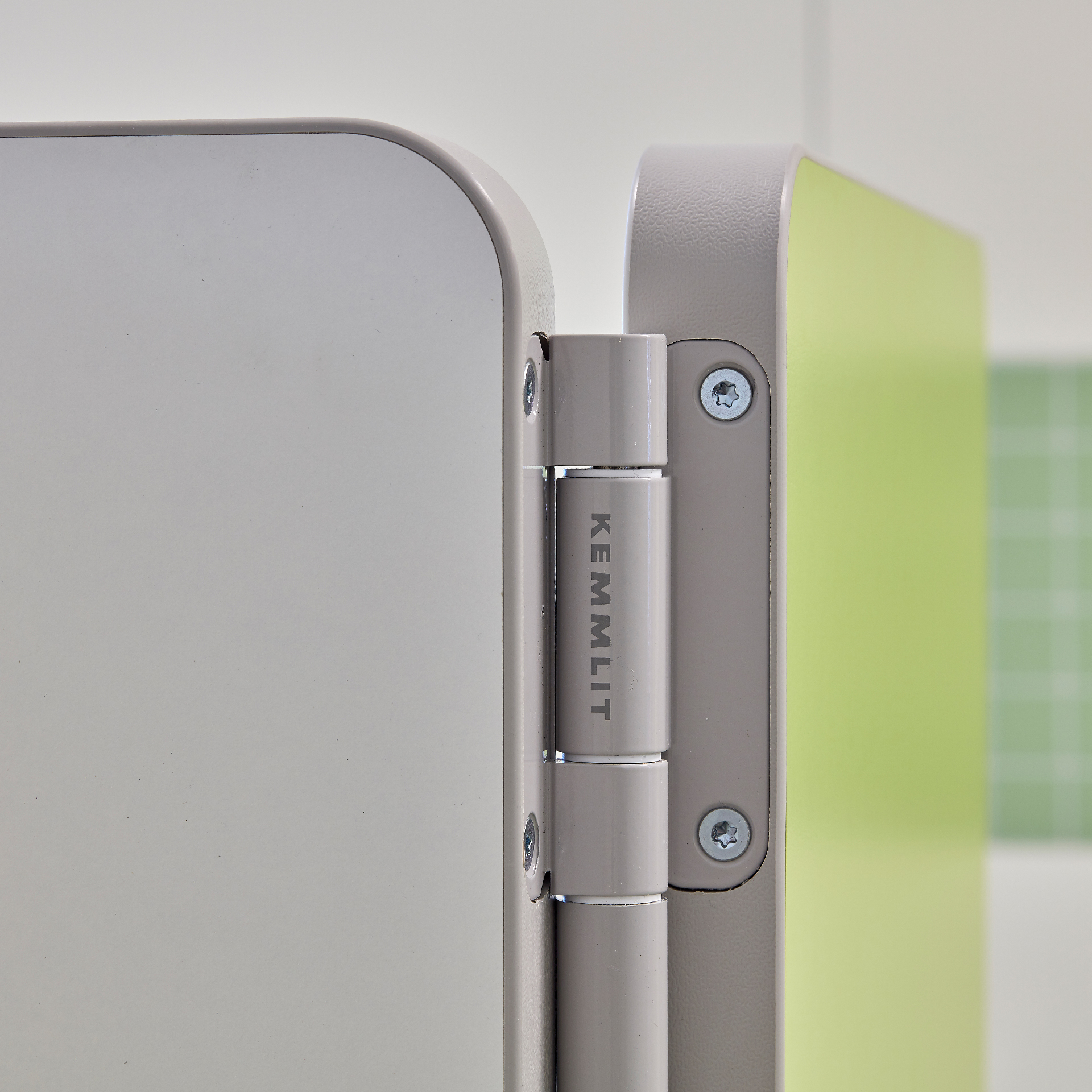 Kindgerechtes WC-Trennwandsystem aus 30 mm Holzwerkstoffplatten mit stoßfesten ABS-Kanten, umfassendem Fingerklemmschutz und TÜV-/GS-Zertifizierung.
