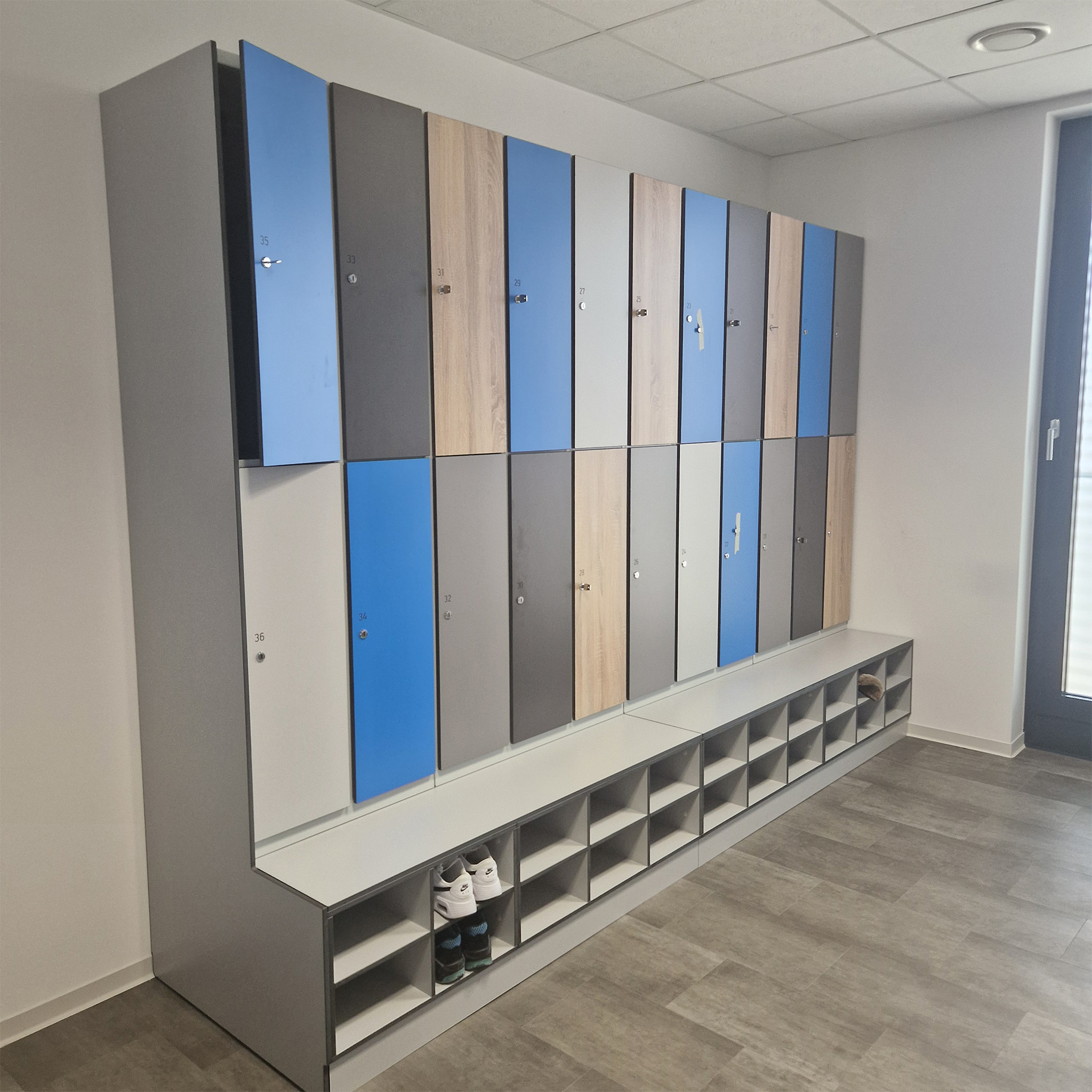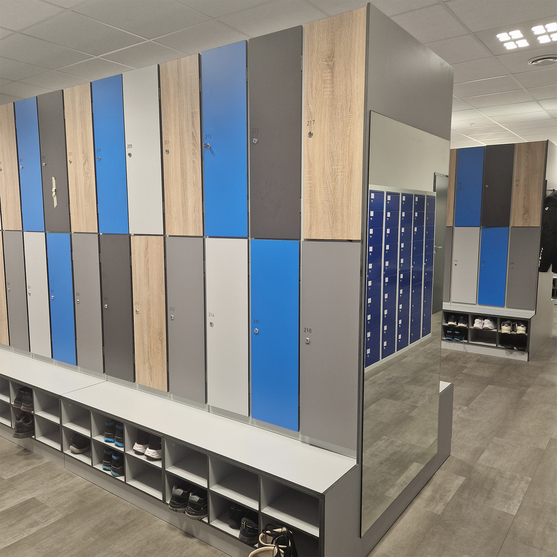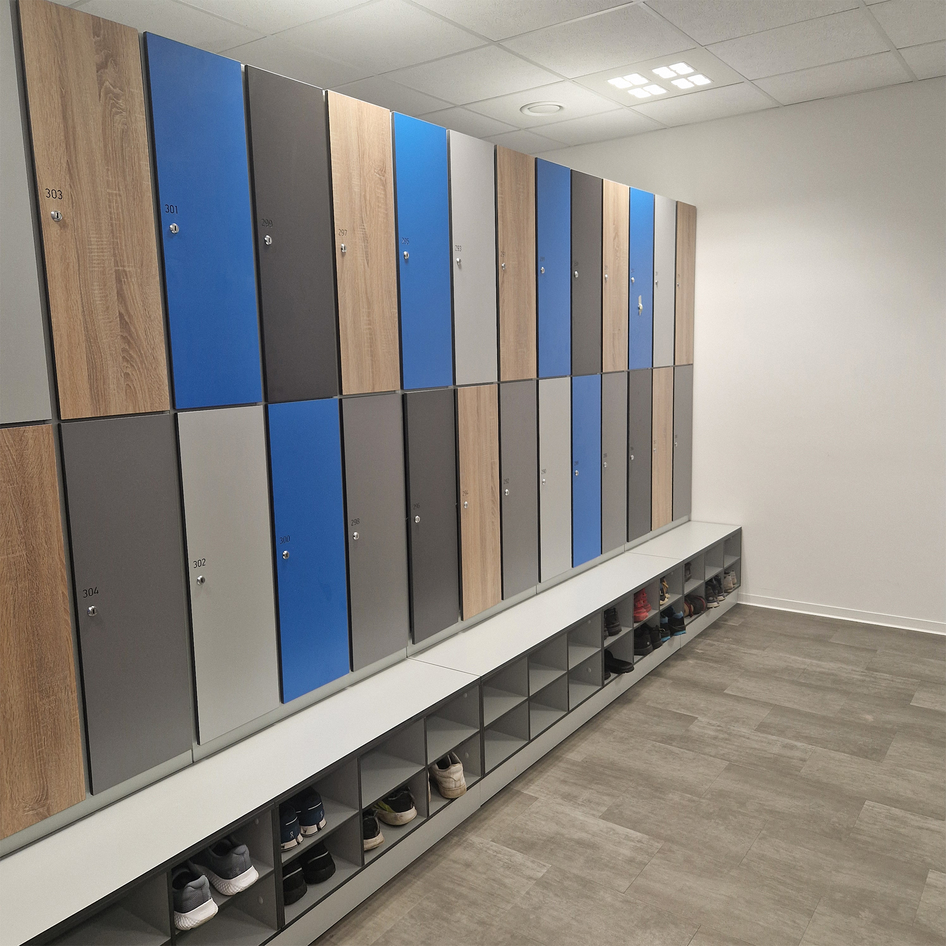 Robuster Stahlspind mit hochwertigem Korpus und extrem widerstandsfähigen HPL-Türen – langlebig, pflegeleicht und ideal für moderne Umkleidebereiche mit hohen Belastungen.