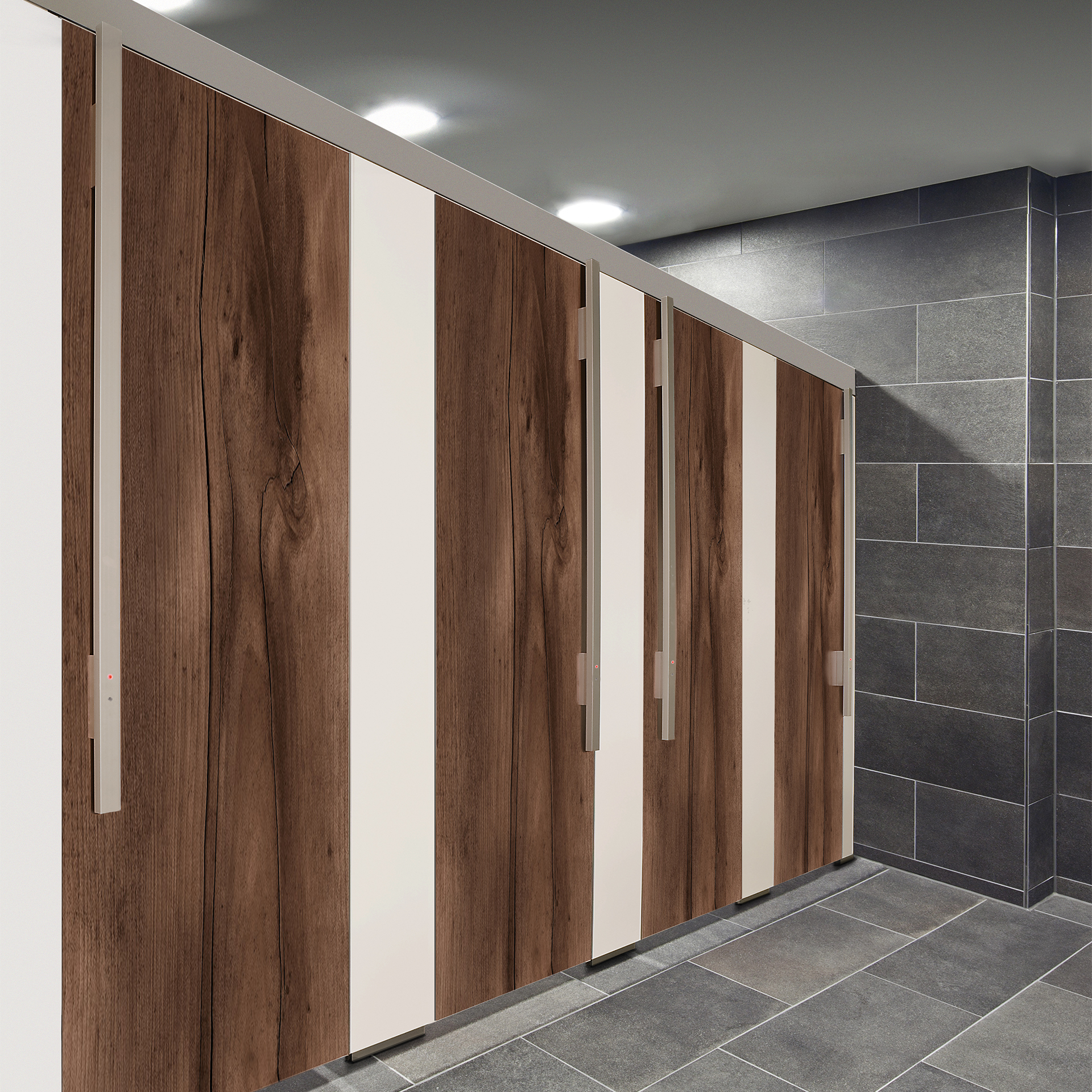 WC-Trennwandsystem aus 30 mm Holzwerkstoffelementen mit robuster ABS-Kante, langlebigen KEMMLIT-Bändern und flexiblen Konstruktionsvarianten.