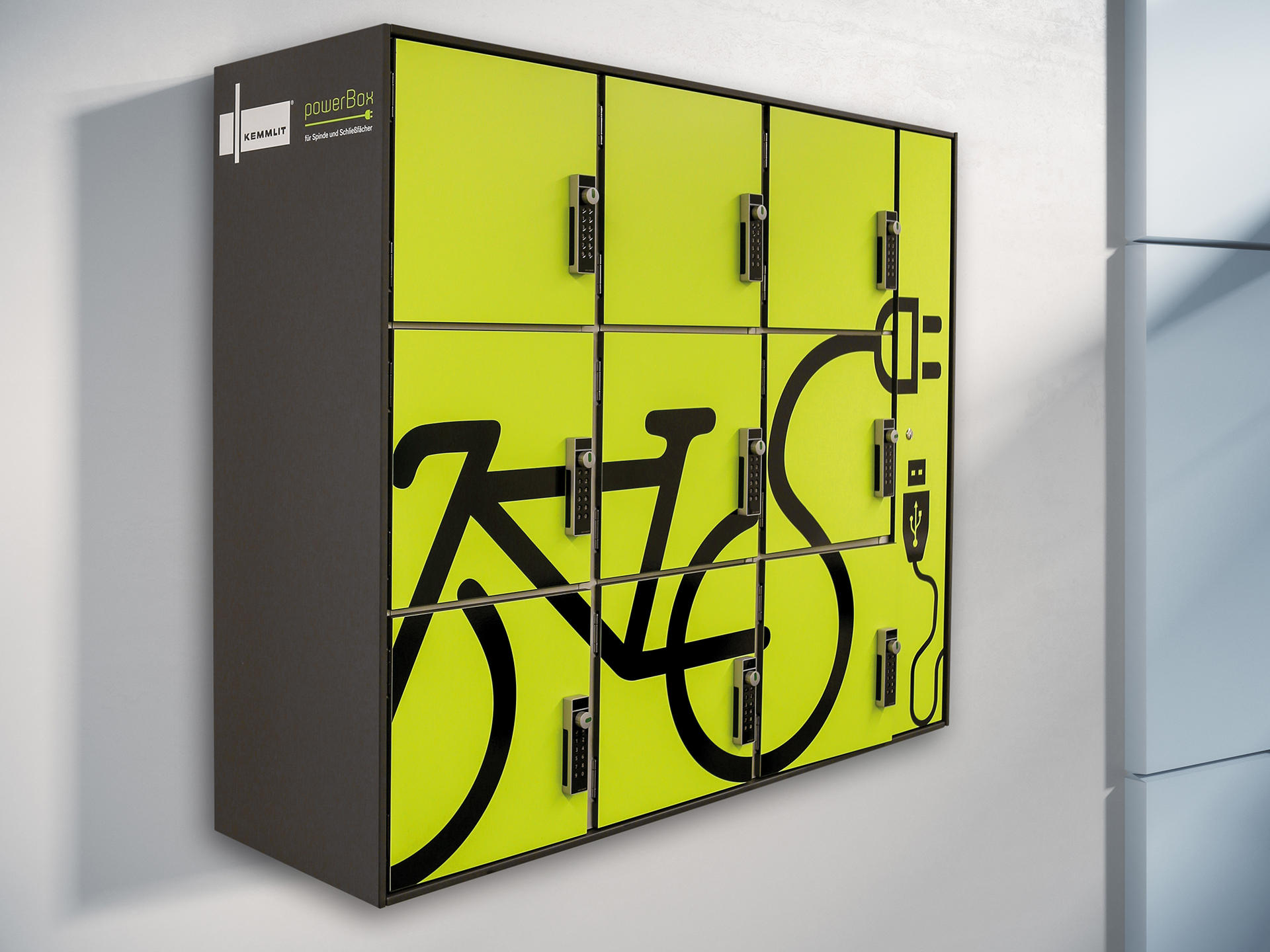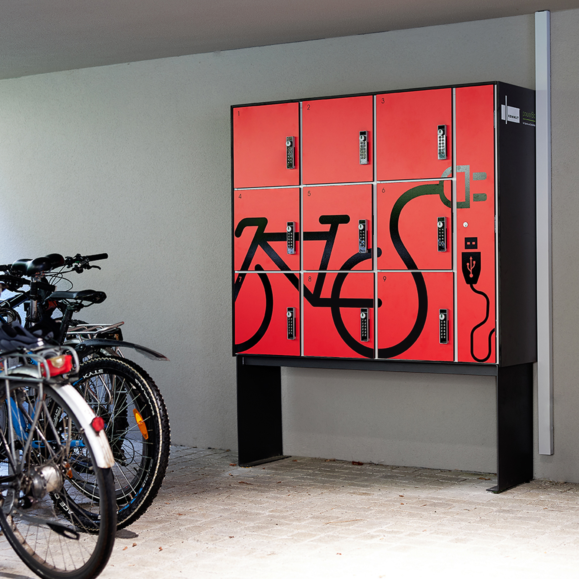 Elektrifizierte Schließfachlösung aus Aluminium und HPL für das sichere Aufladen und Aufbewahren von Akkus und Geräten – TÜV/GS-geprüft und für Indoor & Outdoor geeignet.