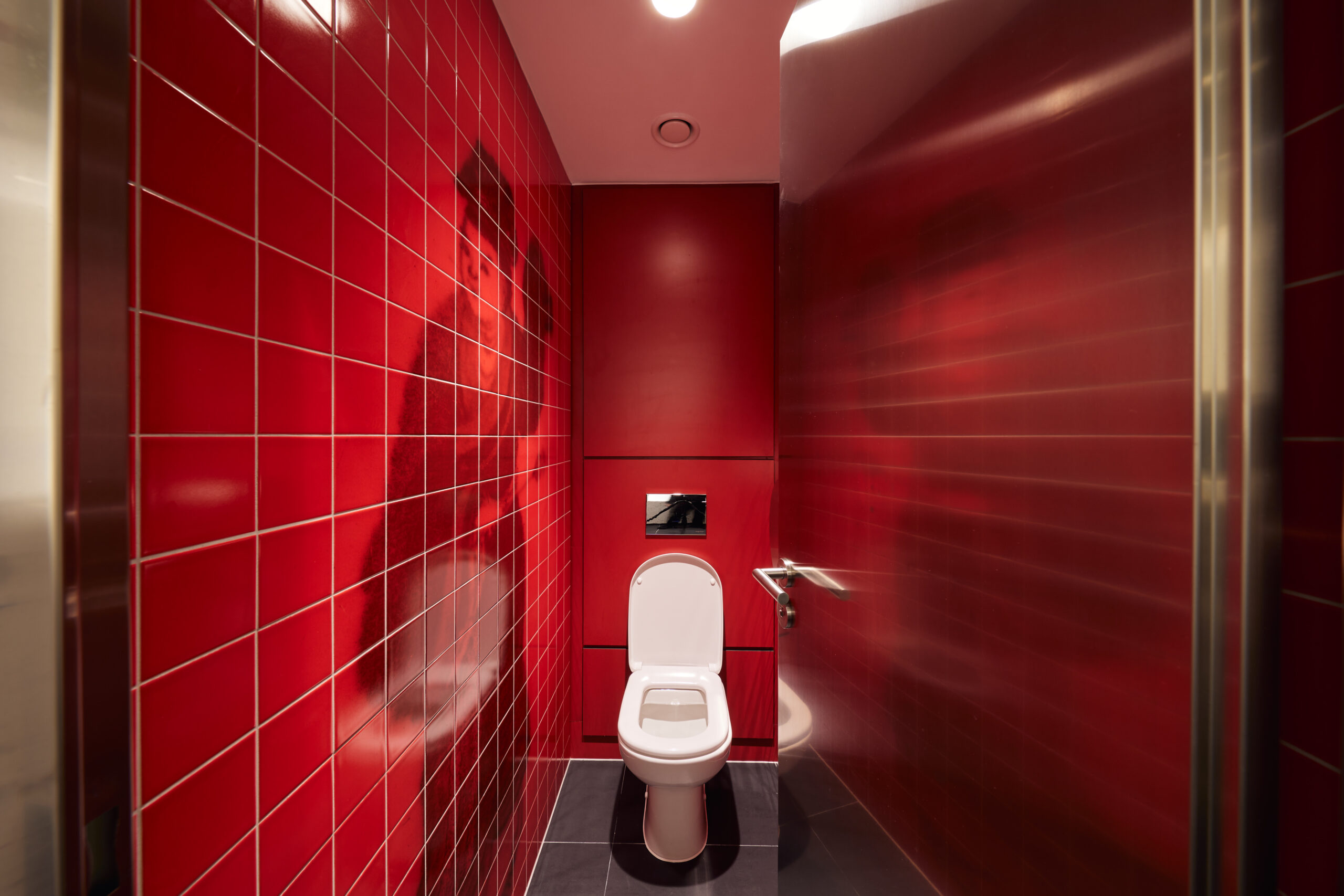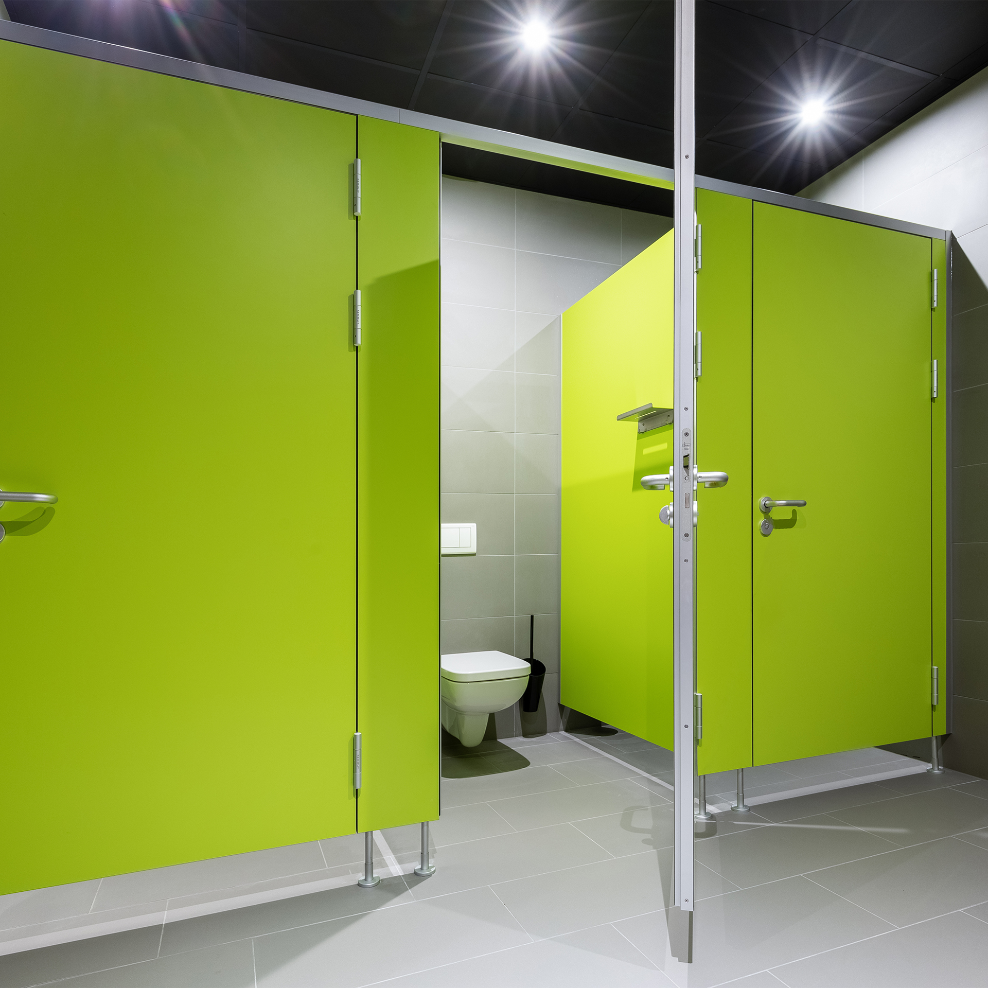 WC-Trennwandsystem aus 42 mm HPL-Verbundkonstruktion mit hoher Verwindungssteifheit, edlem Design und maximaler Beständigkeit für den Einsatz im Nassraum.