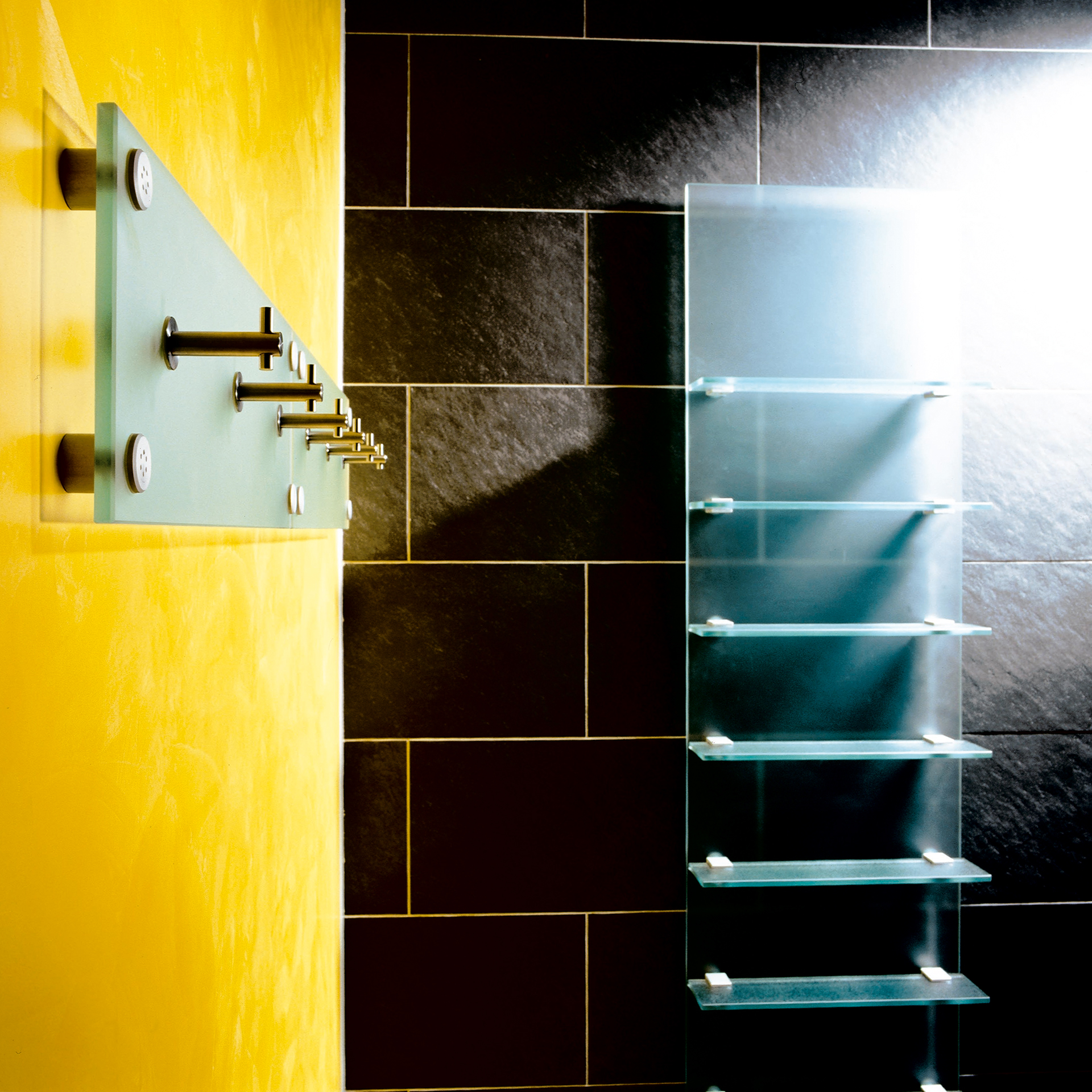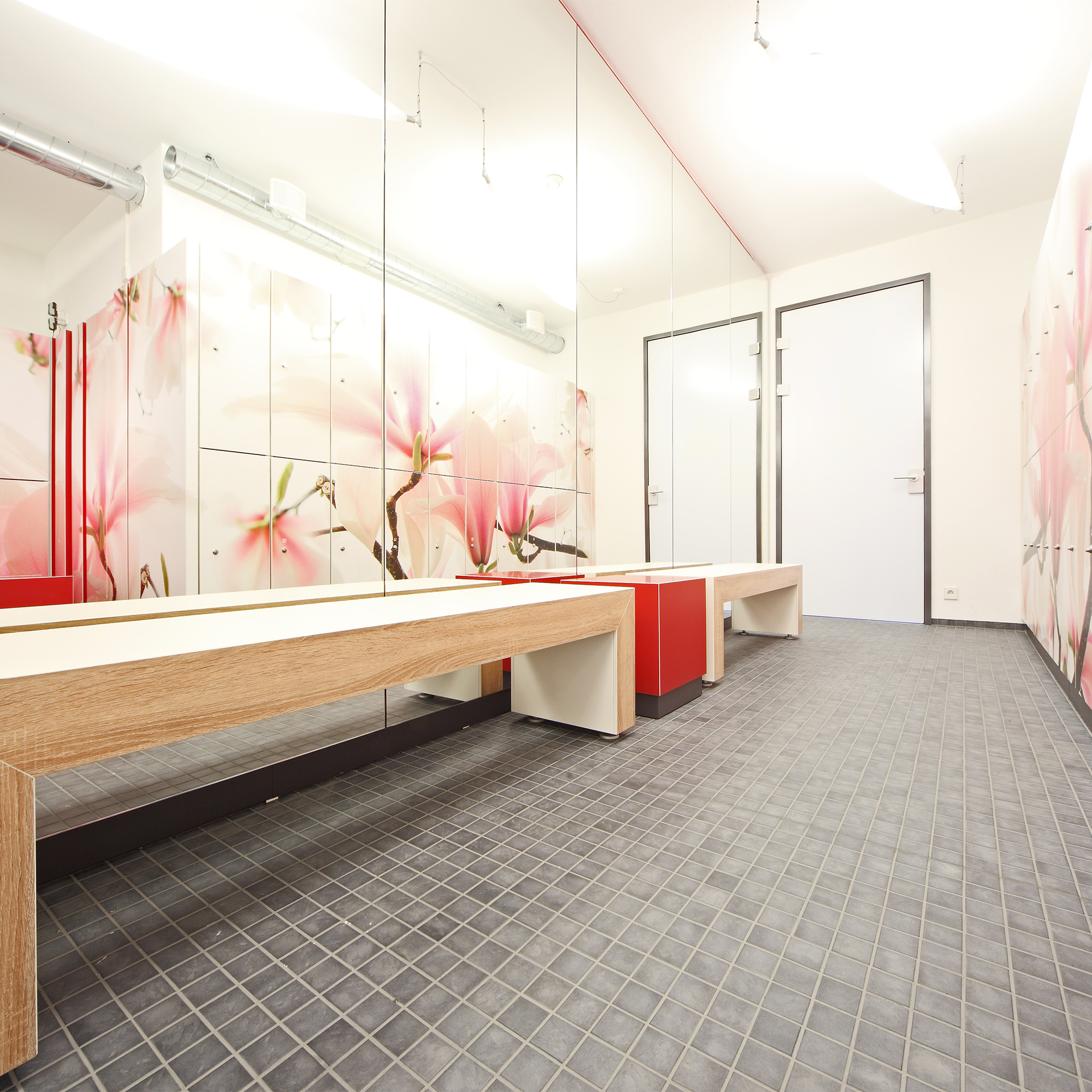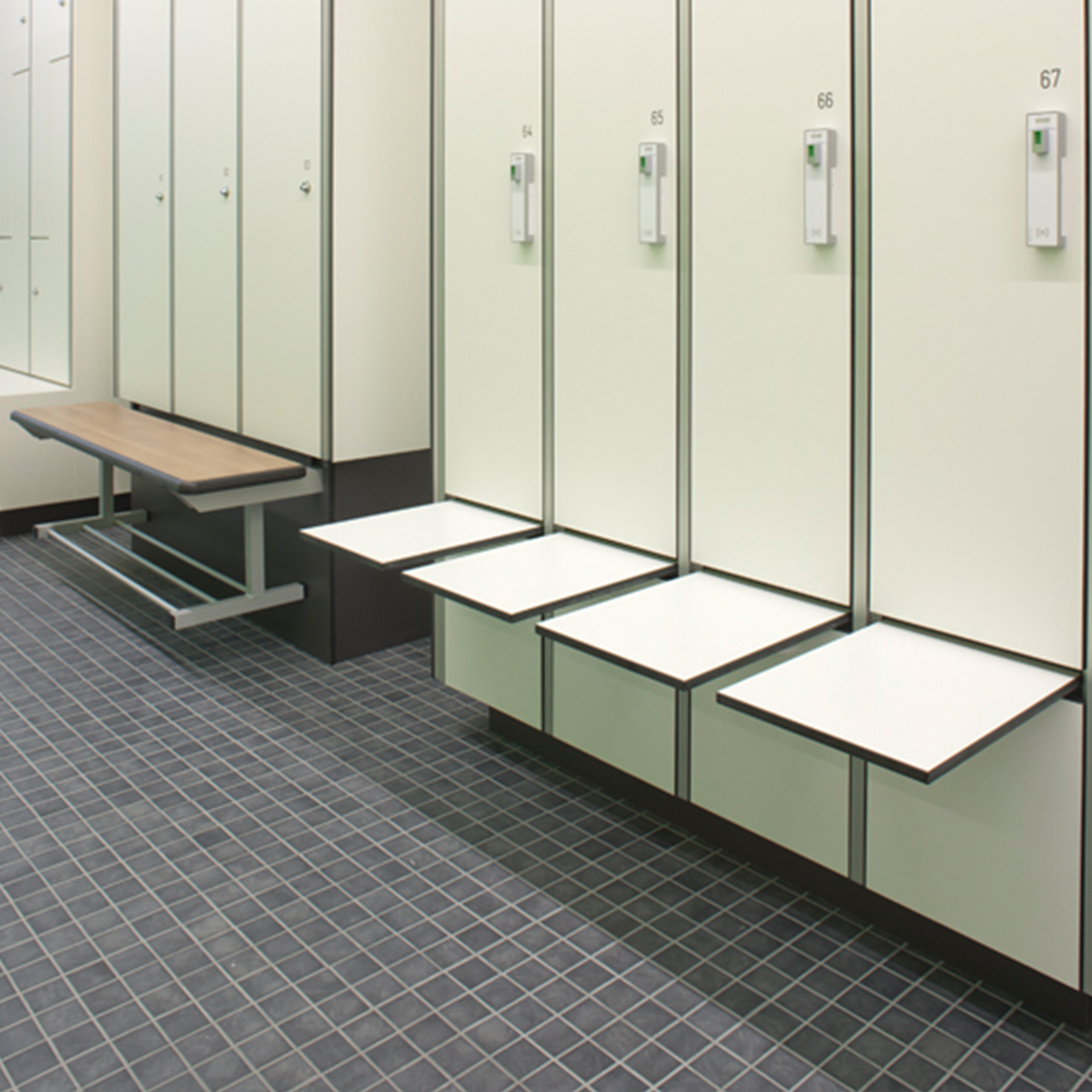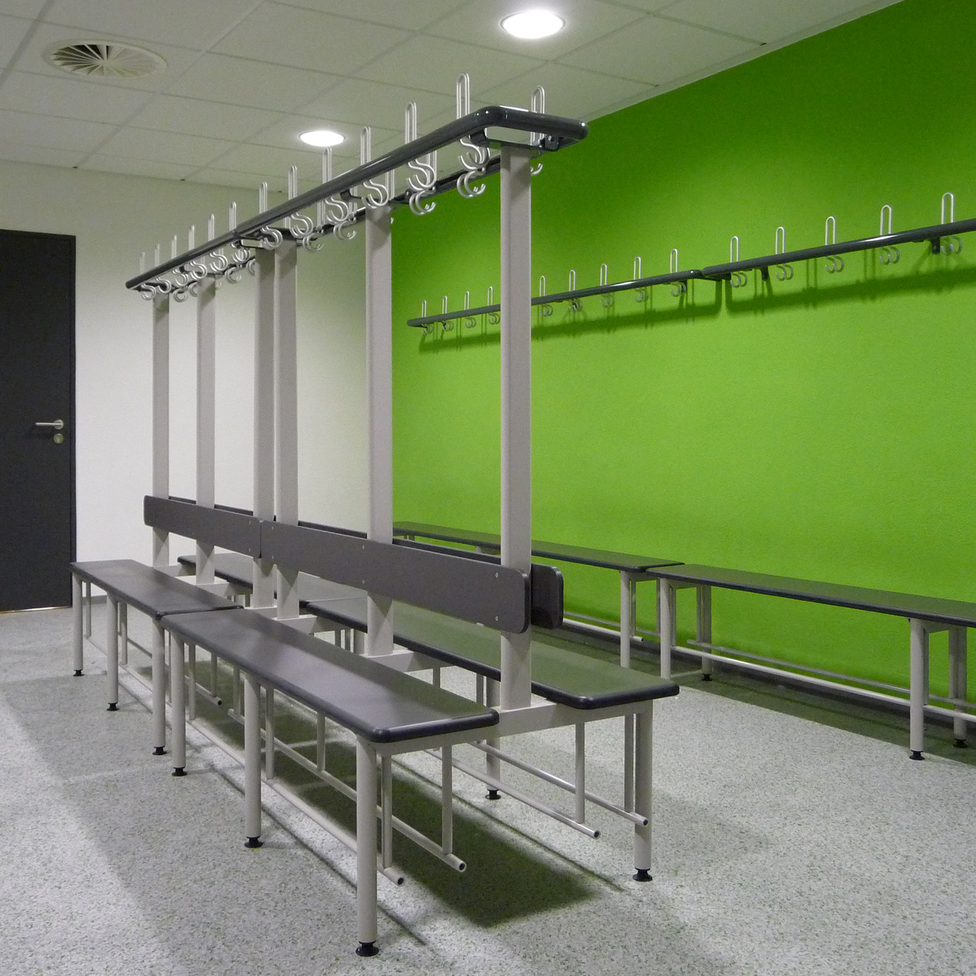 Sitzgelegenheiten, Ablagen und Regale für Sanitär- und Umkleidebereiche.