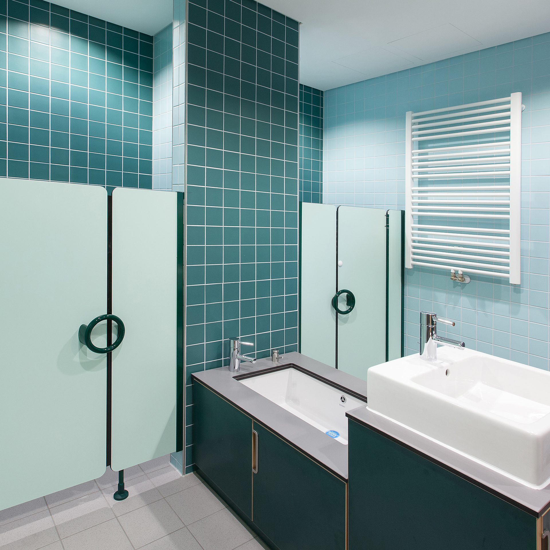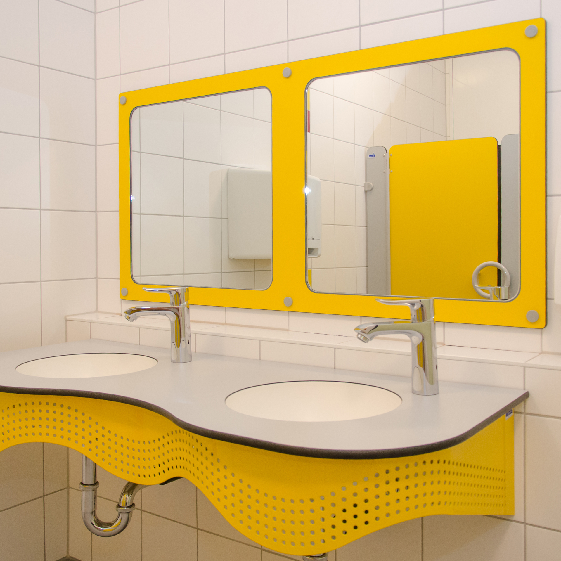 Hochwertige Waschplatzanlagen aus 13 mm HPL mit fugenlos integrierten Mineralwerkstoff-Becken, sicher abgerundeten Kanten und individuellen Anpassungsmöglichkeiten für moderne Sanitär- und Hygienebereiche.