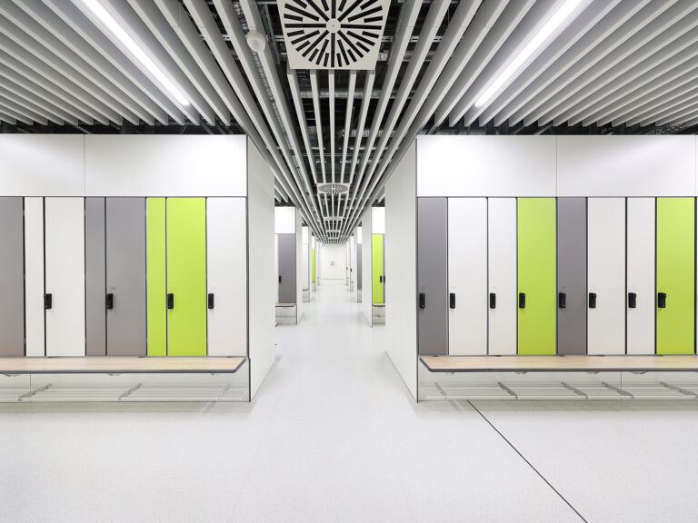 Zusätzlich wurden Typo S Schränke aus Stahl mit Korpusfarbe Lagunweiß und HPL-Türen installiert. Der formschlüssige Metallkorpus bietet hohe Stabilität und Langlebigkeit und ergänzt die Umkleidebereiche durch geordnete Aufbewahrungsmöglichkeiten.