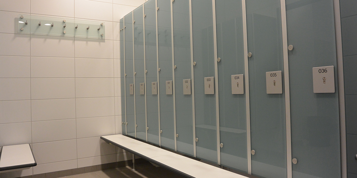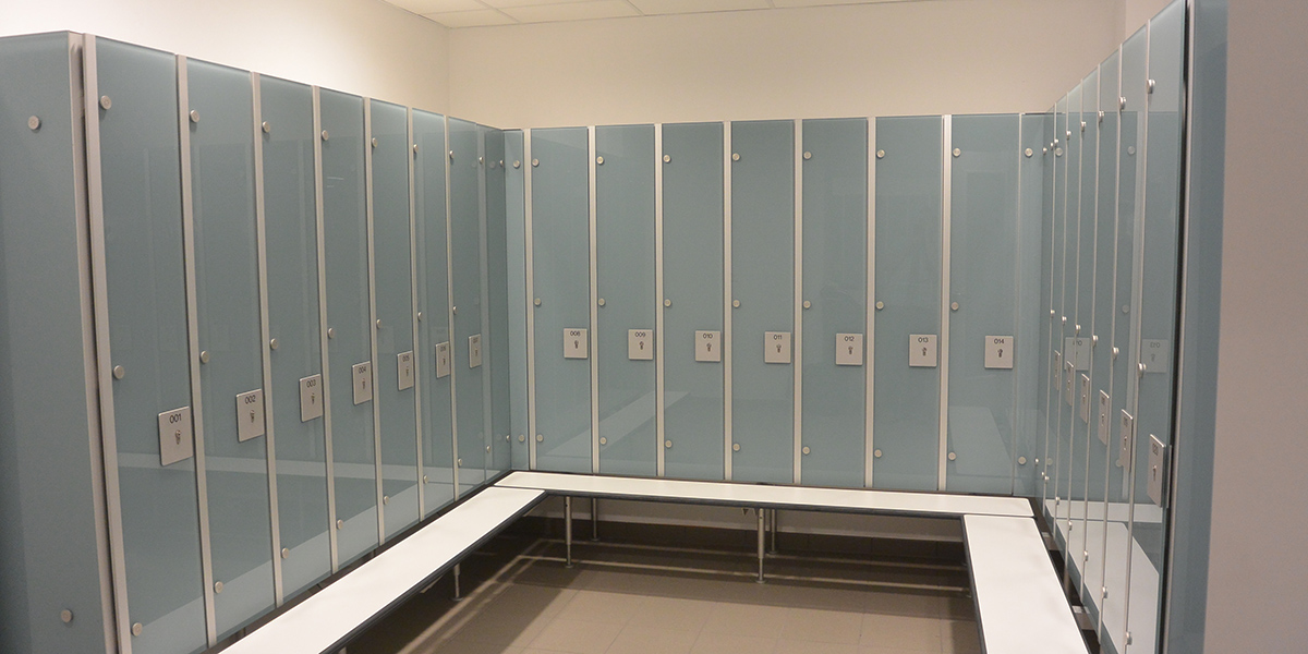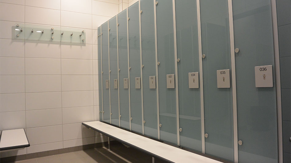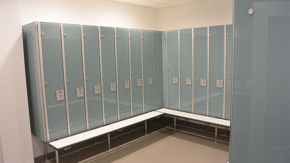 Ergänzend wurde das Schranksystem IXOS P in hellblau 5203 mit vorgebauter Sitzbank in kristallweiß 9108 eingebaut. Die Schränke sind mit nummerierten Aluminiumtafeln versehen und bieten eine übersichtliche Ordnungslösung. Eine Hakenleiste aus Glas mit Edelstahlhaken rundet die Ausstattung ab und ermöglicht eine praktische Nutzung im Arbeitsumfeld.