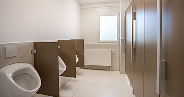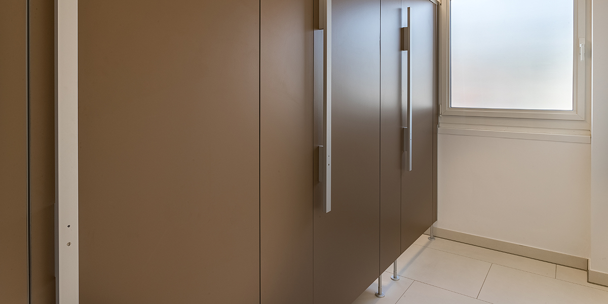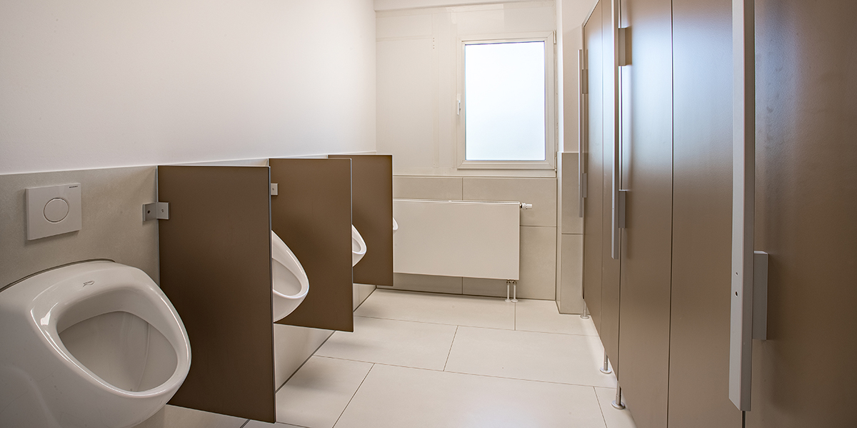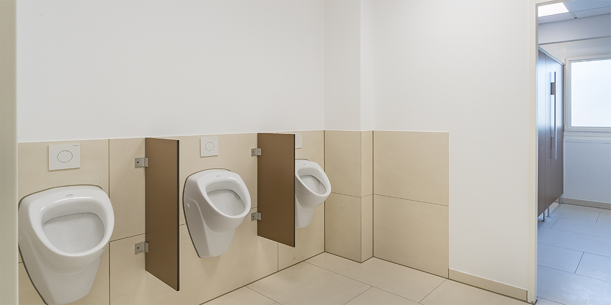 Die raumhoch geschlossene Ausführung bietet höchste Privatsphäre und eine moderne, elegante Optik. Die robuste Konstruktion mit massiven Drei-Rollen-Kantenbändern und Edelstahlachsen sorgt auch bei starker Beanspruchung für dauerhafte Funktionalität. Das wasserfeste HPL-Material ist leicht zu reinigen und ideal für den Einsatz in Nassräumen geeignet. Durch die Kombination aus Ästhetik, Sicherheit und Funktionalität entsteht ein langlebiges WC-Trennwandsystem, das den hohen Anforderungen des Objekts optimal entspricht.
