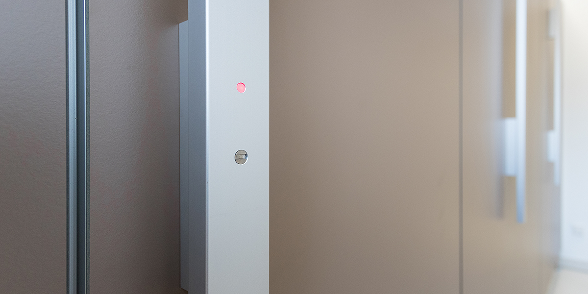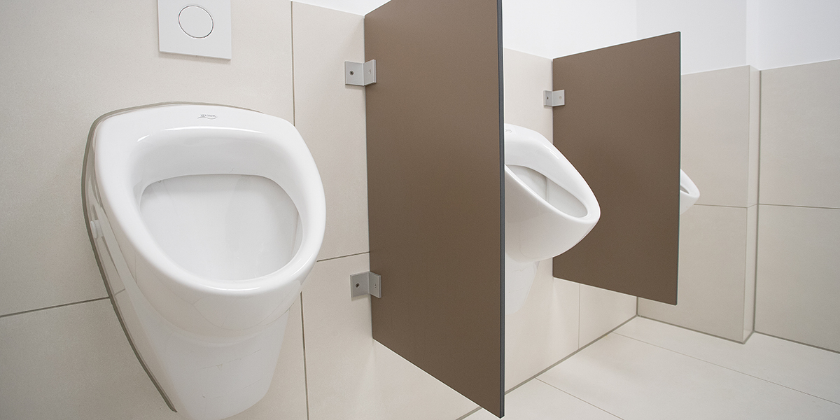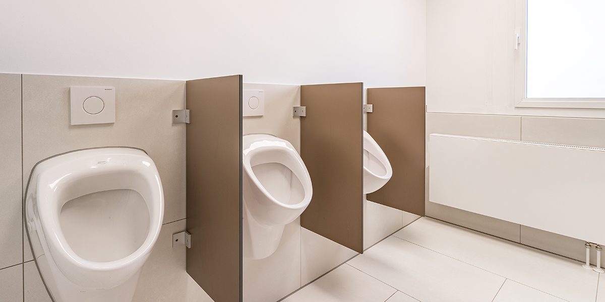 Im Objekt Berliner Glas in Berlin wurde das WC-Trennwandsystem PRIMO Kn in der Farbe Buranobraun 8617 eingesetzt. Die Trennwände bestehen aus 42 mm starken HPL-Verbundelementen mit einem glattflächigen Aluminiumrahmen und innenliegender PU-Verstärkung, was maximale Verwindungssteifheit, Stabilität und Langlebigkeit gewährleistet. Profile, Bänder und Füße wurden aus eloxiertem Aluminium realisiert, ergänzt durch eine Griffstange GS 40 mit 1165 mm Länge ebenfalls aus eloxiertem Aluminium.