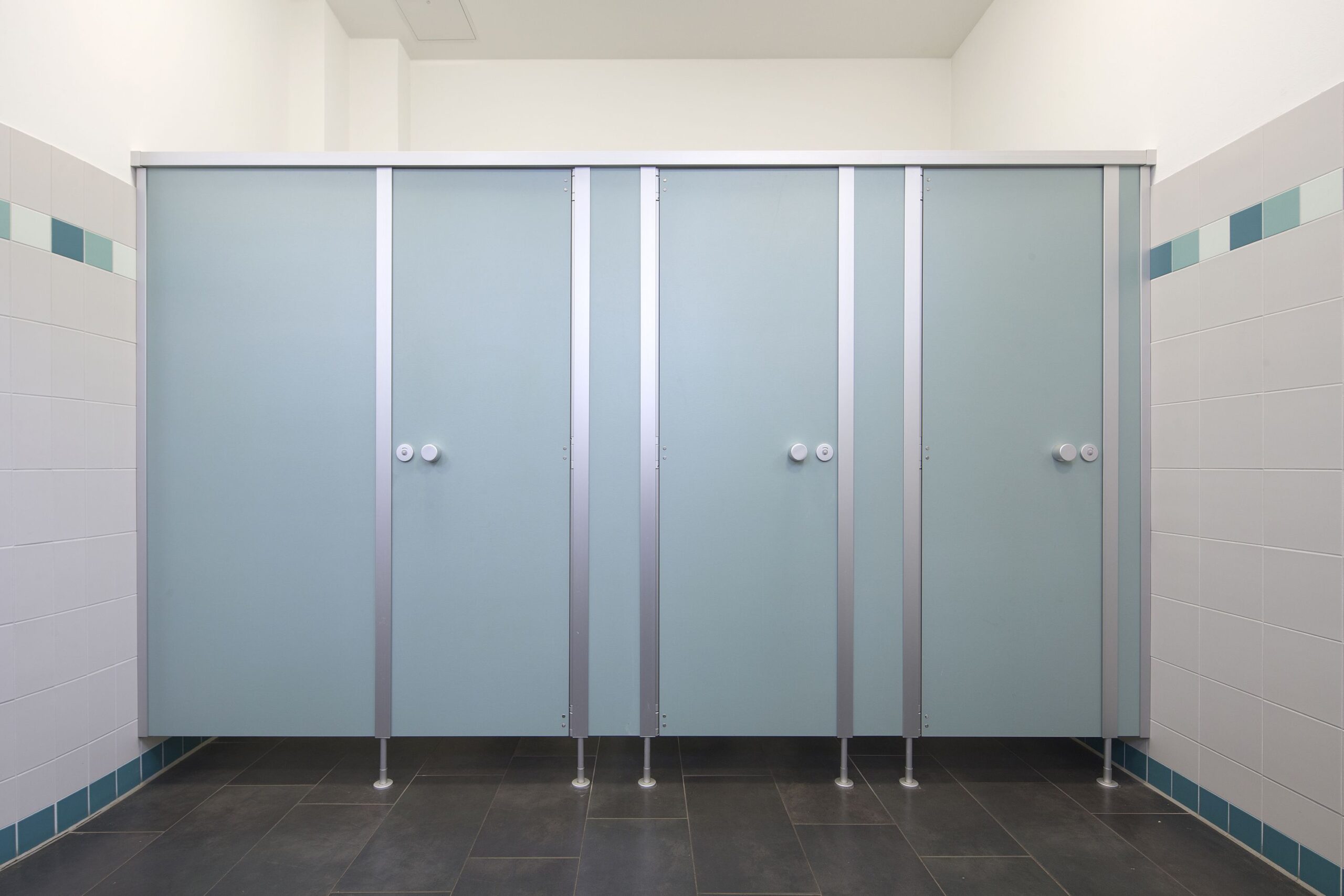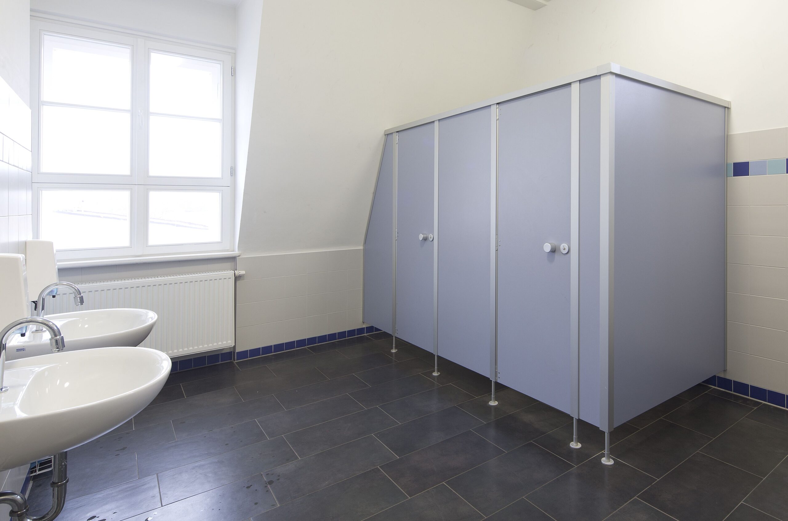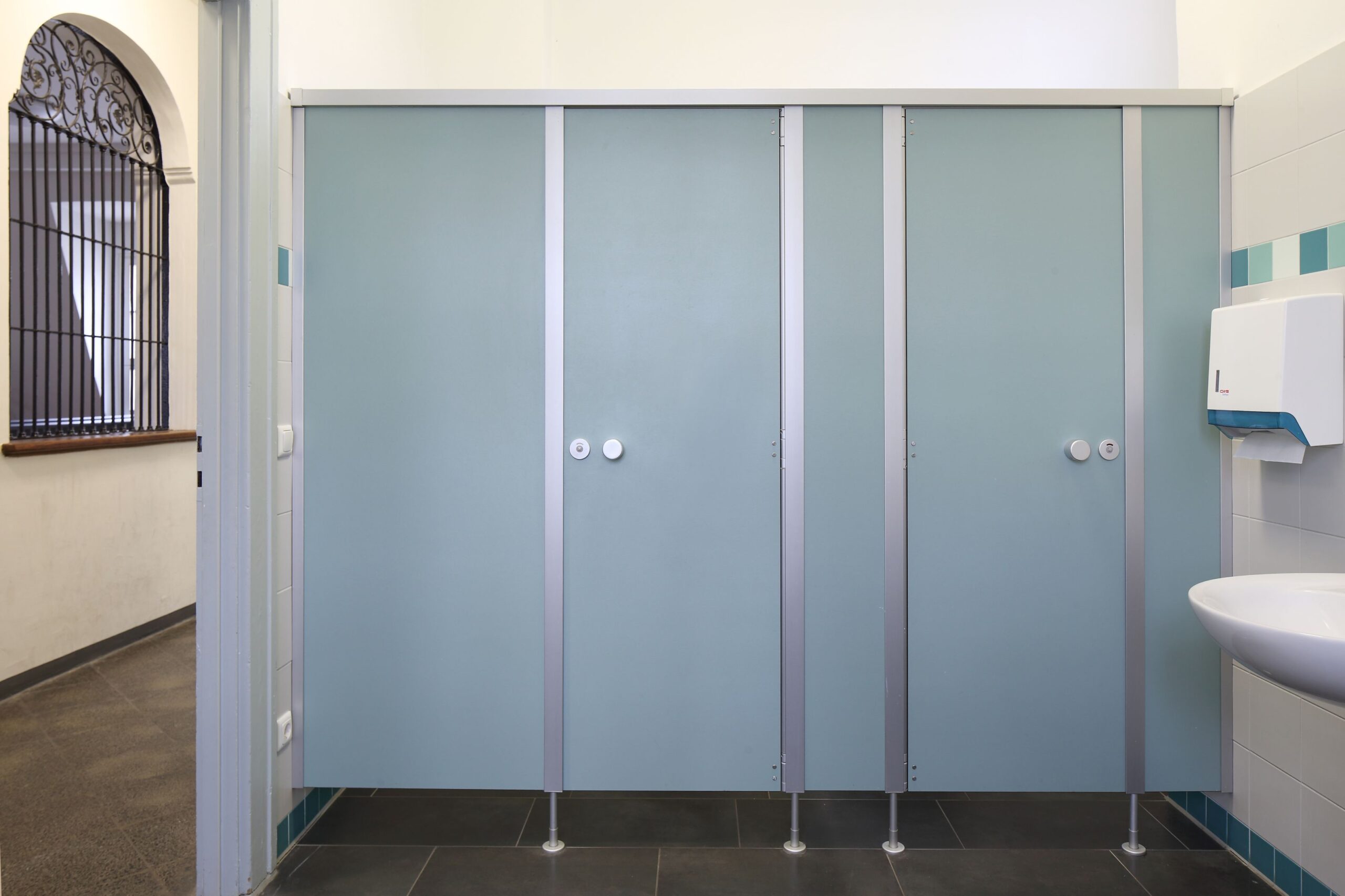 Für dieses Projekt kam das hochwertige WC-Trennwandsystem cronus von KEMMLIT zum Einsatz. Die Anlage überzeugt durch ihre lichtgrünen und lichtblauen Fronten, die dem Raum ein modernes und freundliches Erscheinungsbild verleihen.