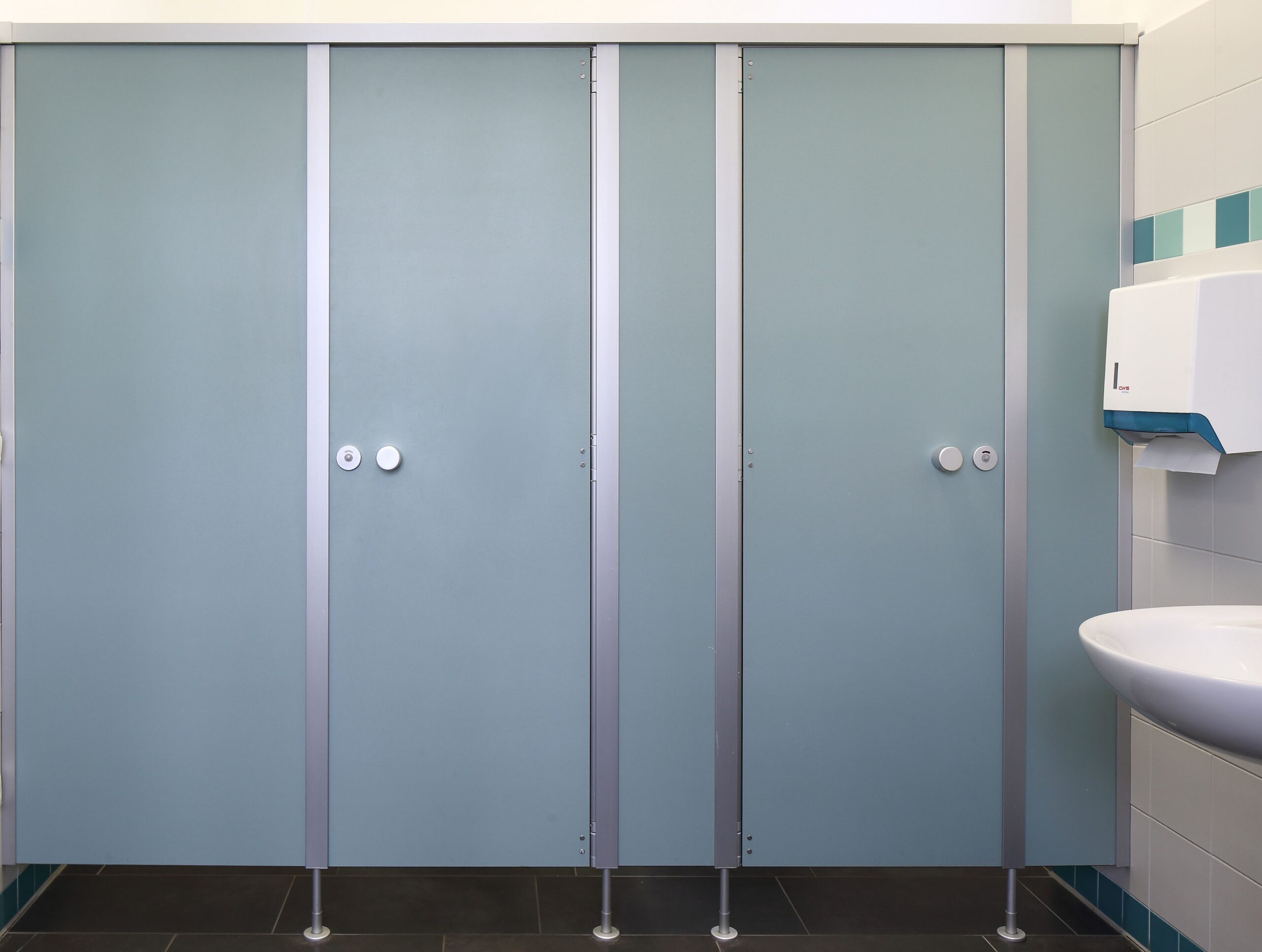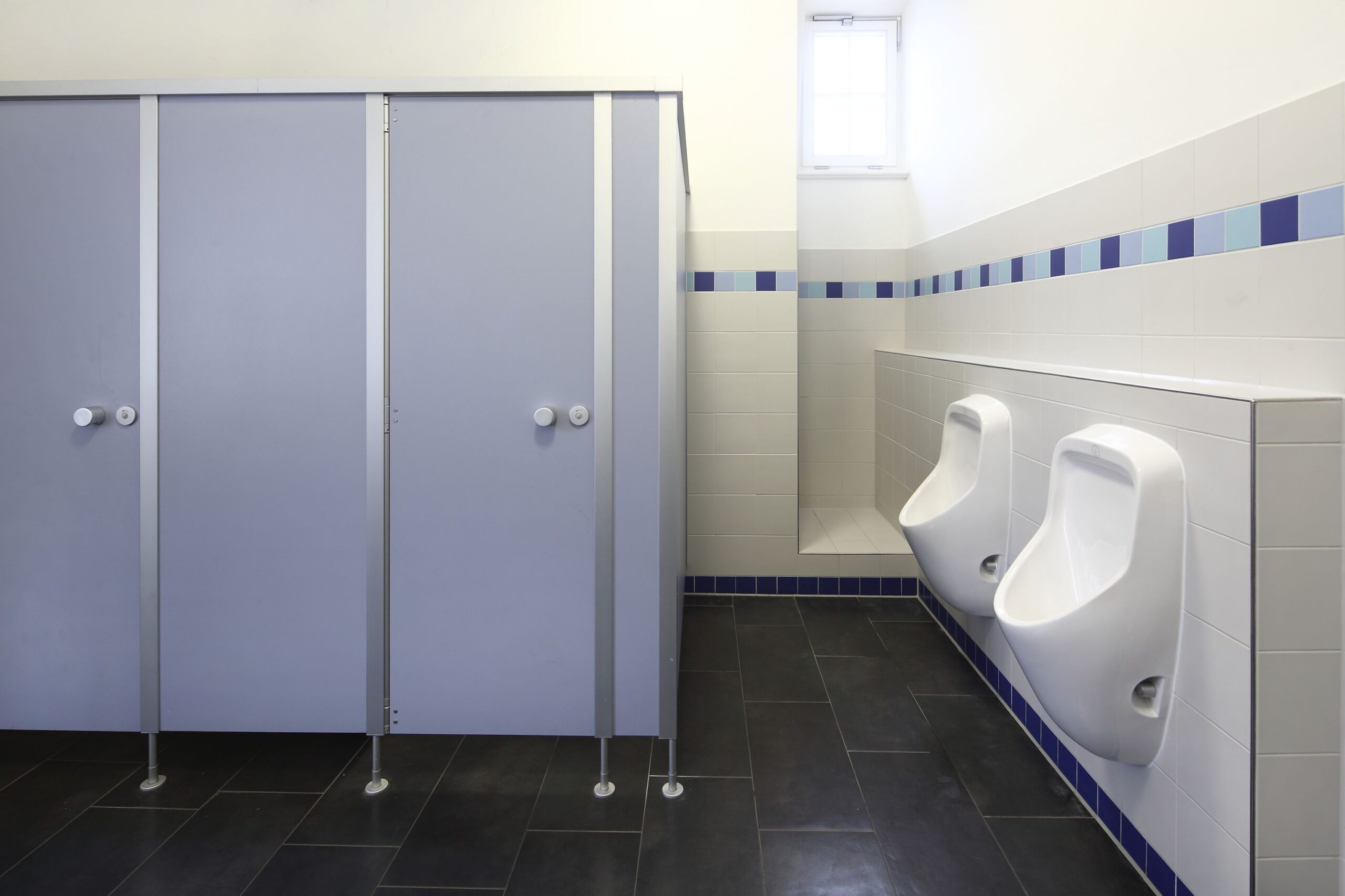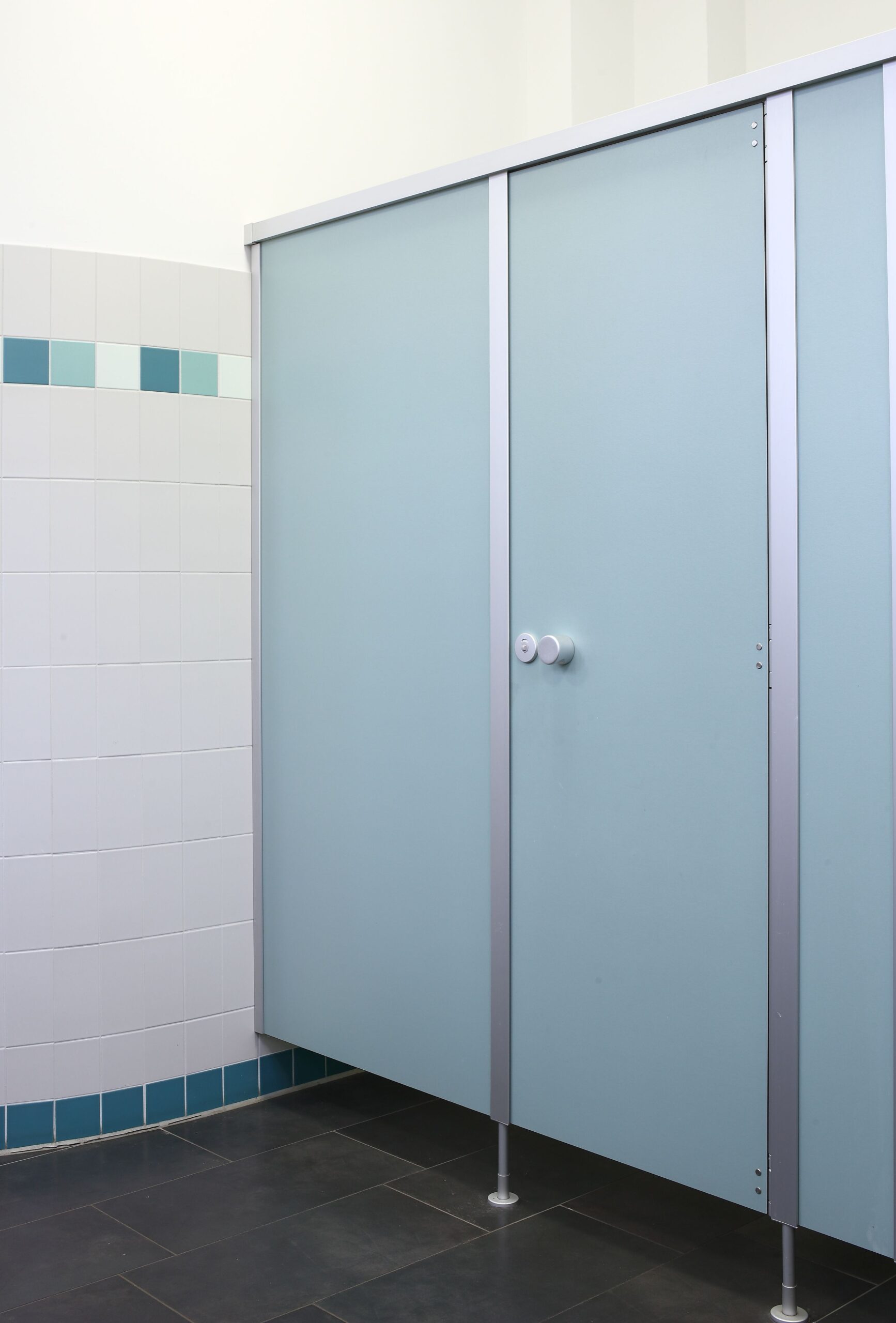 Für dieses Projekt kam das hochwertige WC-Trennwandsystem cronus von KEMMLIT zum Einsatz. Die Anlage überzeugt durch ihre lichtgrünen und lichtblauen Fronten, die dem Raum ein modernes und freundliches Erscheinungsbild verleihen.