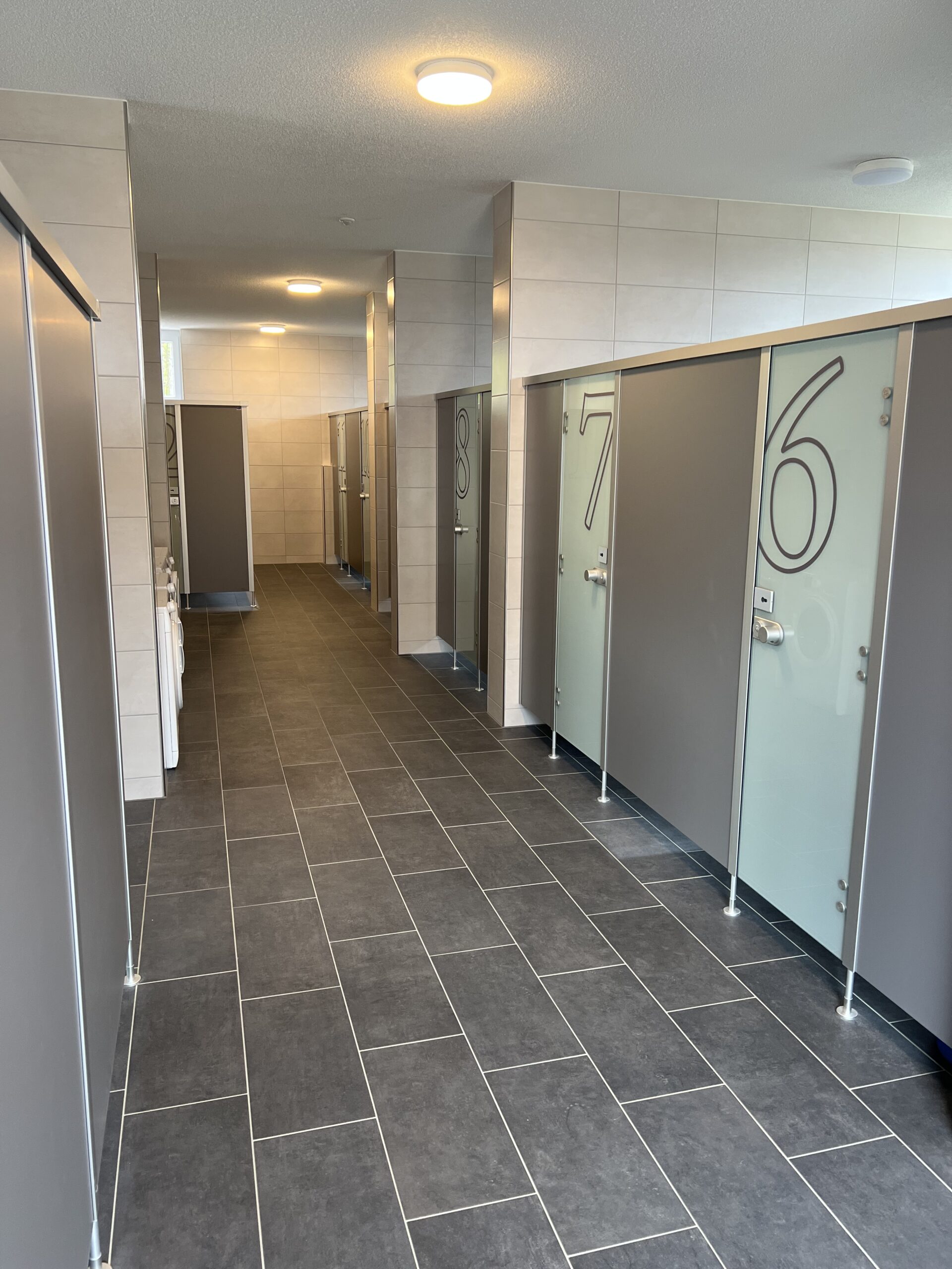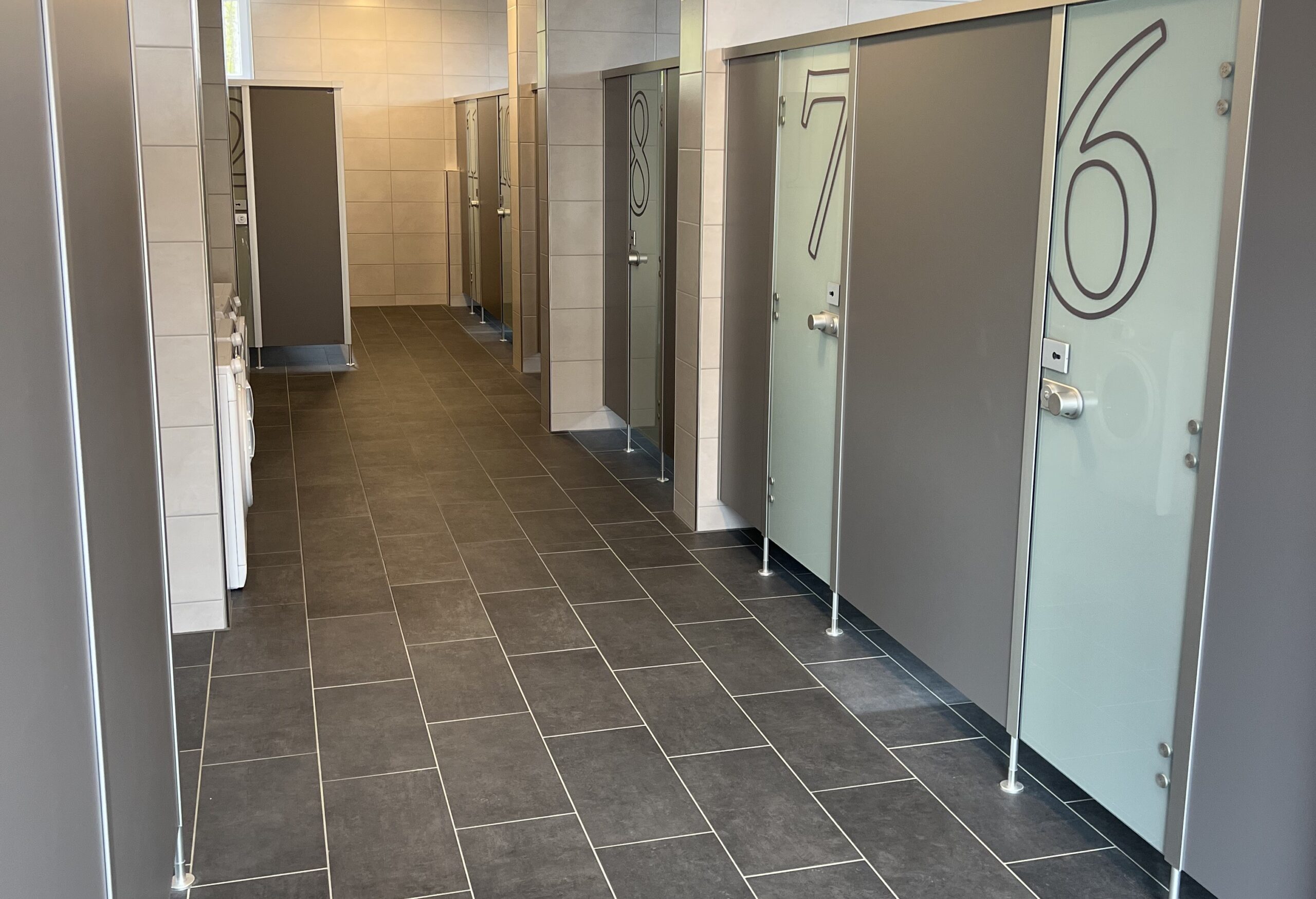 Die WC-Bereiche im Camping- und Ferienpark Orsingen wurden mit dem WC-Trennwandsystem cronus Glas ausgestattet. Die Anlagen in 7708 Quarzgrau bestehen aus 12 mm ESG bei Vorderfront- und Seitenwänden sowie 8 mm ESG bei Zwischenwänden und Türen. Die tragende Konstruktion aus eloxierten Aluminiumprofilen sorgt für Stabilität, Langlebigkeit und Eignung für den Nassraumeinsatz.