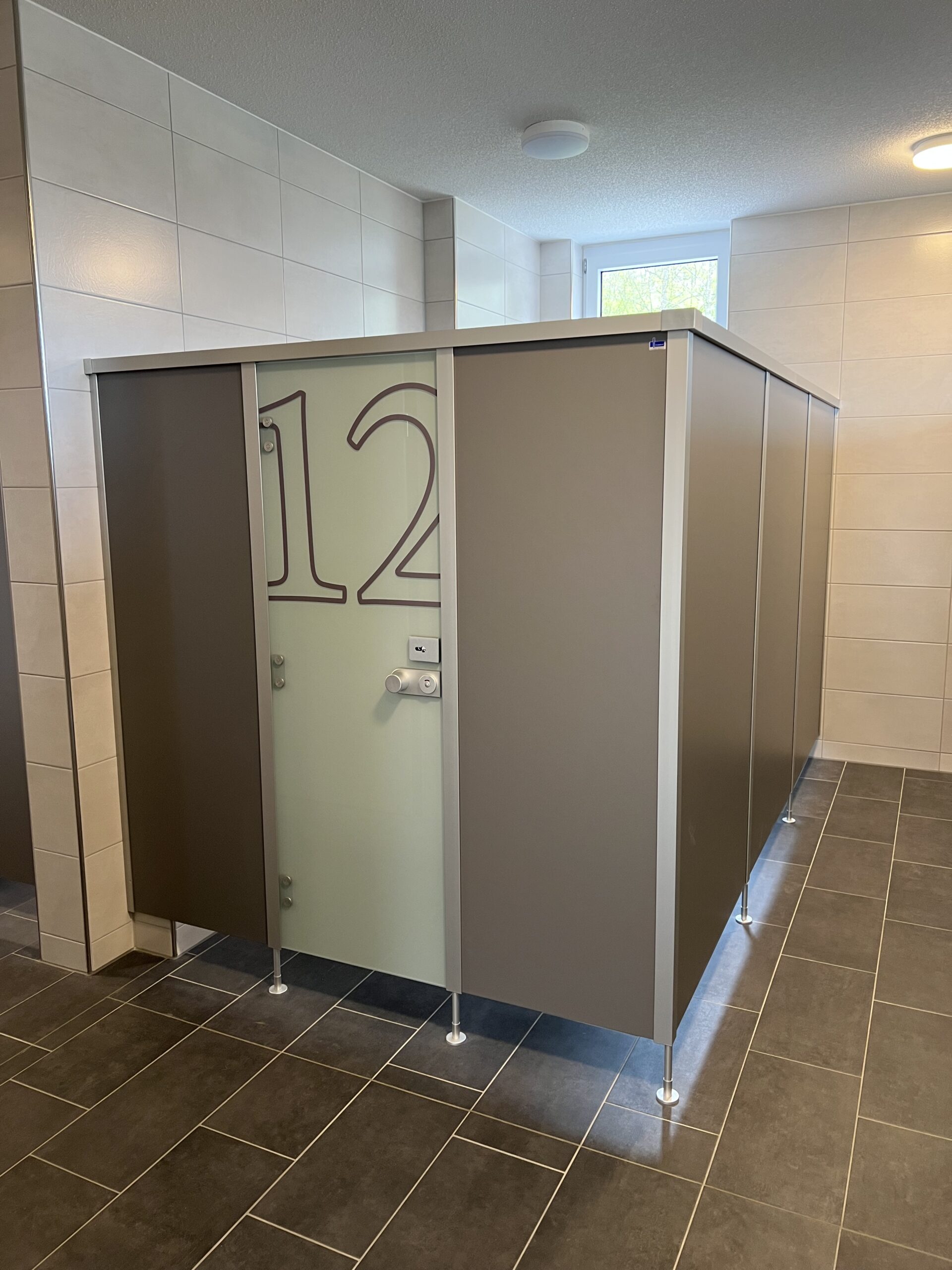 Die Glaslösung ist flexibel ausführbar und ermöglicht individuelle WC-Kabinen und Wechselkabinen. Auf Wunsch kann das System auch mit HPL-Elementen kombiniert werden.