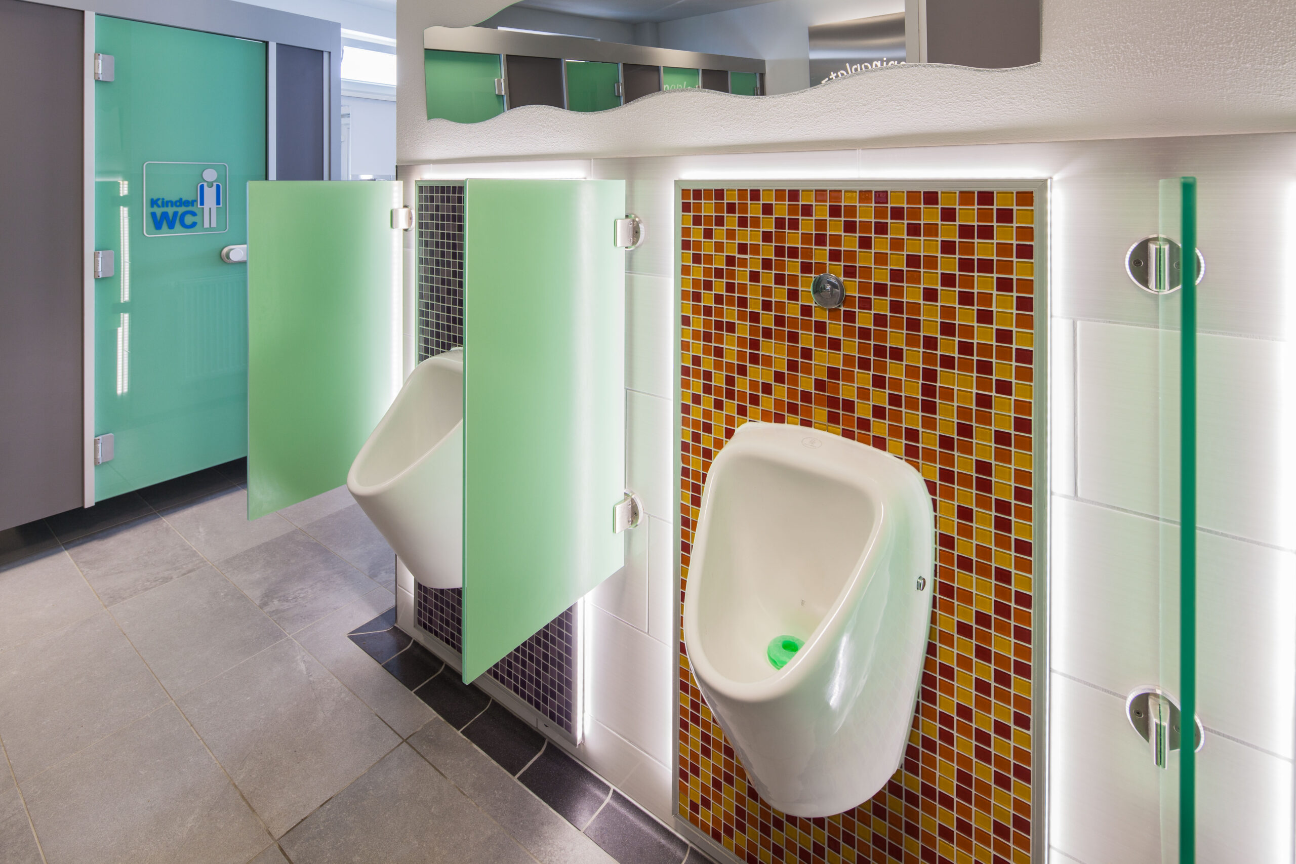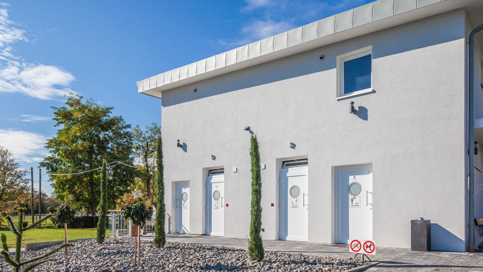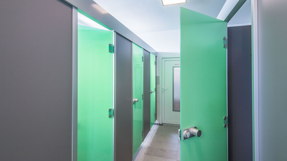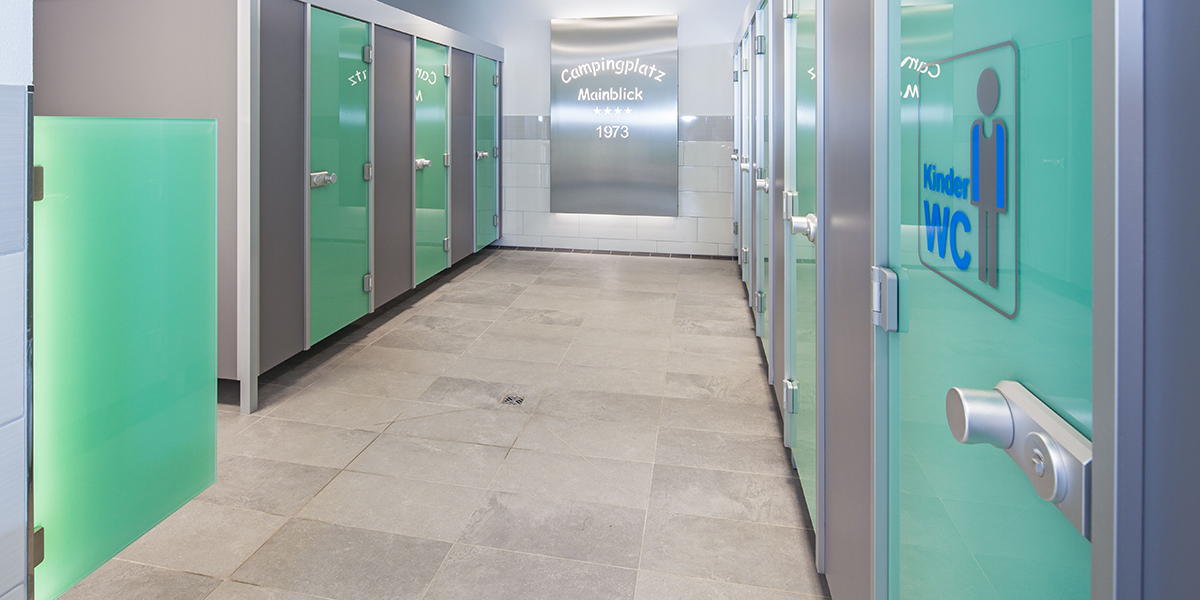 Auf dem Campingplatz Mainblick in Schwarzenau wurde der Sanitärbereich mit dem modernen WC-Trennwandsystem cronus von KEMMLIT ausgestattet. In der hängenden Ausführung überzeugt das System durch seine besonders reinigungsfreundliche und elegante Gestaltung, da auf Bodenstützen verzichtet wird und so ein offenes, leichtes Raumgefühl entsteht.