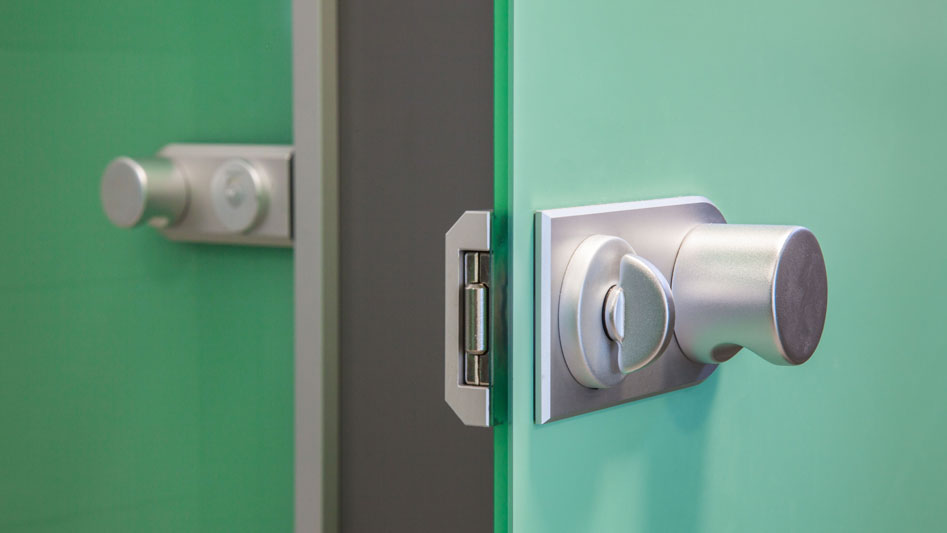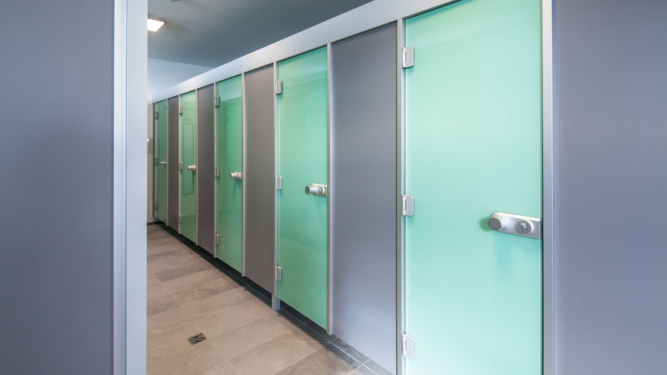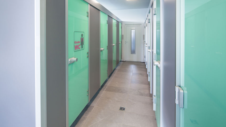 Die Wände in quarzgrau harmonieren perfekt mit den Türen aus 8 mm starkem ESG-Glas in Weißgrün, die dem Raum eine frische, freundliche Atmosphäre verleihen. Bänder, Garnituren und Träger aus eloxiertem Aluminium sorgen nicht nur für Stabilität, sondern auch für eine hochwertige Optik und Langlebigkeit – ideal für den anspruchsvollen Einsatz auf Campingplätzen.