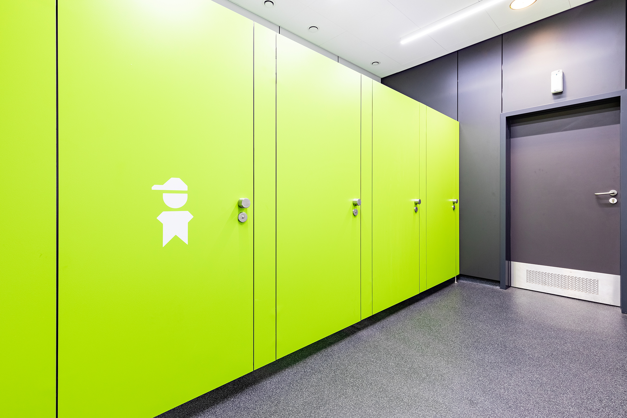 Die Anlage wurde als schwebende Ausführung realisiert. Diese Konstruktionsweise ohne vordere Stützfüße erleichtert die effiziente Bodenreinigung erheblich – ein entscheidender Vorteil für hygienisch sensible Bereiche. Die 42 mm starken Verbundelemente bieten zudem maximale Stabilität.
