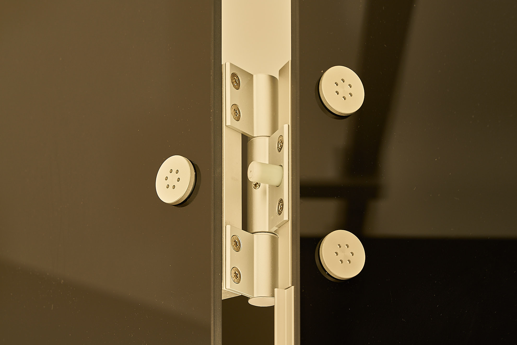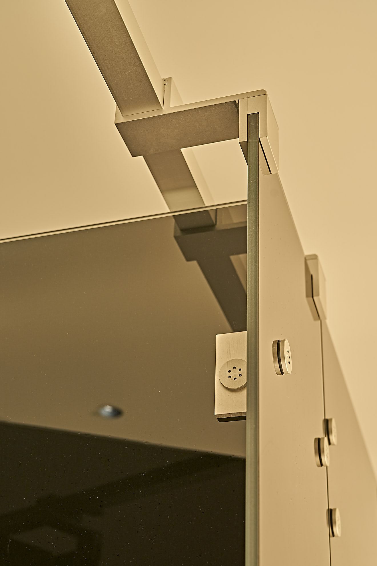 Ein weiteres Highlight für den Gästekomfort ist die innovative Softclose-Funktion: Die speziell entwickelten Bänder sorgen dafür, dass die Glastüren sanft, sicher und geräuschlos schließen. Garnituren und Verbindungselemente aus eloxiertem Aluminium runden das hochwertige Gesamtbild perfekt ab.