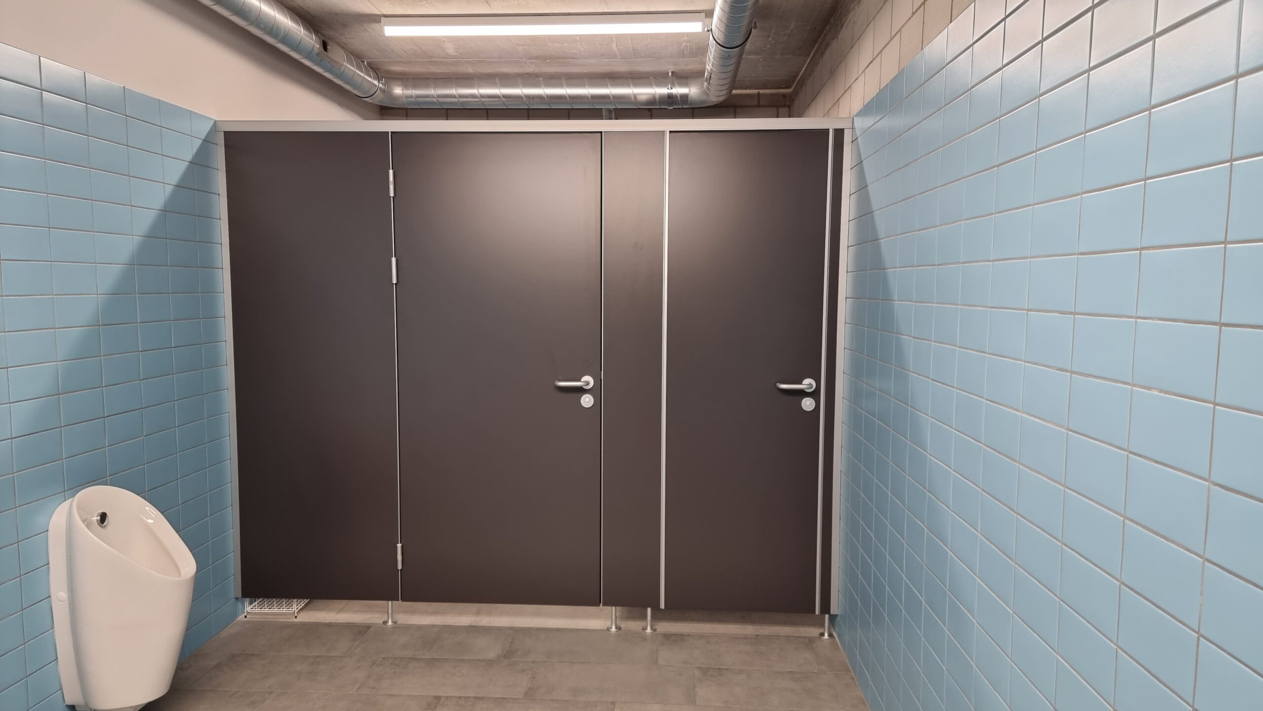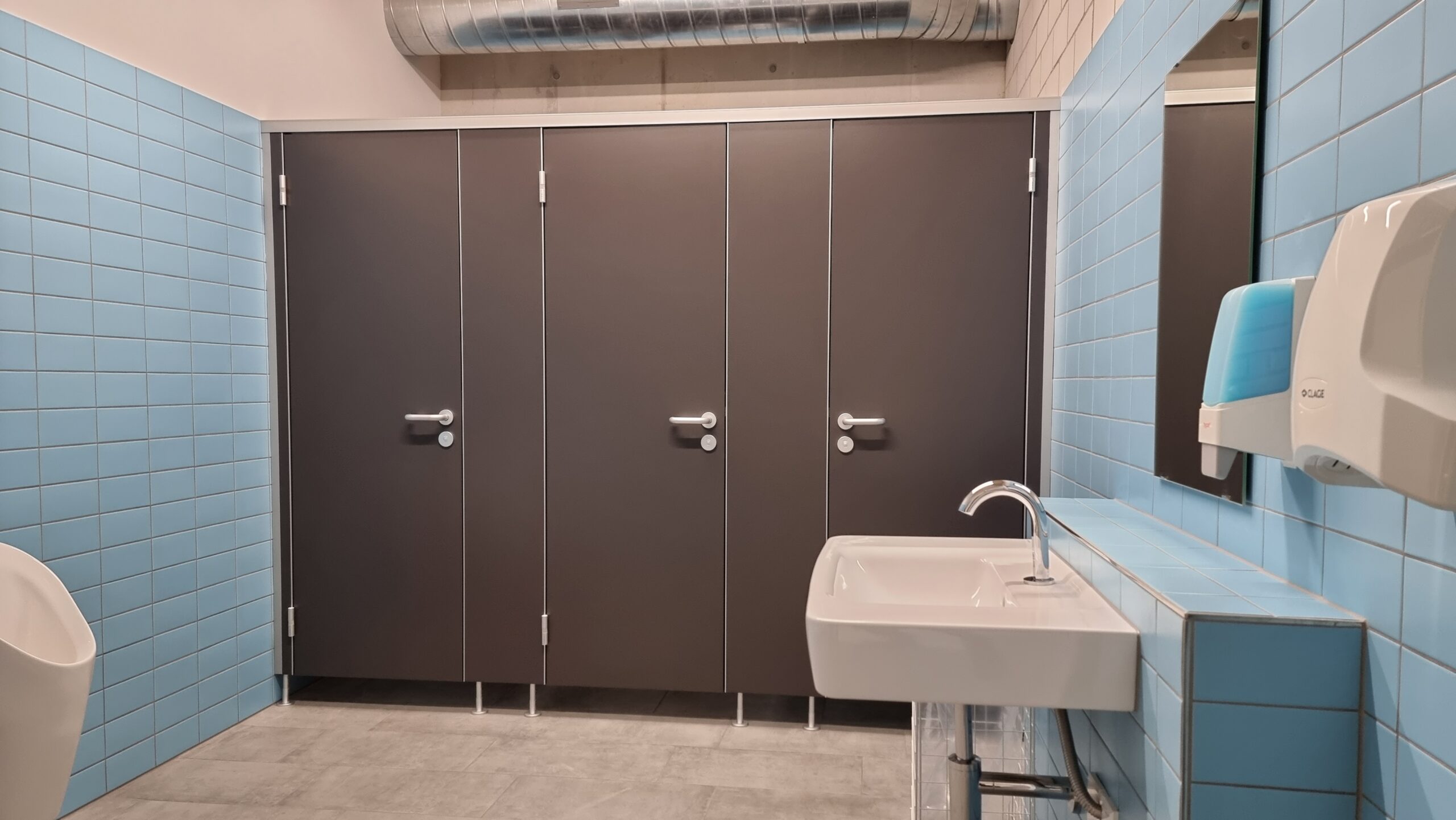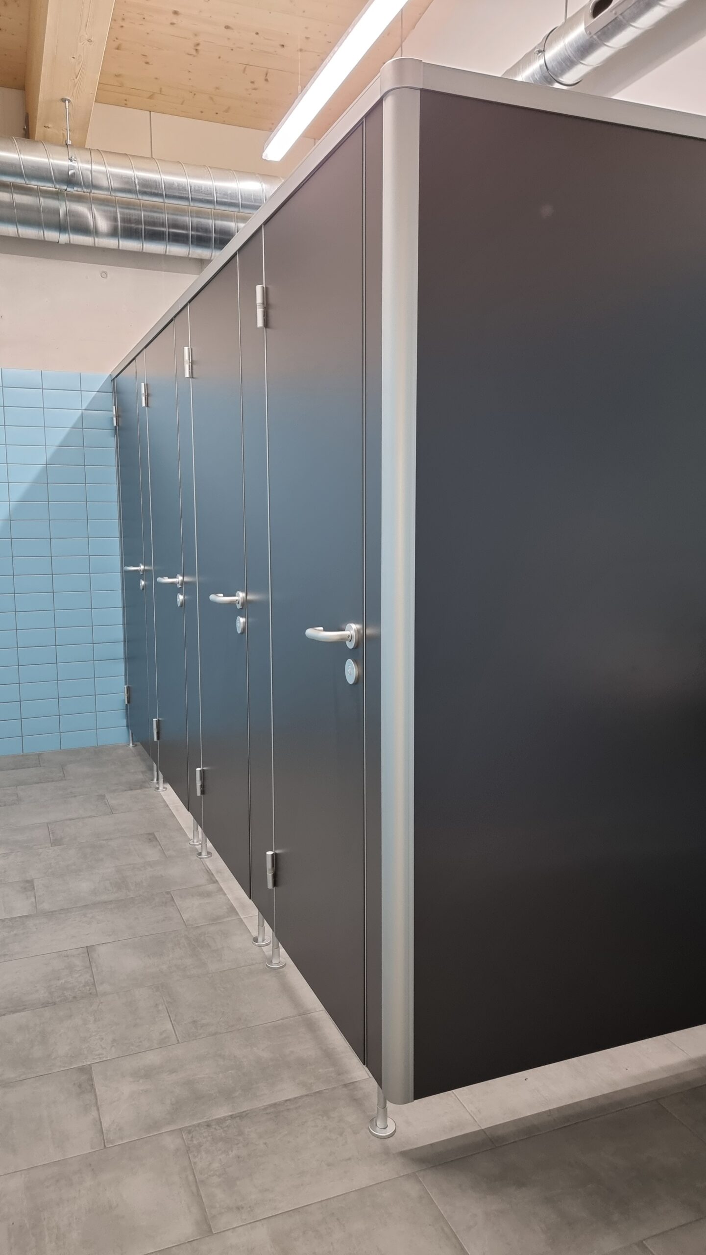 Ergänzend wurden Spritz- und Sichtschutzwände aus 13 mm starken HPL-Platten installiert, die zusätzlichen Schutz und Privatsphäre im Sanitärbereich bieten.