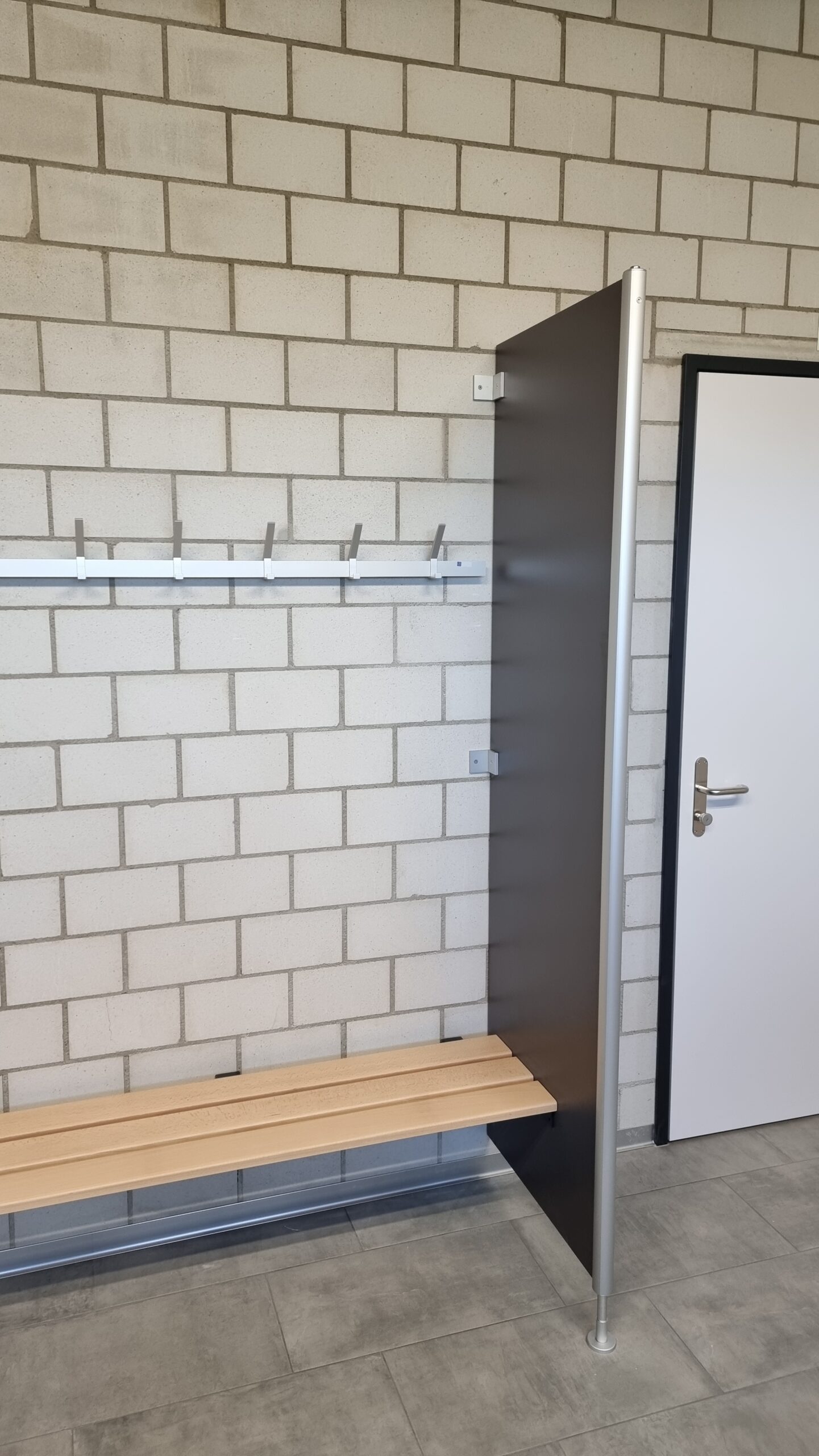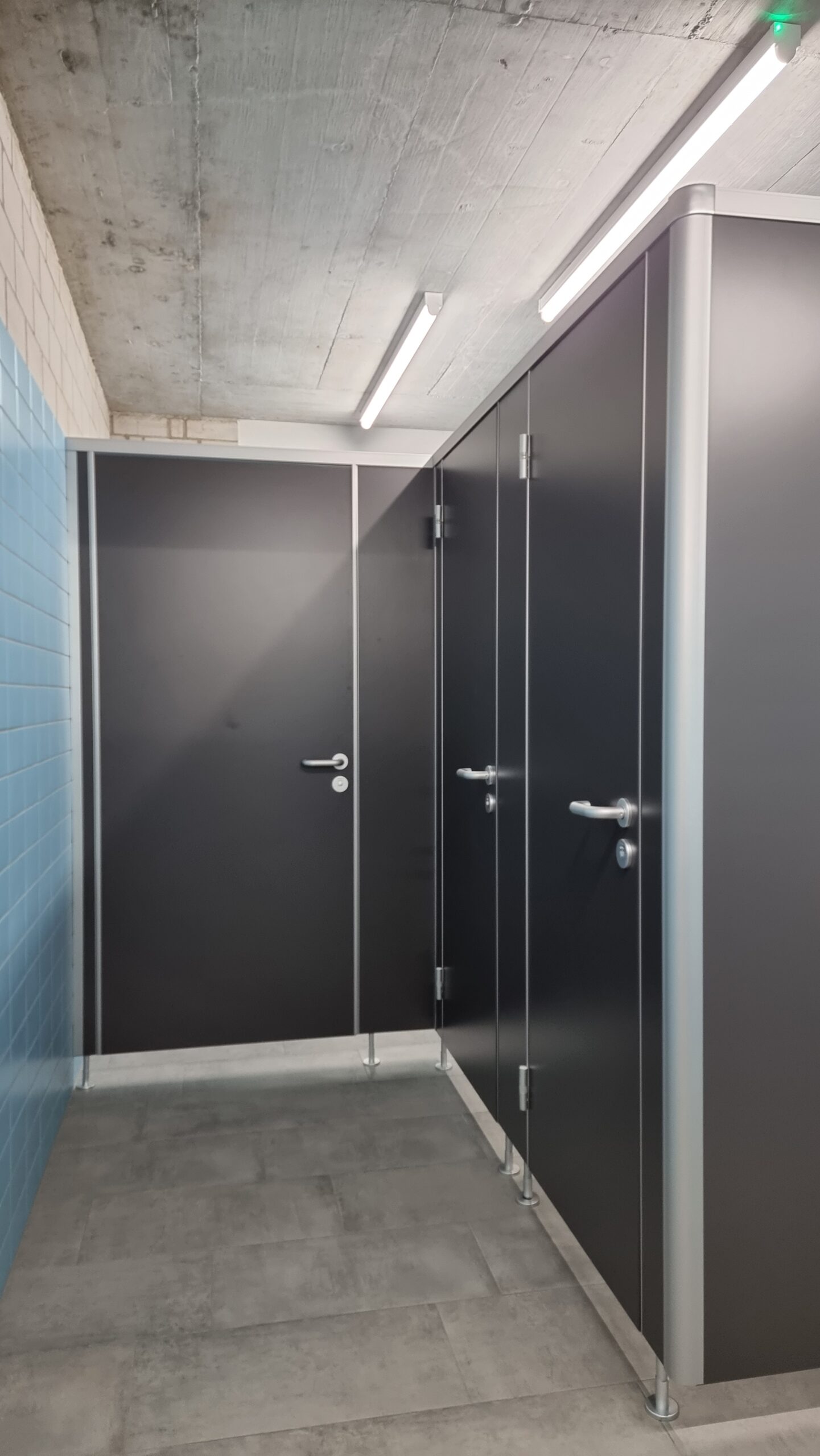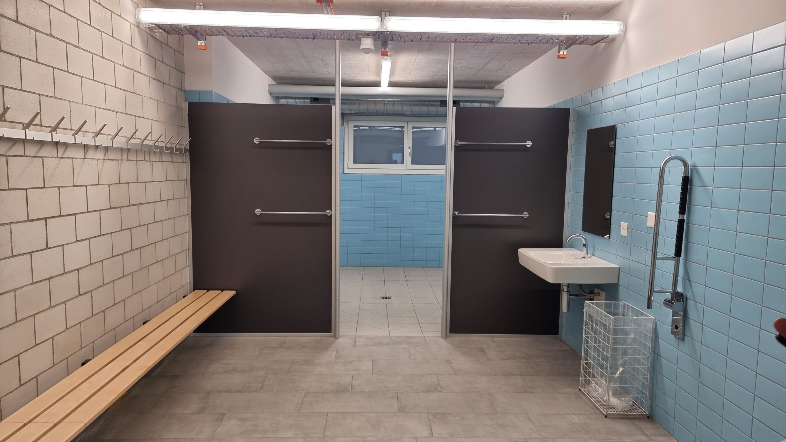 Ergänzend wurden Spritz- und Sichtschutzwände aus 13 mm starken HPL-Platten installiert, die zusätzlichen Schutz und Privatsphäre im Sanitärbereich bieten.