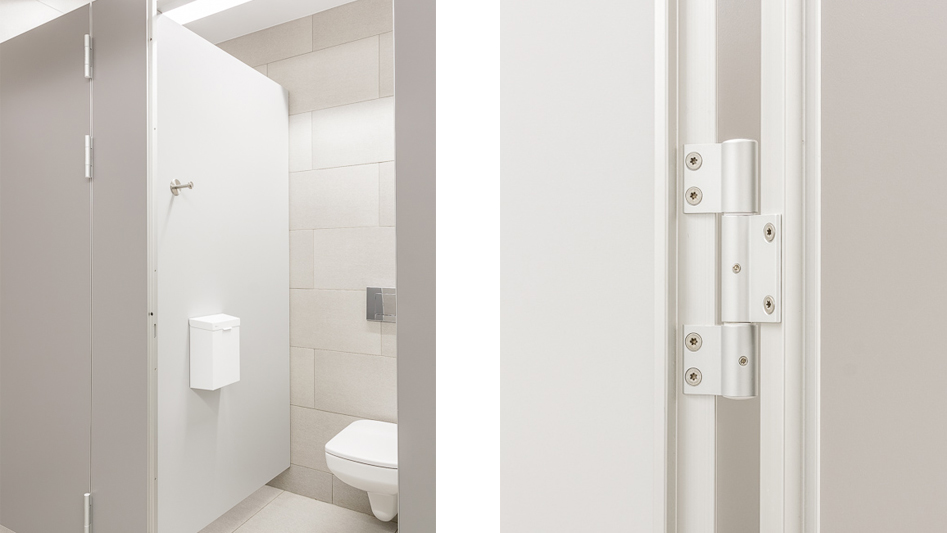 Ein besonderes Highlight ist die schwebende Ausführung: Füße und Stabilisator wurden bei dieser Anlage nach hinten zurückgesetzt und sind somit unsichtbar. Dies verleiht der Trennwand nicht nur eine exklusive Optik, sondern erleichtert auch die maschinelle Bodenreinigung erheblich, da keine störenden Stützen im Vorderbereich vorhanden sind.