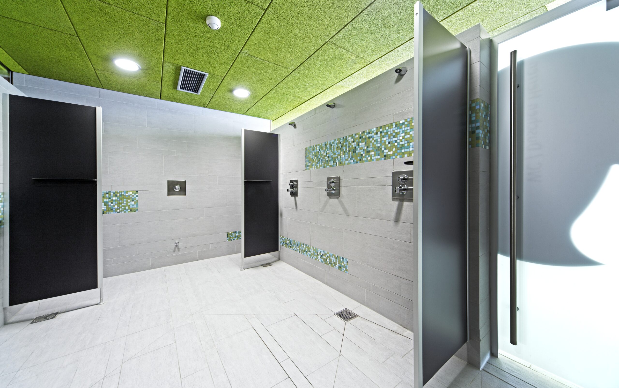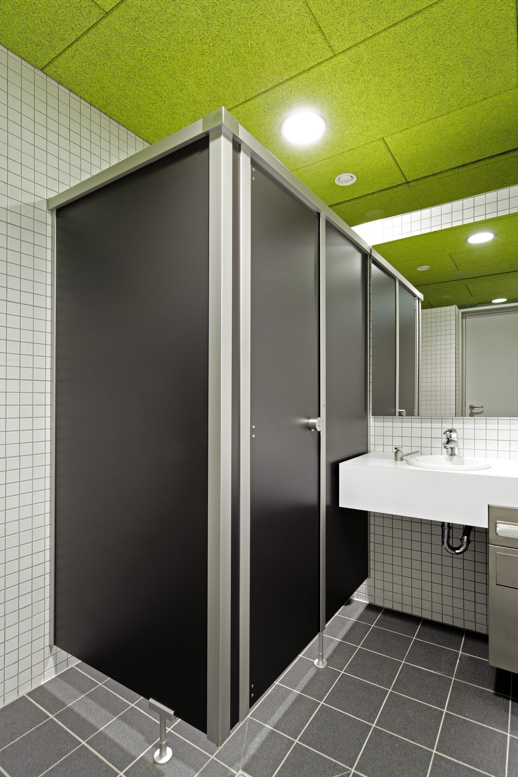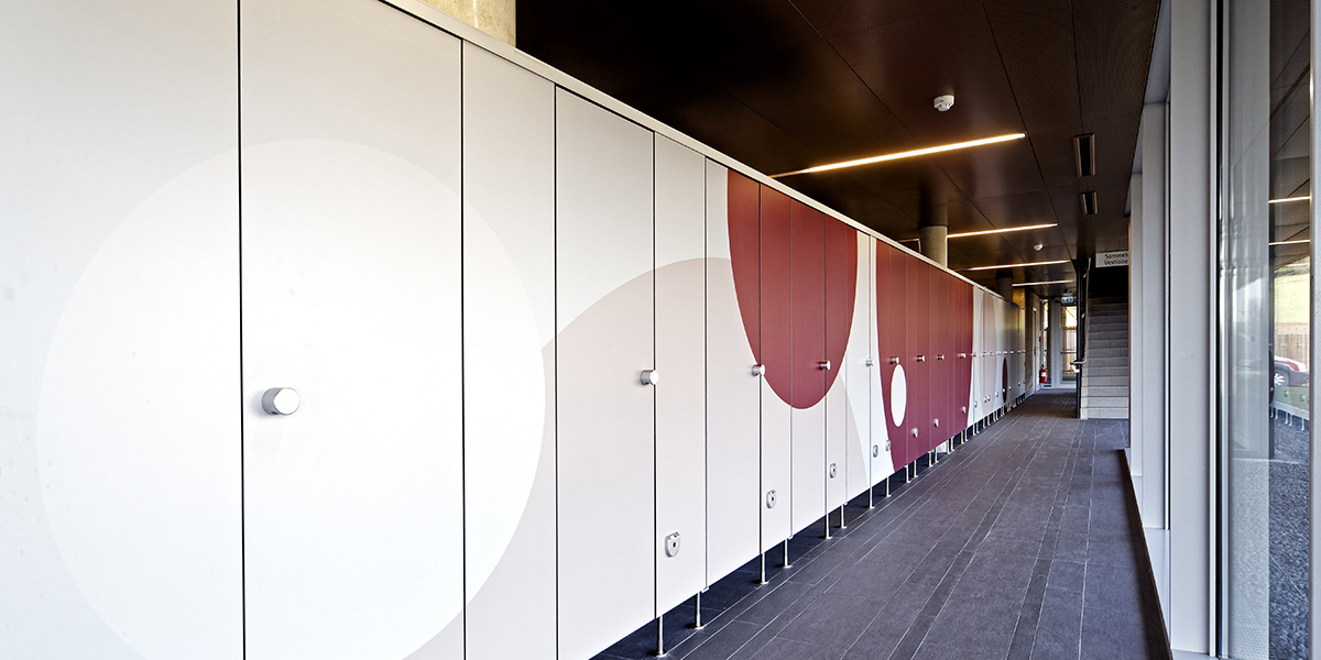 Zum Einsatz kamen WC-Trennwände und Umkleidekabinen des Systems cronus, die durch ihre stabile Aluminiumrahmenkonstruktion, Wasserresistenz und klarlinige Optik überzeugen. Ergänzt wurden sie durch Wechselkabinen des Typs PRIMO F, die mit individuellem Digitaldruck ausgeführt wurden und dem Raum ein einzigartiges Erscheinungsbild verleihen.