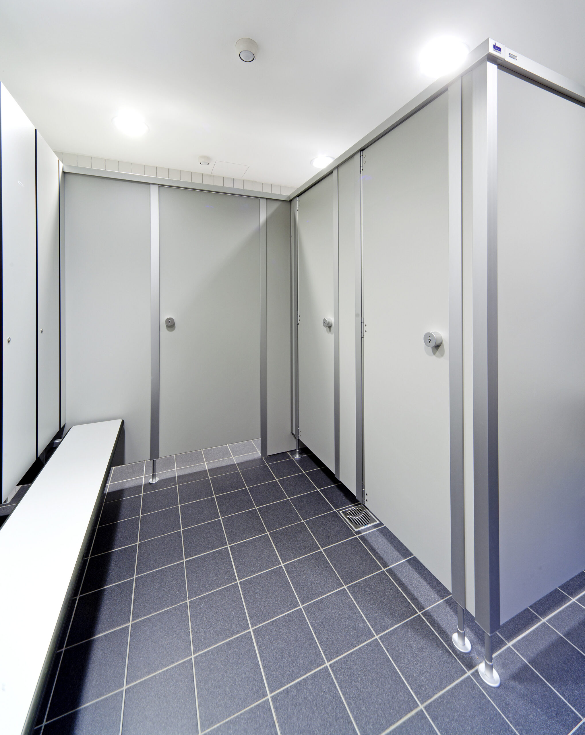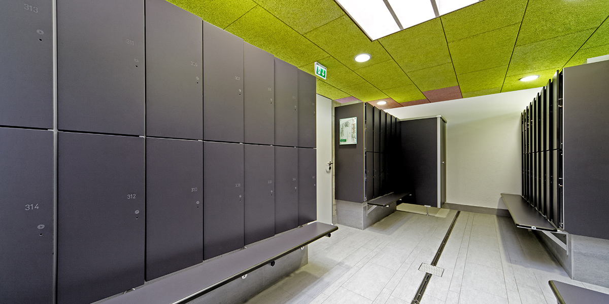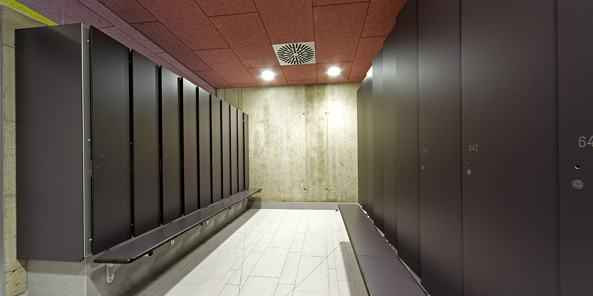 Für die Aufbewahrung der persönlichen Gegenstände wurden Schranksysteme IXOS P installiert, gefertigt aus robustem HPL und ausgelegt für hohe Beanspruchung und dauerhafte Feuchtigkeitsbeständigkeit. Ergänzend kamen Sichtschutz- und Schamwände cronus sowie Sitzbänke des Typs U zum Einsatz, die Funktionalität und Komfort harmonisch verbinden.