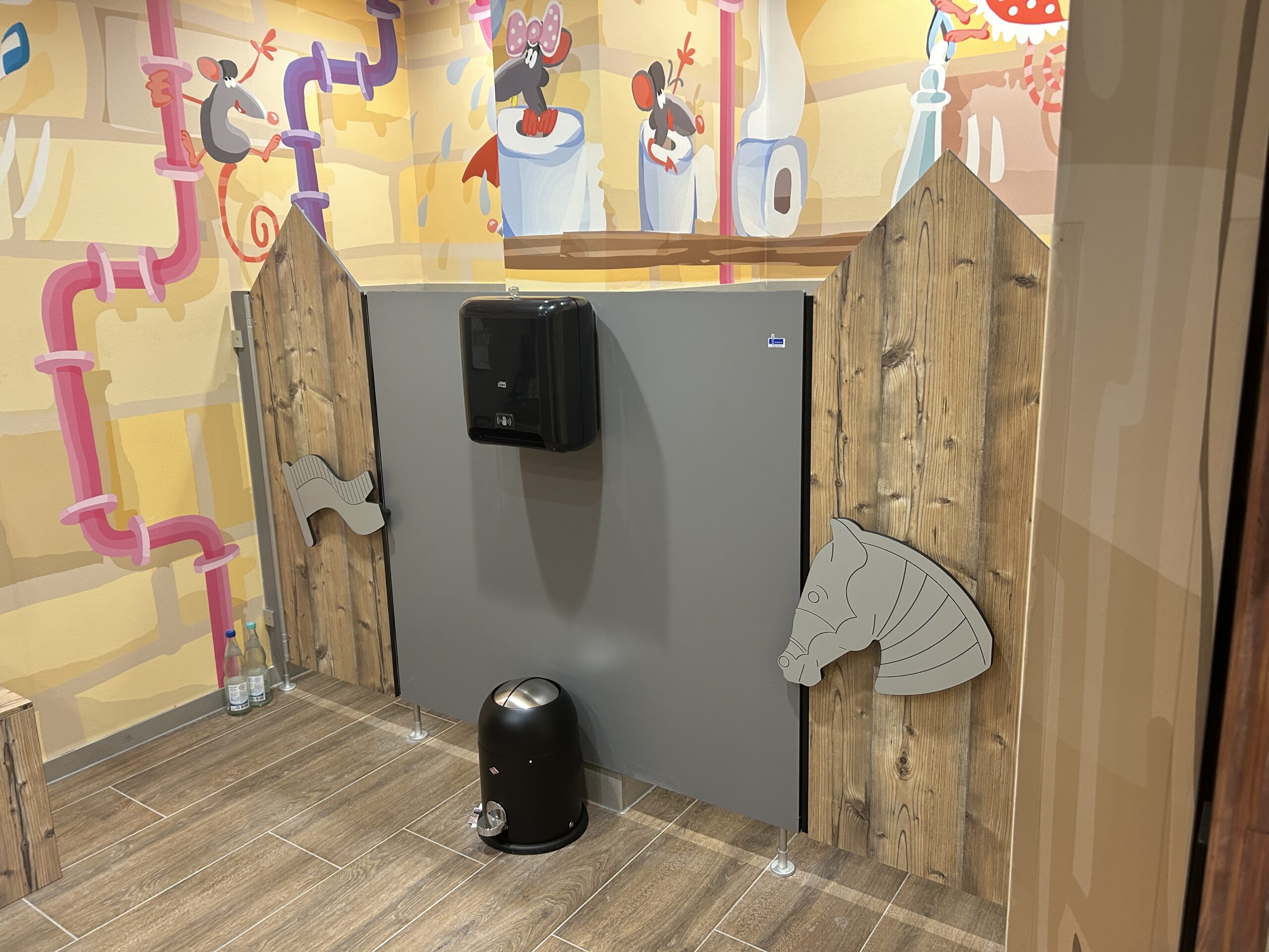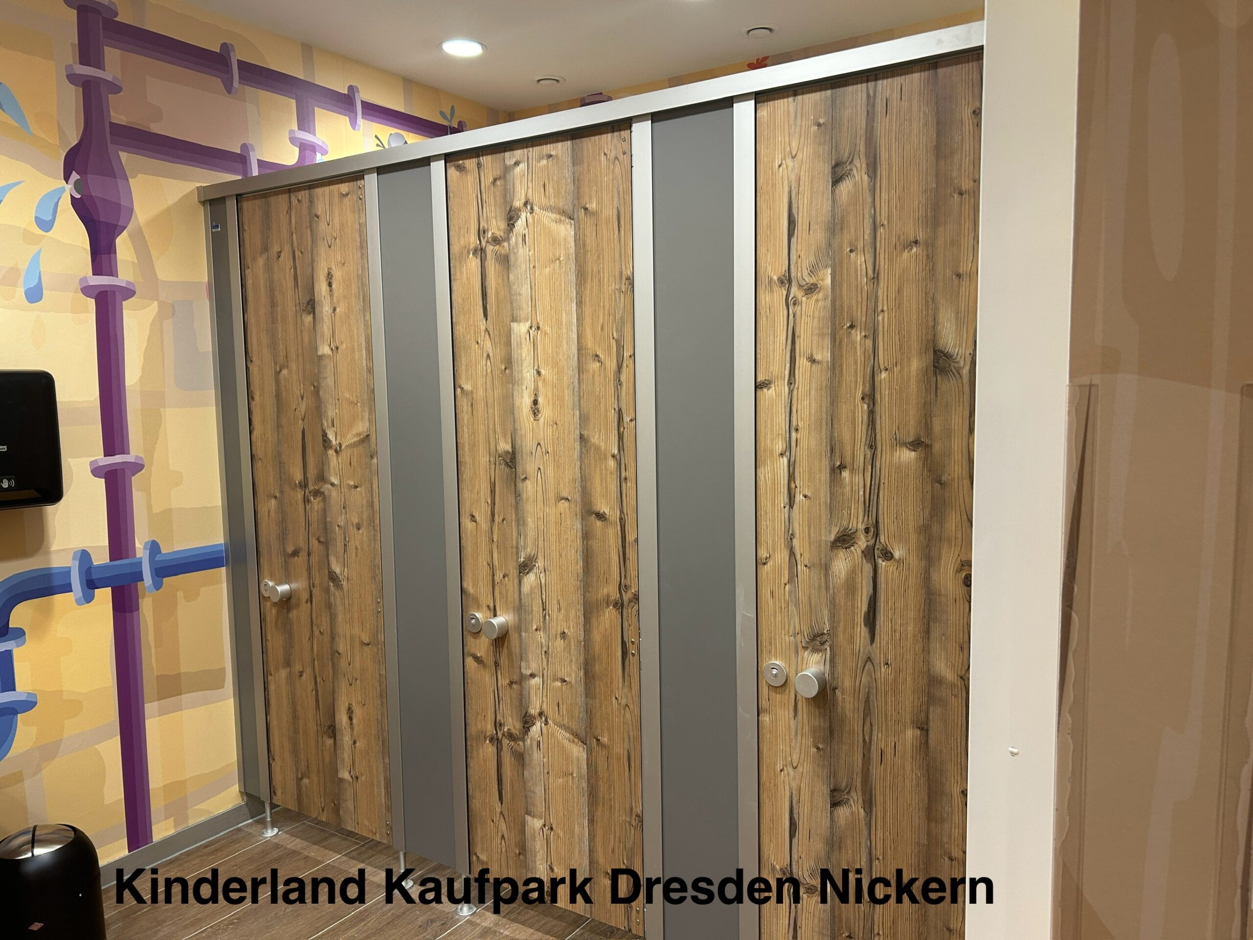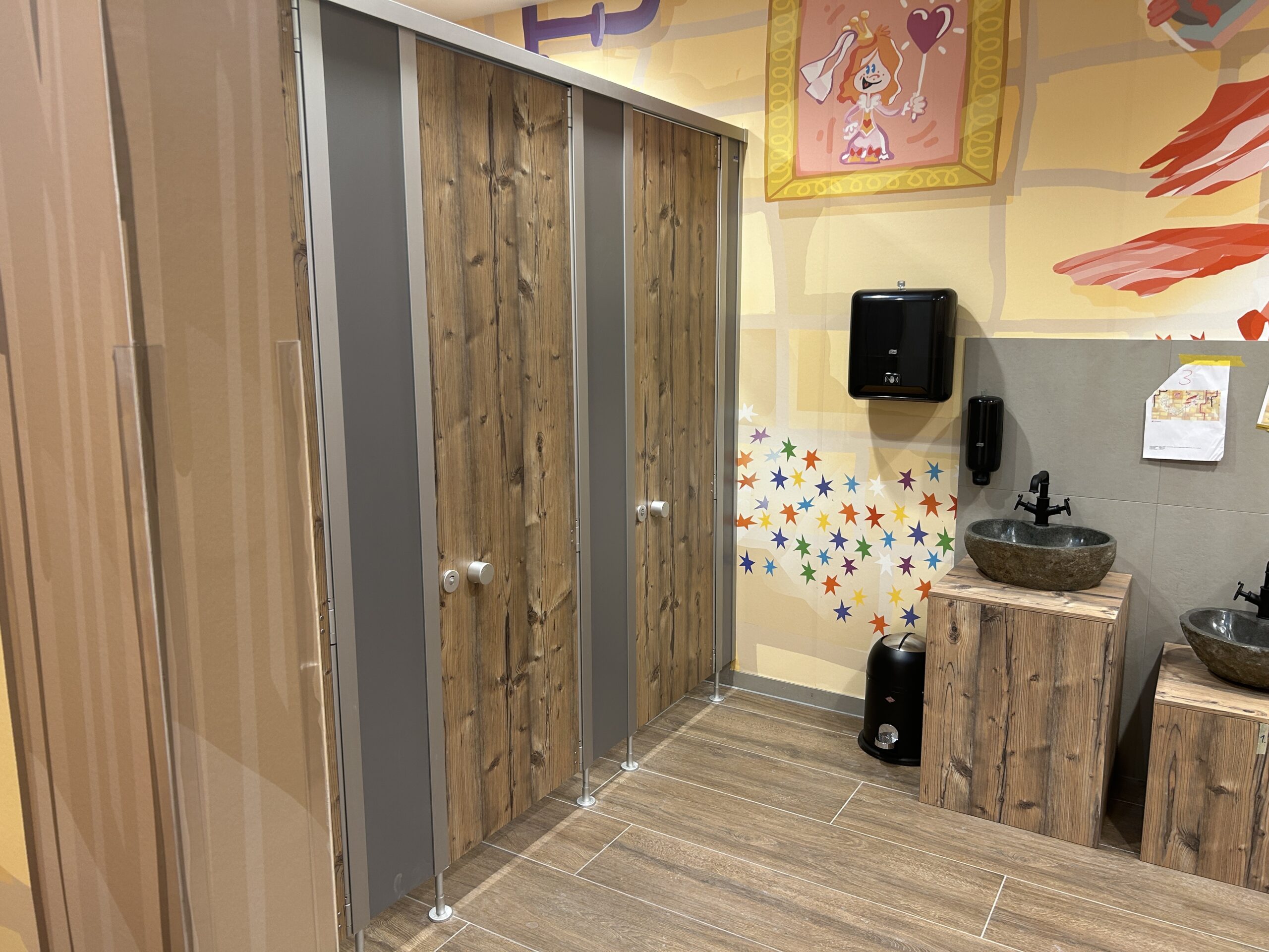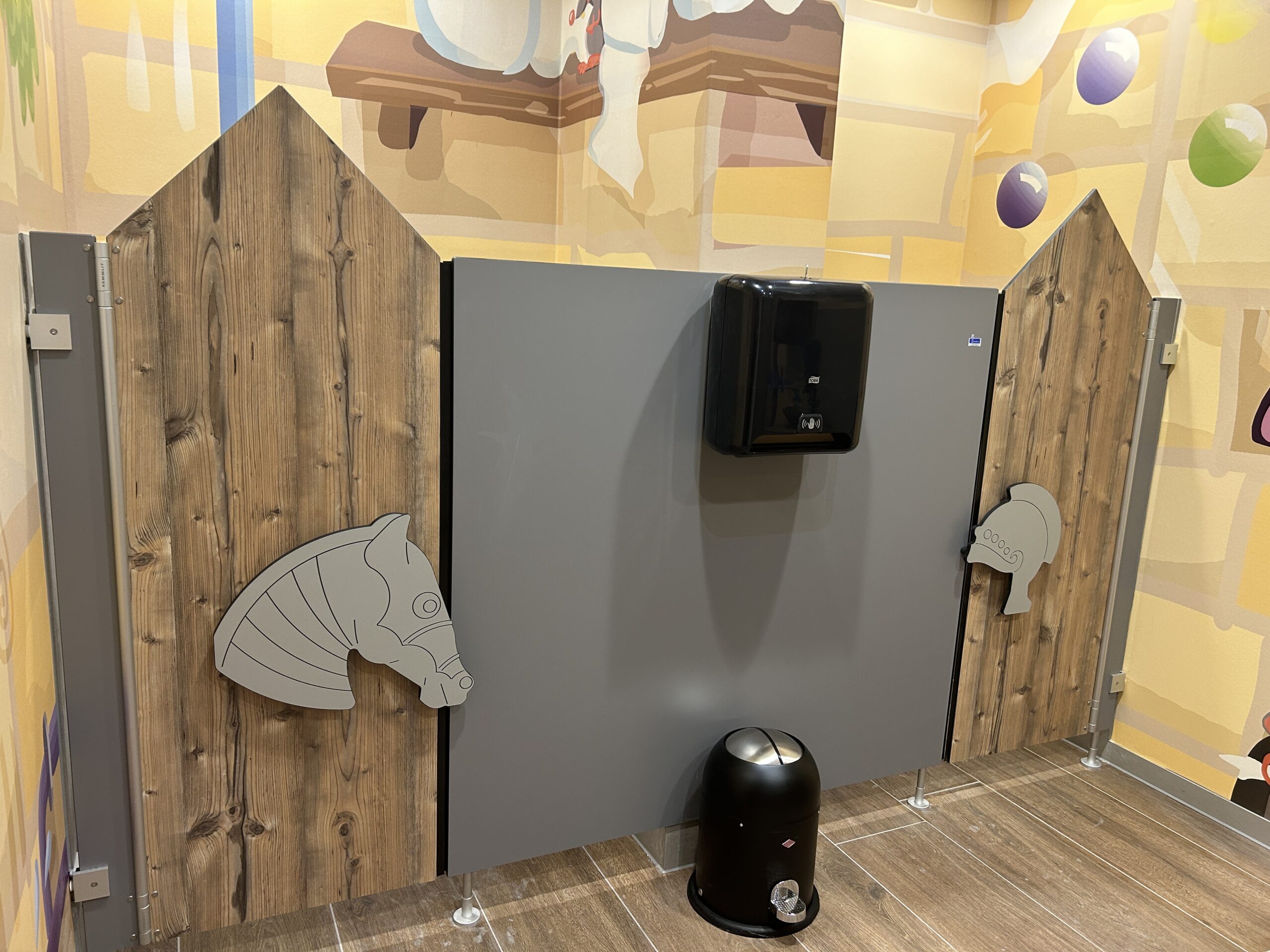 Die Sanitärräume im Indoor Spielplatz Kuddeldaddeldu wurden mit den Trennwandsystemen B-Bambino Exklusiv, cronus und den IXOS P Schließfächern von KEMMLIT ausgestattet. Die Systeme schaffen sichere, funktionale und kinderfreundliche Bereiche, in denen Kinder spielerisch ihre Umgebung entdecken können. Individuelle Trennwandmotive, spezielle Griffmotive und passendes Sanitärzubehör sorgen für eine pädagogisch wertvolle und angenehme Atmosphäre.