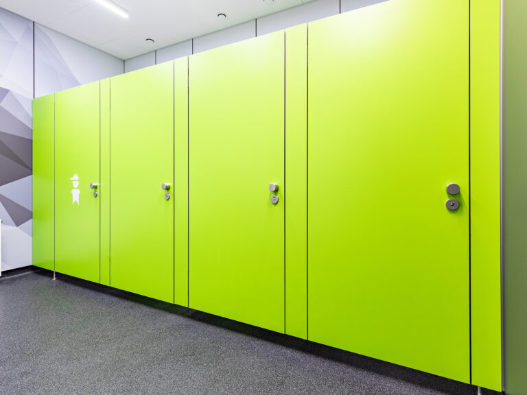 Ergänzend wurden KEMMLIT Garderobenschränke Typo S in kristallweiß installiert. Diese verfügen über Zylinder-Hebelschloss und eingravierte Nummerierung. Der Stahlkorpus der Schränke bietet maximale Stabilität, Korrosionsschutz und Langlebigkeit, während die Innenausstattung flexibel an die Bedürfnisse der Nutzer angepasst werden kann.