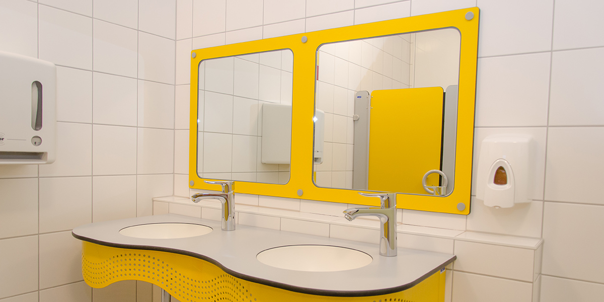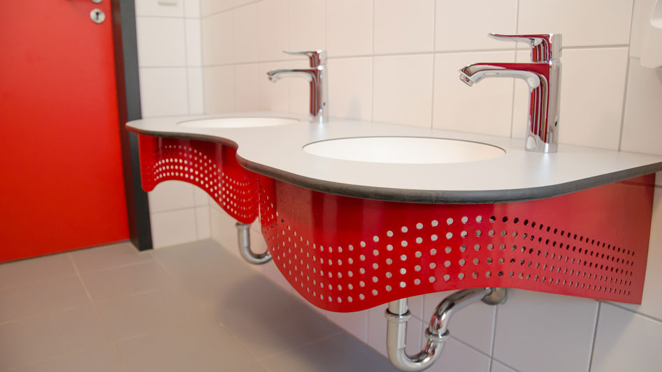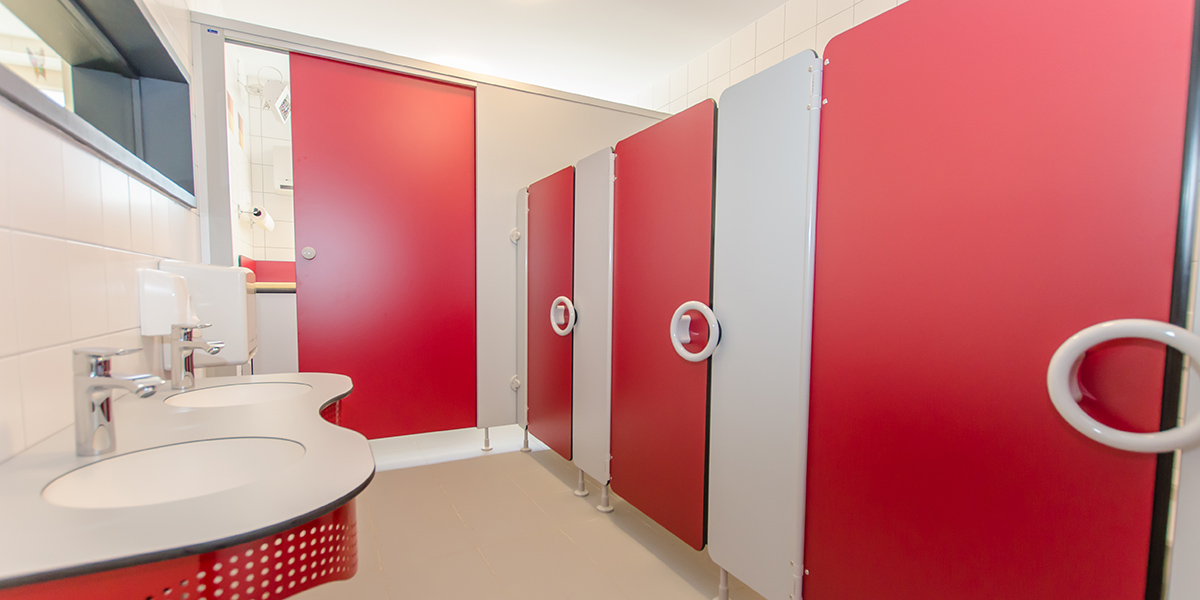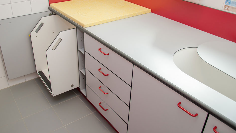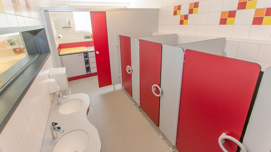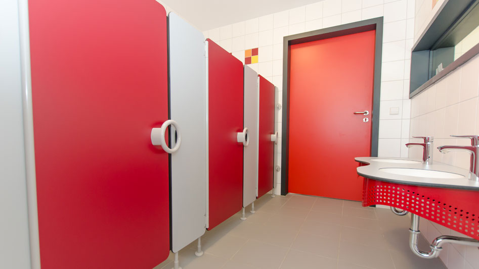 Die WC-Trennwand B-Bambino ist speziell auf die Bedürfnisse von Kindern ausgelegt: abgerundete Kanten, Fingerklemmschutz an Türen und Bändern sowie kindgerechte Höhe und Griffe garantieren maximale Sicherheit. Der Reihenwaschtisch und der Wickeltisch unterstützen eine kindgerechte Nutzung und fördern selbstständige Handhabung im Sanitärbereich.