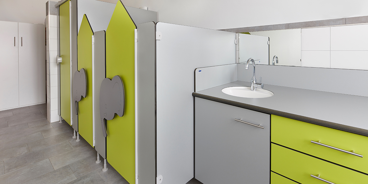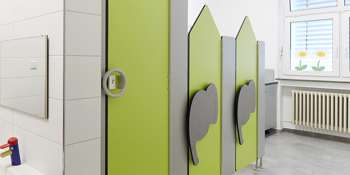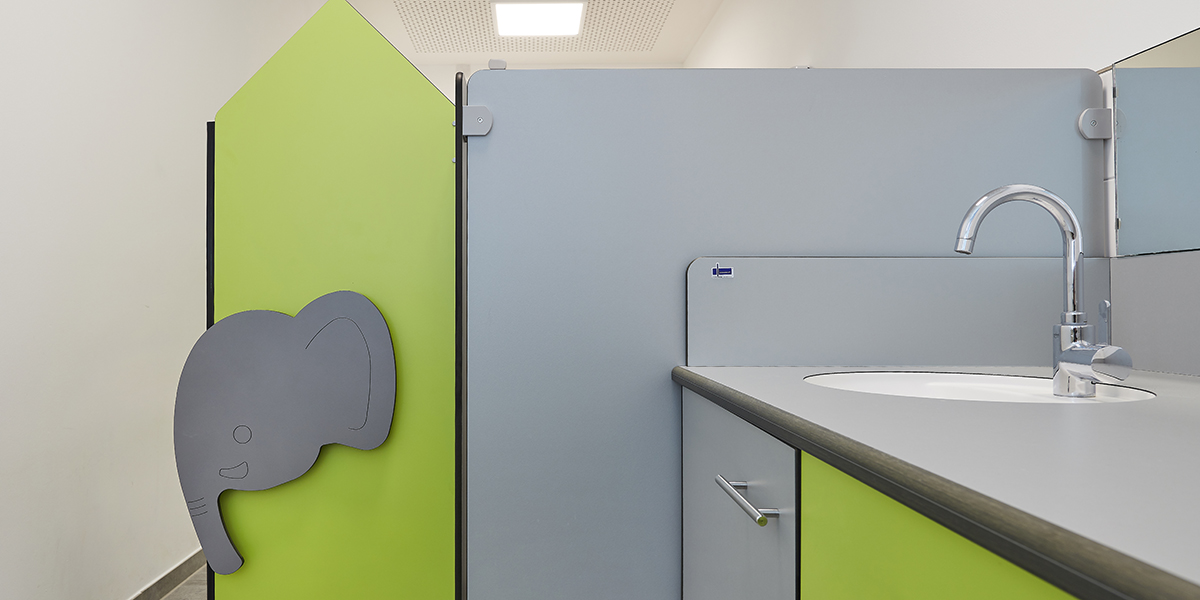 Durch die Kombination aus farblich abgestimmten WC-Trennwänden, Wickelmöbeln und Griffmotiven entsteht ein harmonisches, funktionales Umfeld, das Kinder zum selbstständigen Umgang mit den Sanitärräumen einlädt.