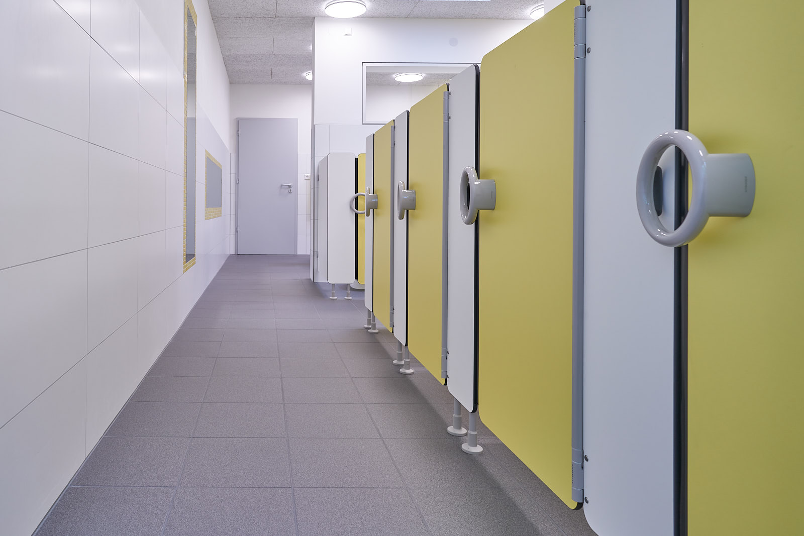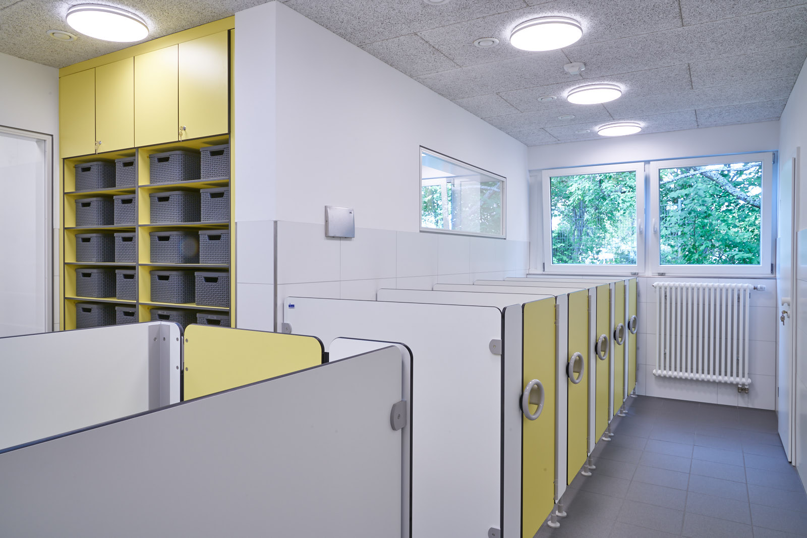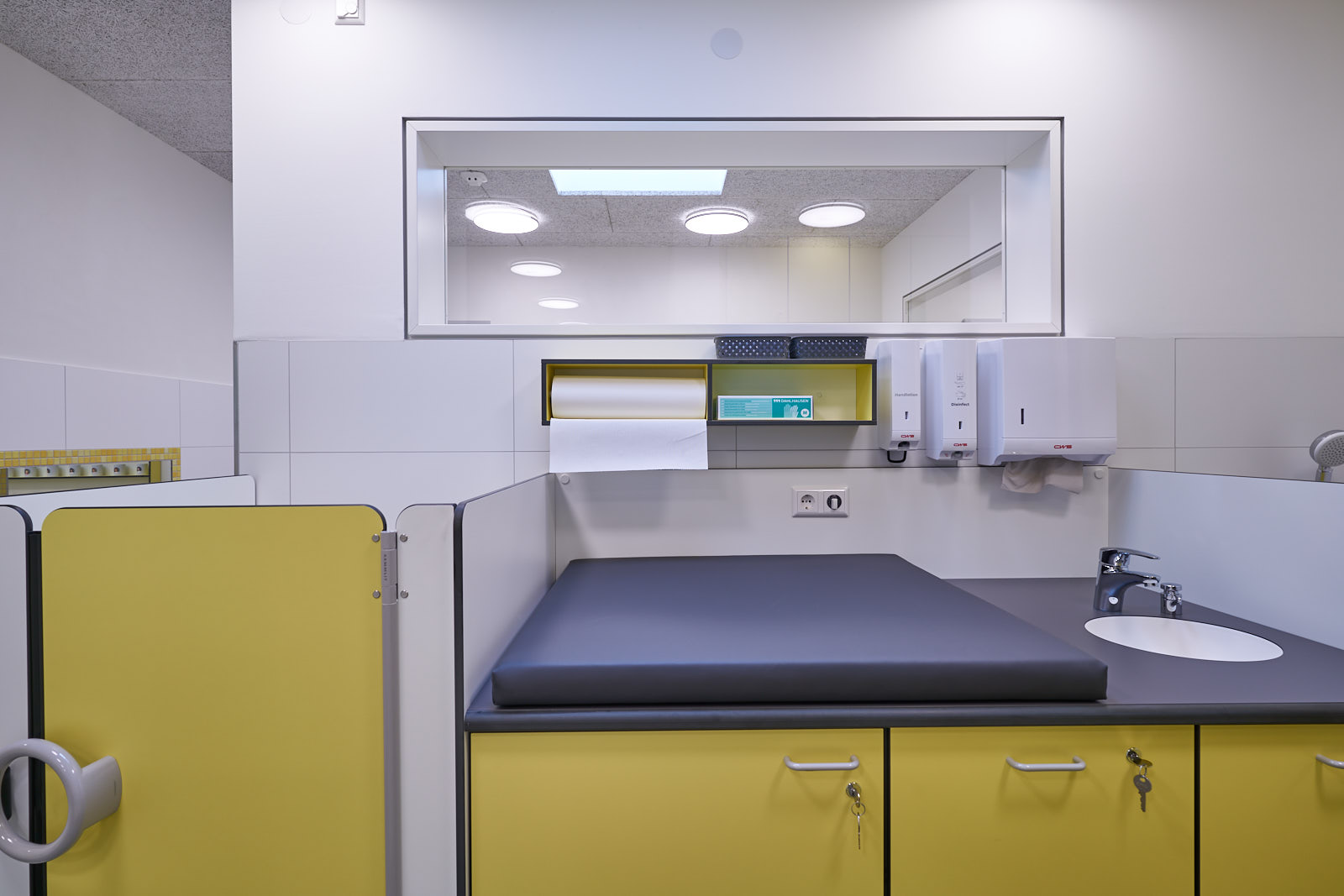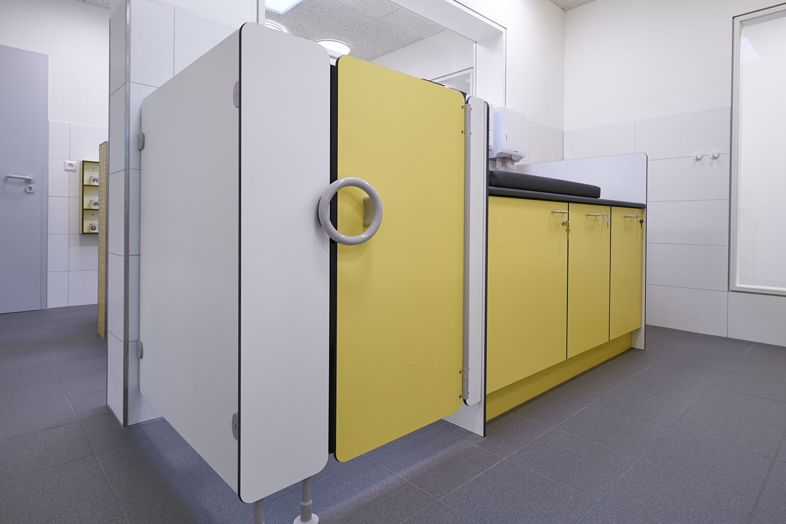 In der Kindertagesstätte Wöschhalde wurde der Sanitär- und Wickelbereich mit kindgerechten Lösungen aus dem Bambino-Programm ausgestattet. Zum Einsatz kamen WC-Trennwände des Typs B-Bambino Klassik, eine Bambino Wickelkombination sowie ein Bambino Regal – alles in den freundlichen Farbtönen Verkehrsweiß (9317) und Camomilla (2124).