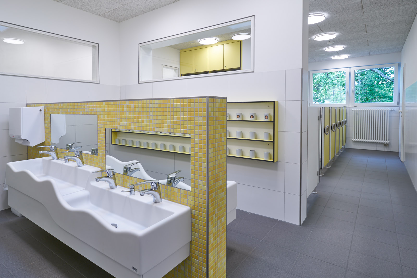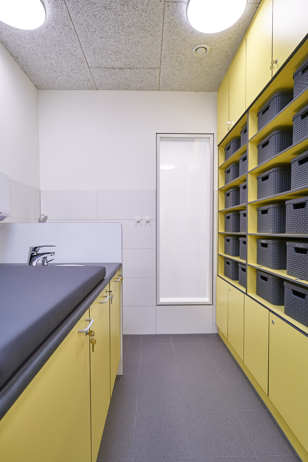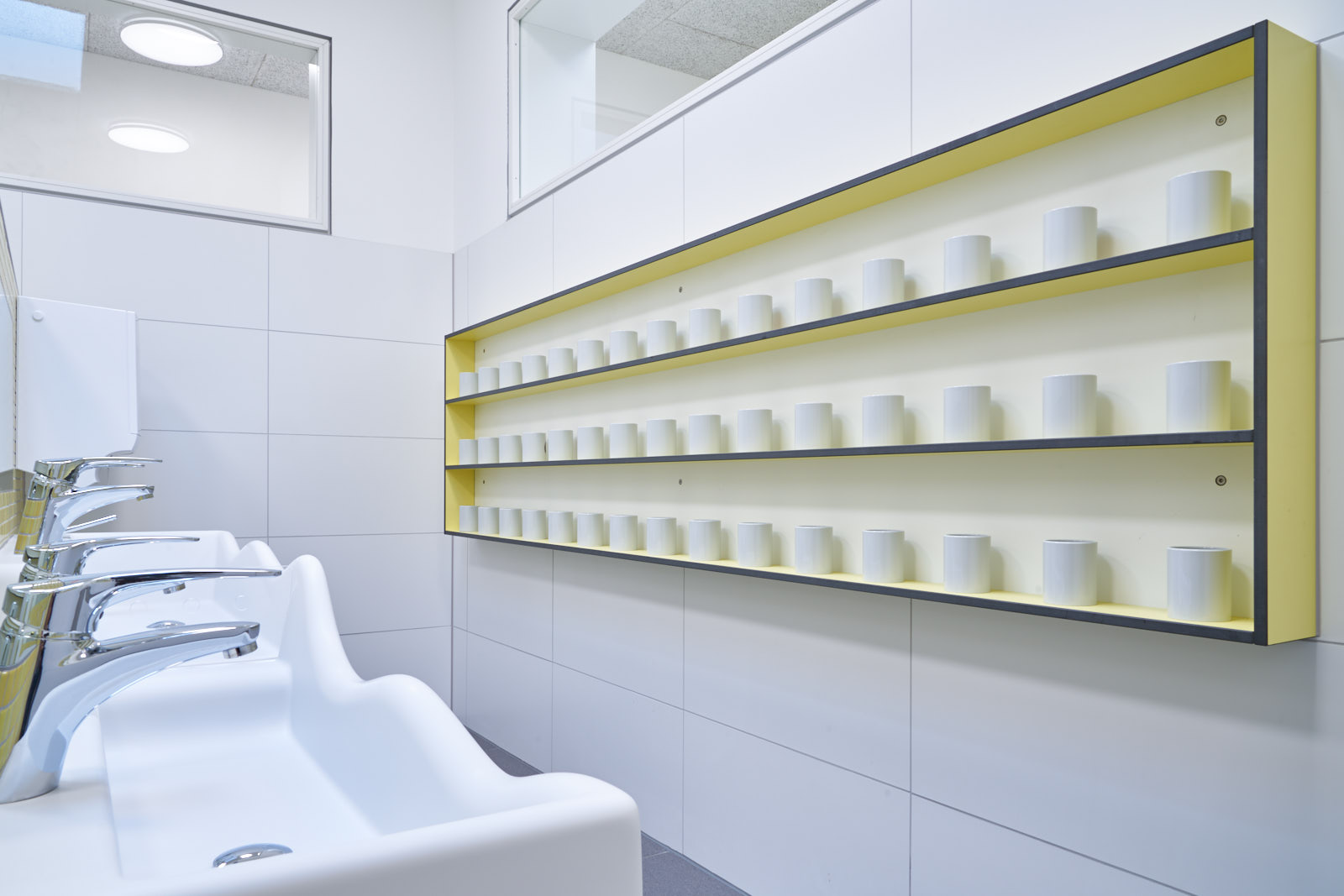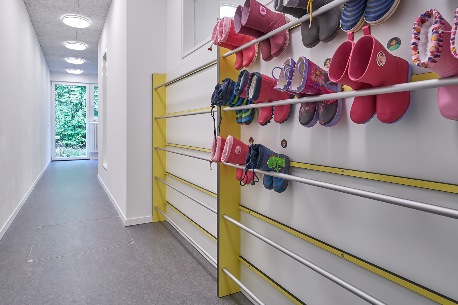 In der Kindertagesstätte Wöschhalde wurde der Sanitär- und Wickelbereich mit kindgerechten Lösungen aus dem Bambino-Programm ausgestattet. Zum Einsatz kamen WC-Trennwände des Typs B-Bambino Klassik, eine Bambino Wickelkombination sowie ein Bambino Regal – alles in den freundlichen Farbtönen Verkehrsweiß (9317) und Camomilla (2124).