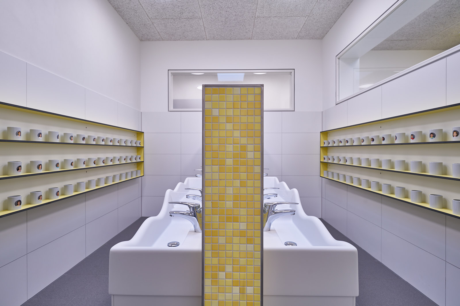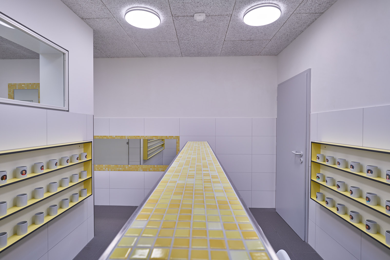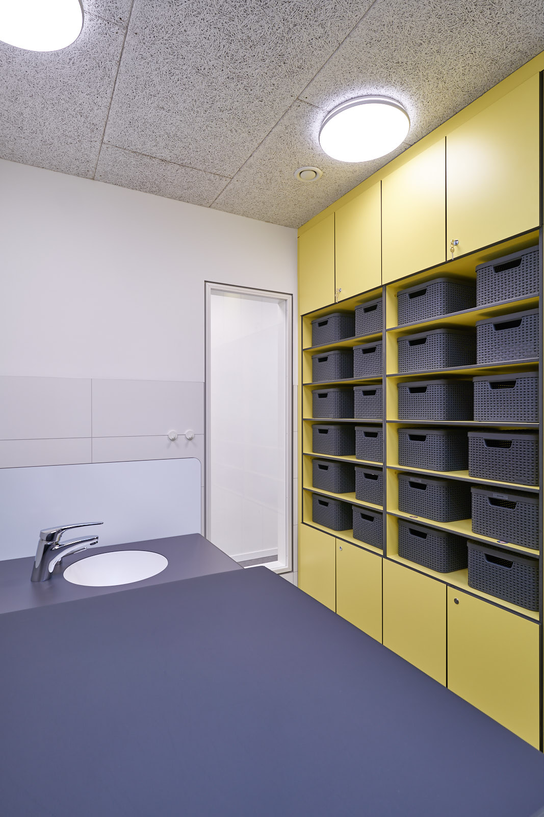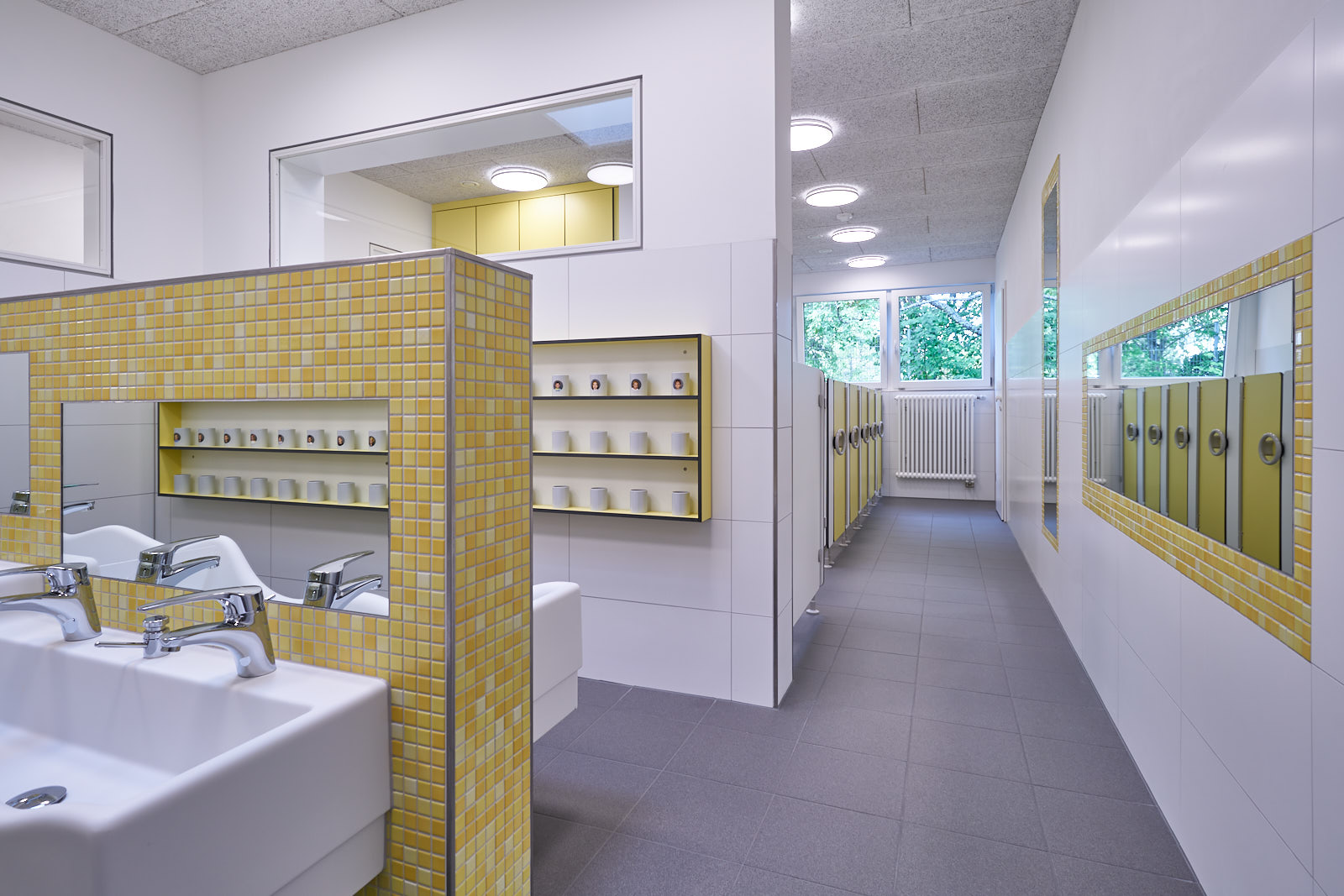 In der Kindertagesstätte Wöschhalde wurde der Sanitär- und Wickelbereich mit kindgerechten Lösungen aus dem Bambino-Programm ausgestattet. Zum Einsatz kamen WC-Trennwände des Typs B-Bambino Klassik, eine Bambino Wickelkombination sowie ein Bambino Regal – alles in den freundlichen Farbtönen Verkehrsweiß (9317) und Camomilla (2124).