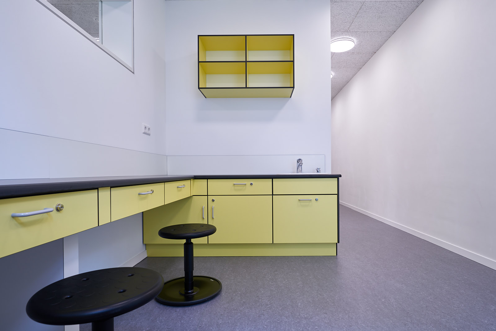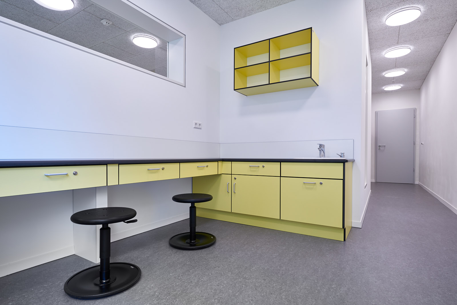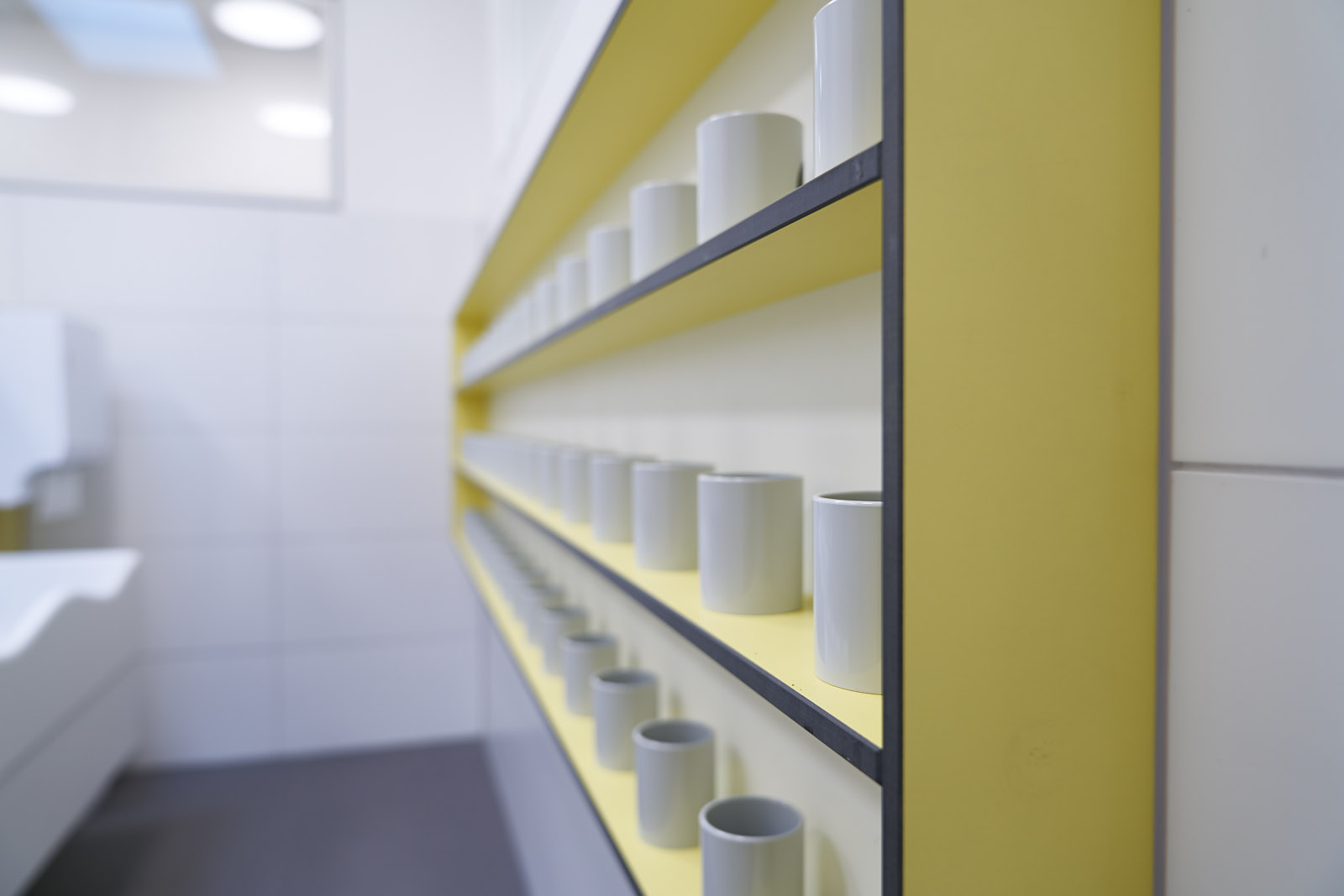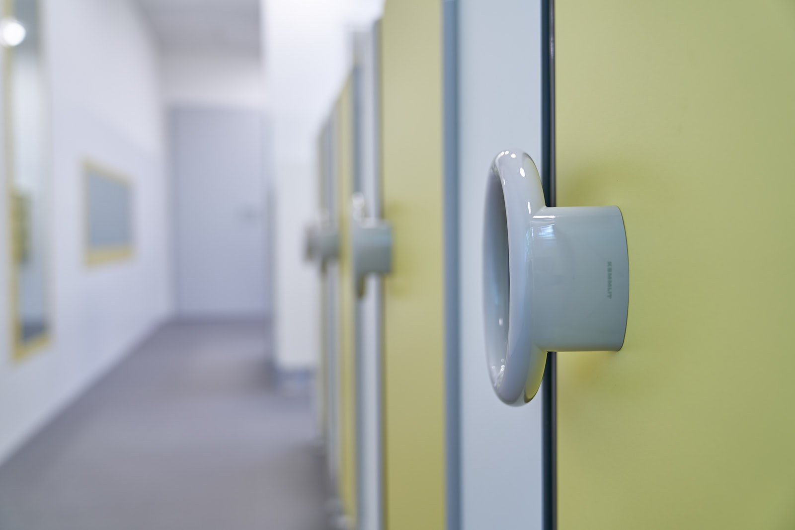 In der Kindertagesstätte Wöschhalde wurde der Sanitär- und Wickelbereich mit kindgerechten Lösungen aus dem Bambino-Programm ausgestattet. Zum Einsatz kamen WC-Trennwände des Typs B-Bambino Klassik, eine Bambino Wickelkombination sowie ein Bambino Regal – alles in den freundlichen Farbtönen Verkehrsweiß (9317) und Camomilla (2124).