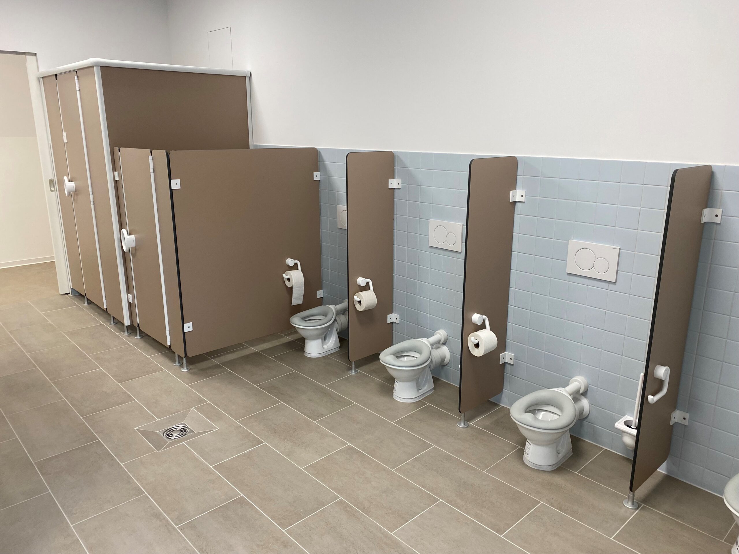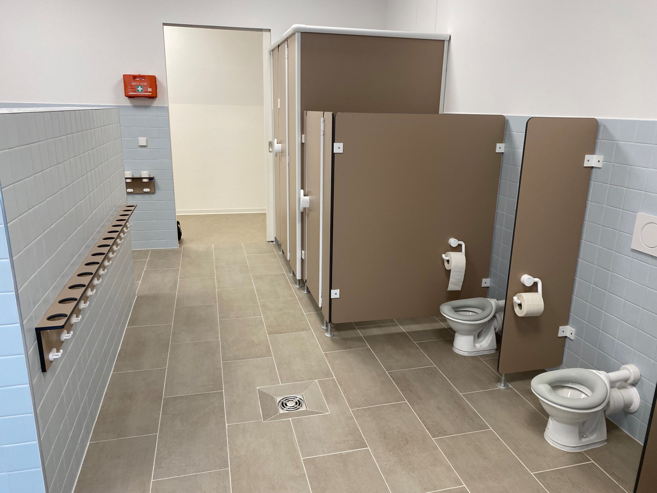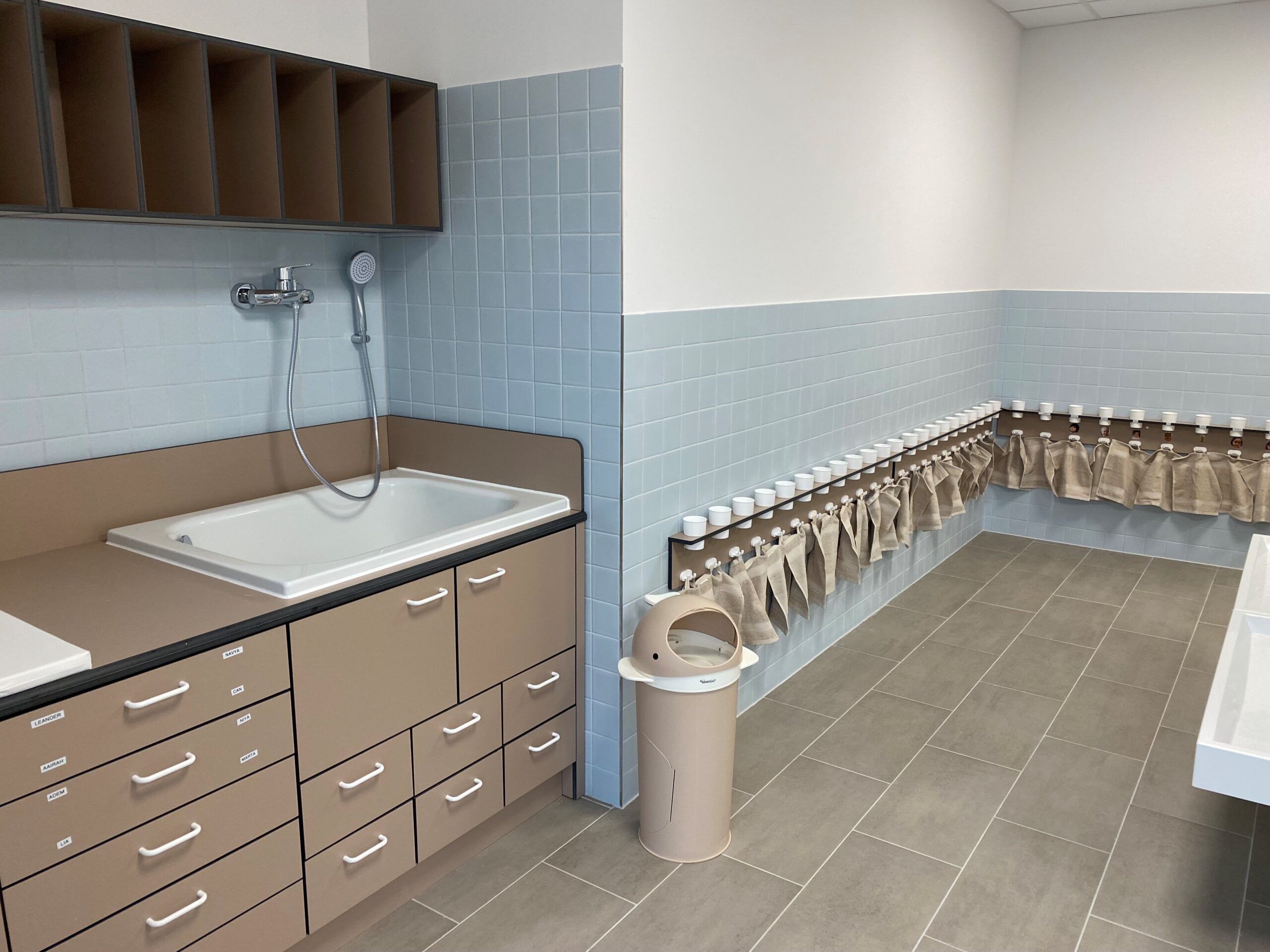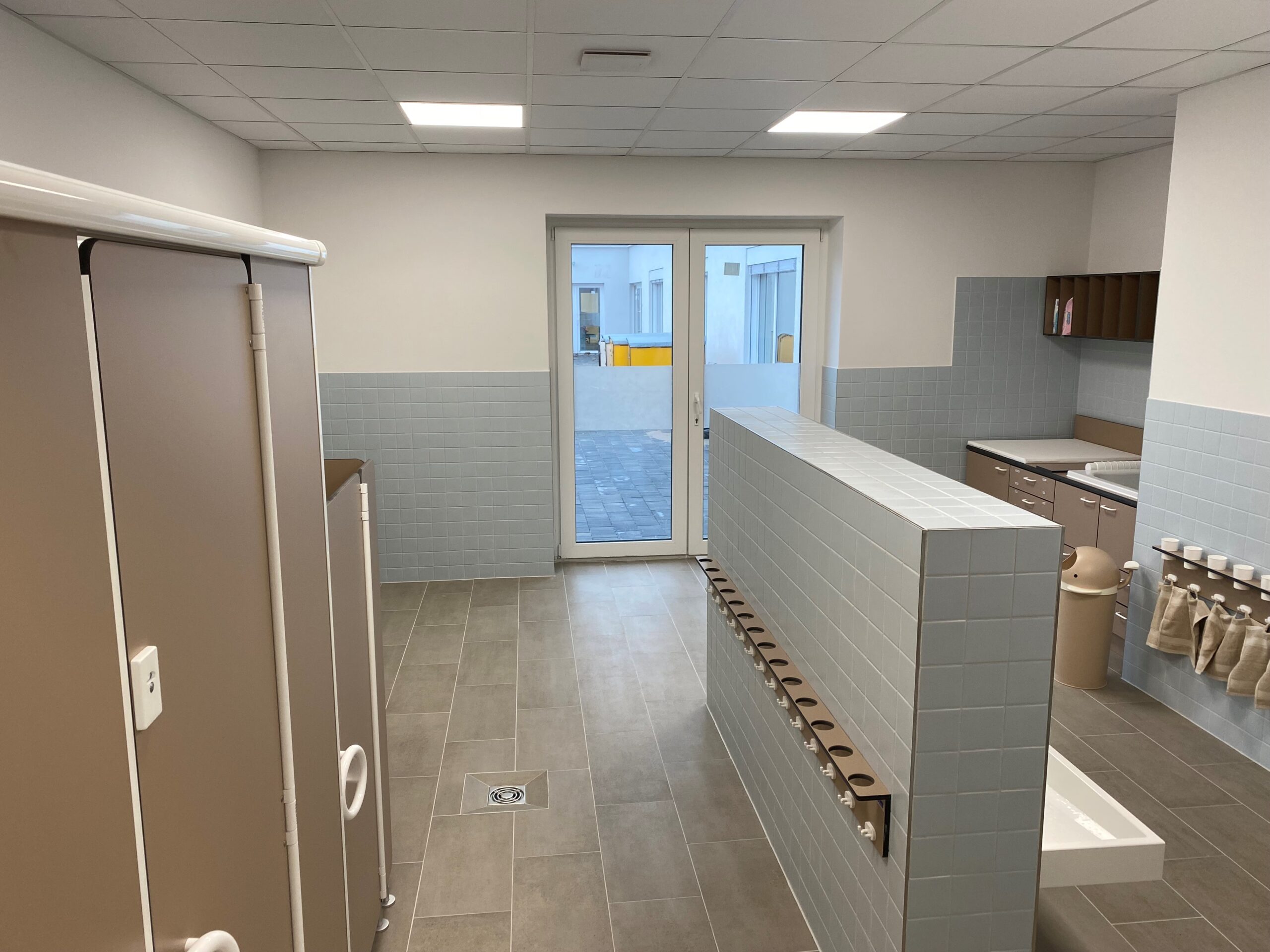 Ergänzt wird die Ausstattung durch Wickeltische sowie Zahnputzbecherleisten, die den Kindern eine praktische und hygienische Nutzung des Sanitärbereichs ermöglichen.