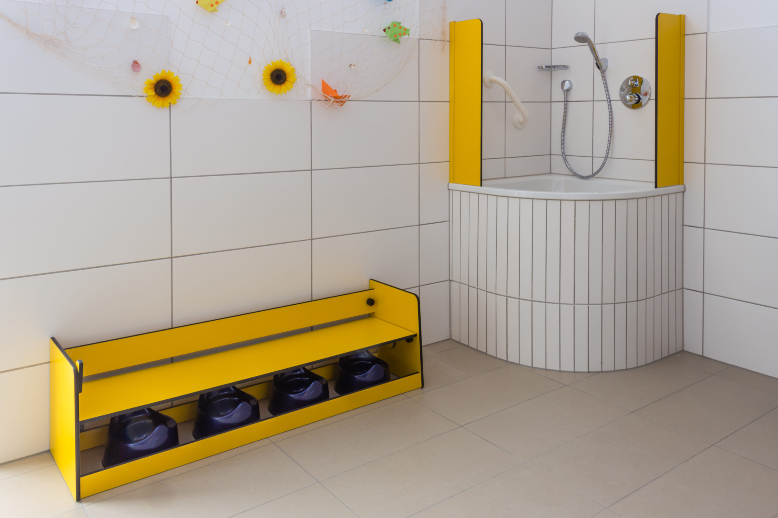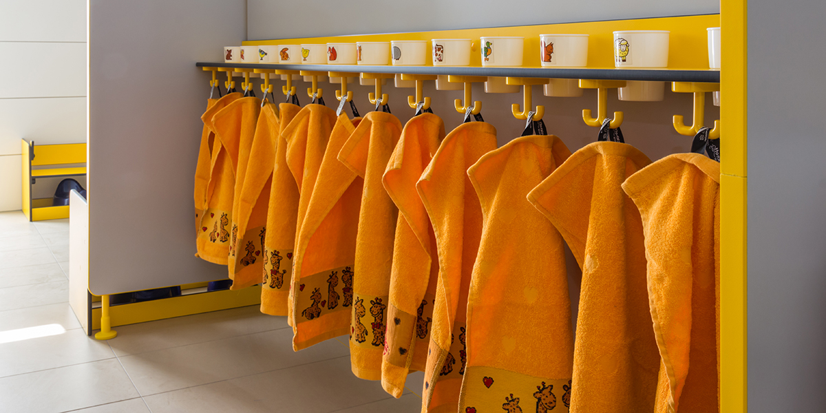 Für die WC-Räume lieferte KEMMLIT umfassende, kindgerechte Lösungen: WC-Trennwände Bambino Typ D aus Span, Wickeltische Bambino aus HPL, Waschplätze Bambino, Zahnputzbecherleisten Bambino sowie praktische Töpfchenbänke Bambino. Das flexible Bambino-Programm ermöglicht maßgeschneiderte Lösungen für jede Altersstufe und schafft hygienische, sichere und funktionale Sanitärbereiche.