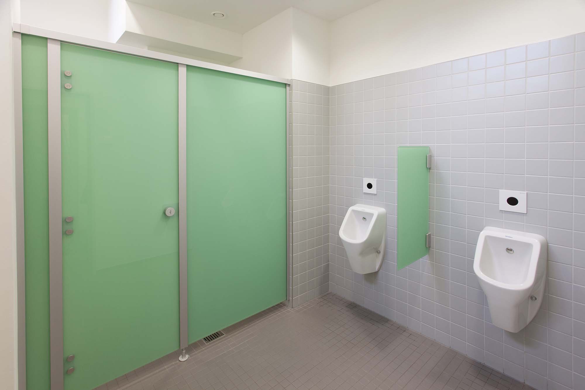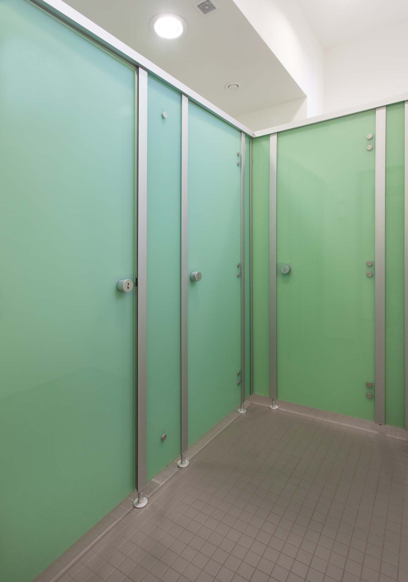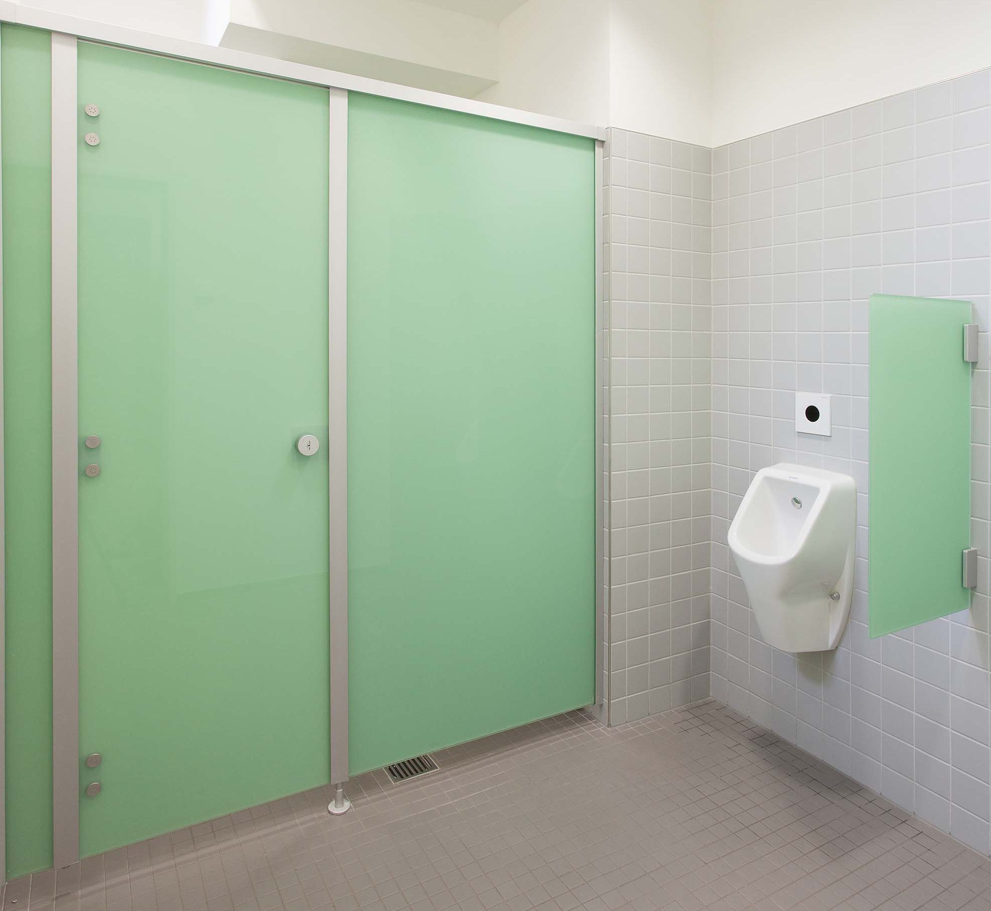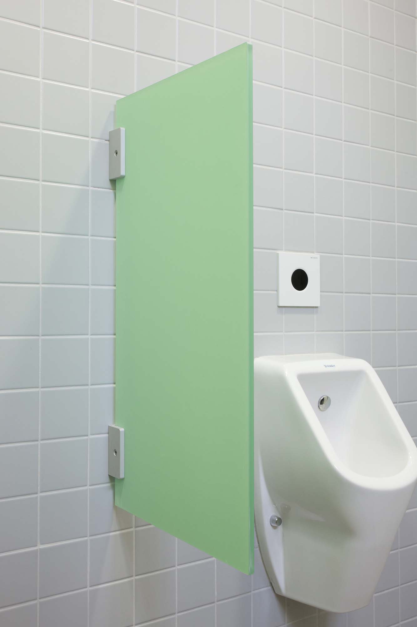 Das System besteht aus Einscheibensicherheitsglas (ESG), das durch seine porenfreie Oberfläche maximale Reinigungsfreundlichkeit und Hygiene gewährleistet. Die gewählte Farbe Weißgrün in Kombination mit dem filigranen Design sorgt für eine helle, moderne und leichte Atmosphäre im Raum.