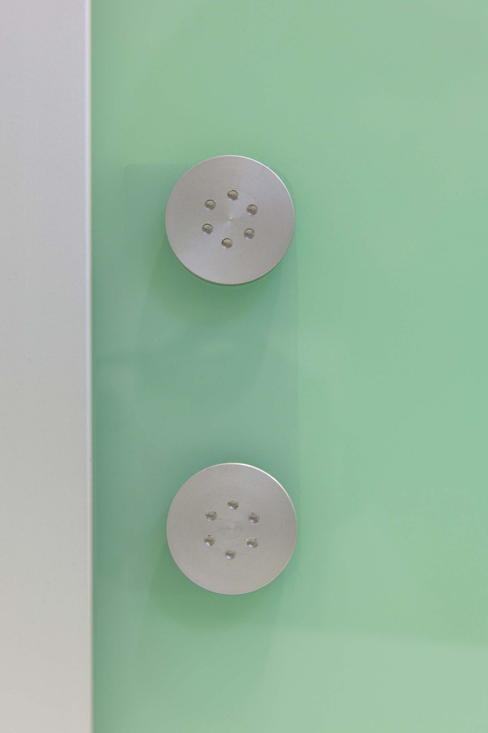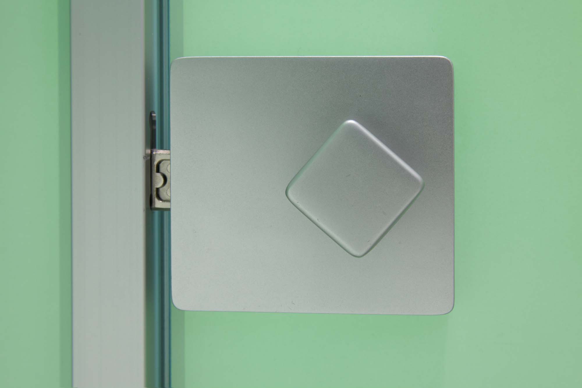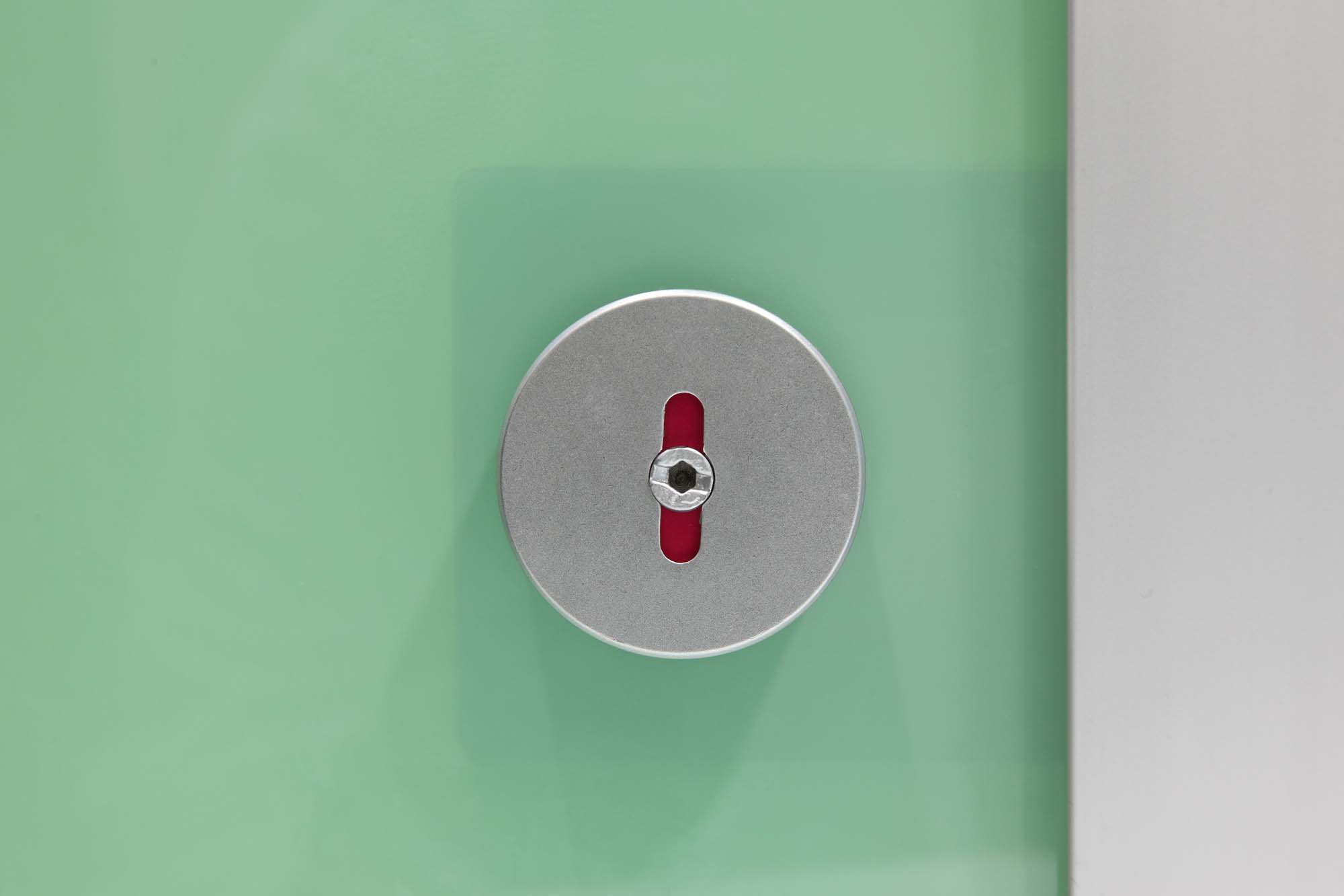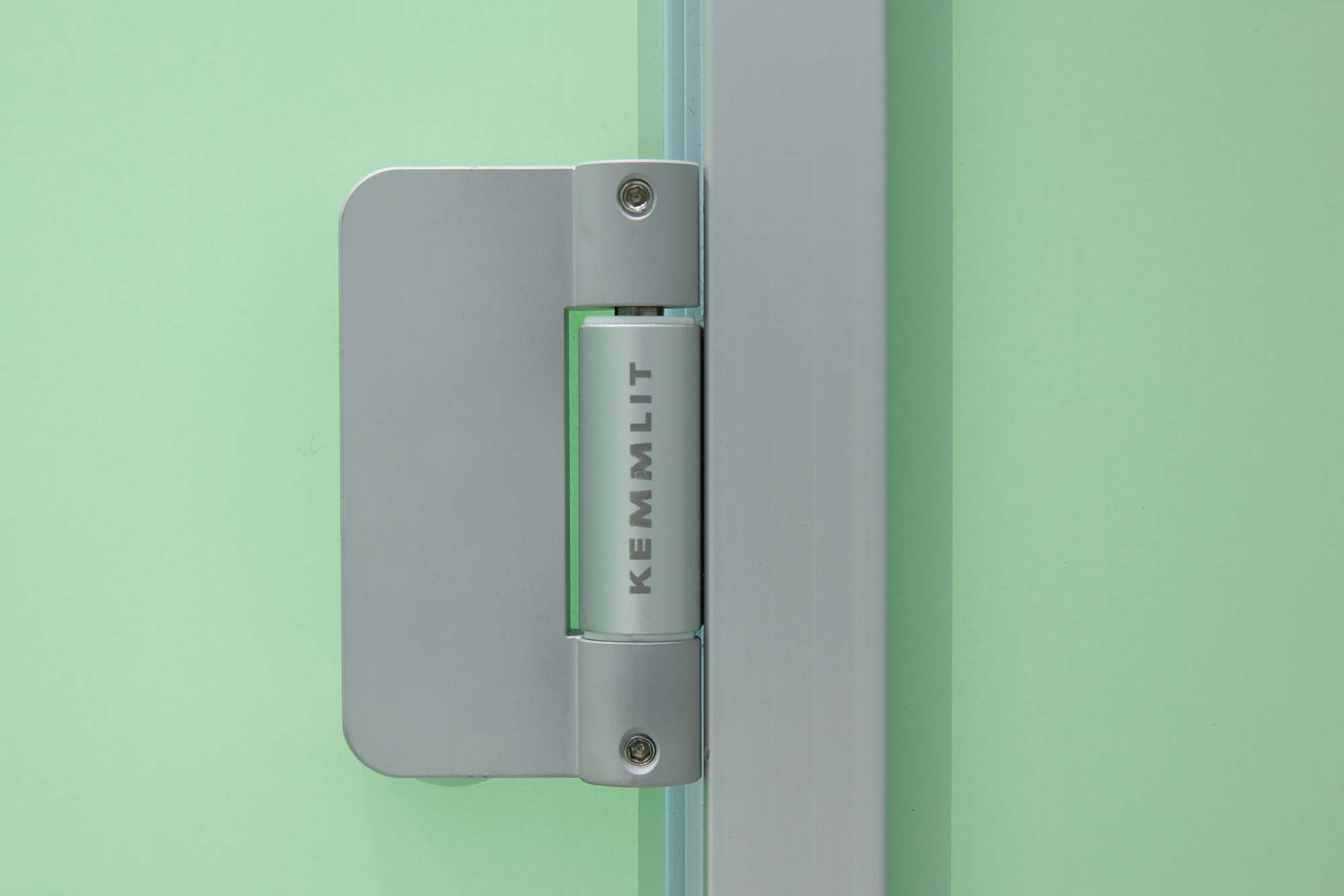 Das System besteht aus Einscheibensicherheitsglas (ESG), das durch seine porenfreie Oberfläche maximale Reinigungsfreundlichkeit und Hygiene gewährleistet. Die gewählte Farbe Weißgrün in Kombination mit dem filigranen Design sorgt für eine helle, moderne und leichte Atmosphäre im Raum.