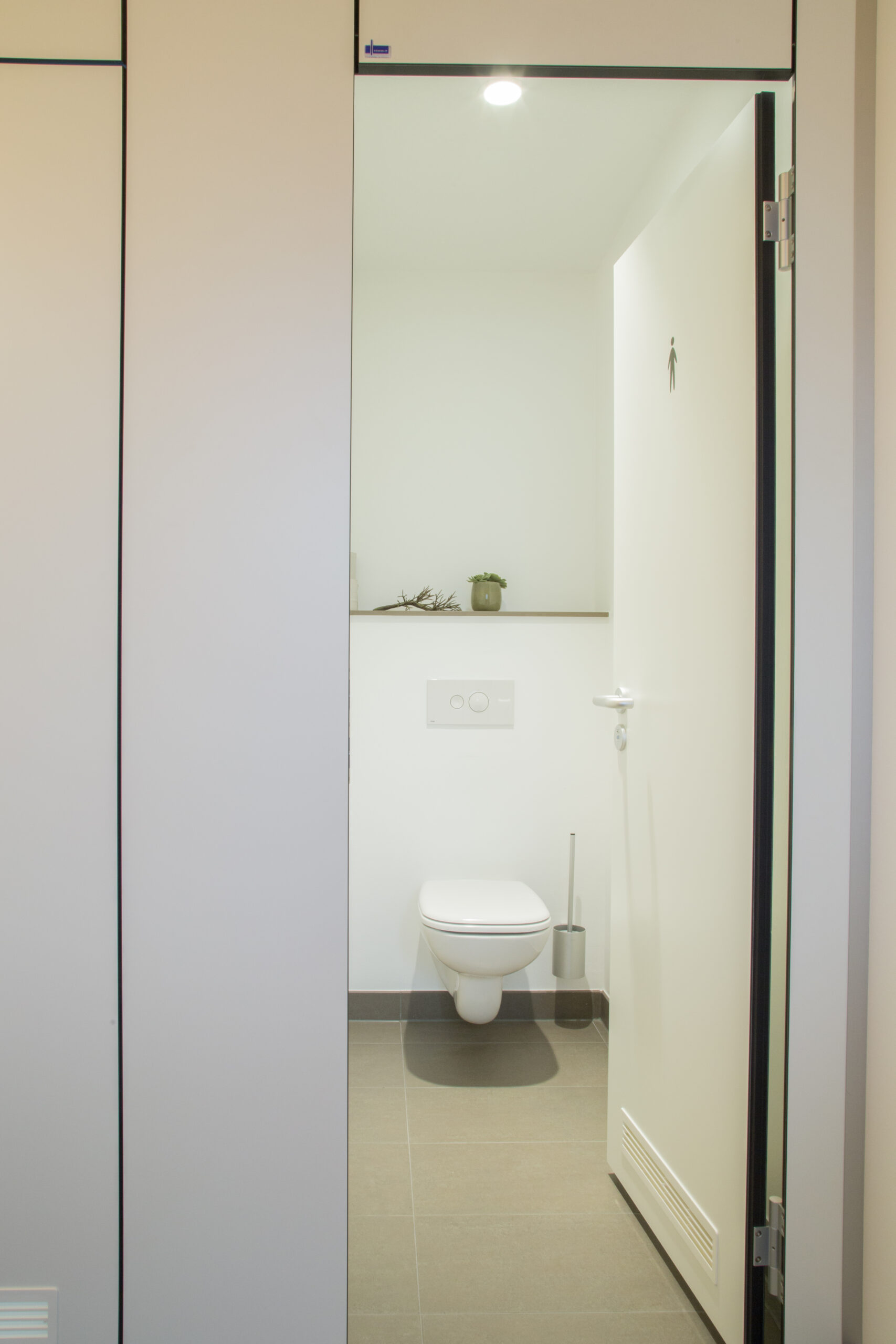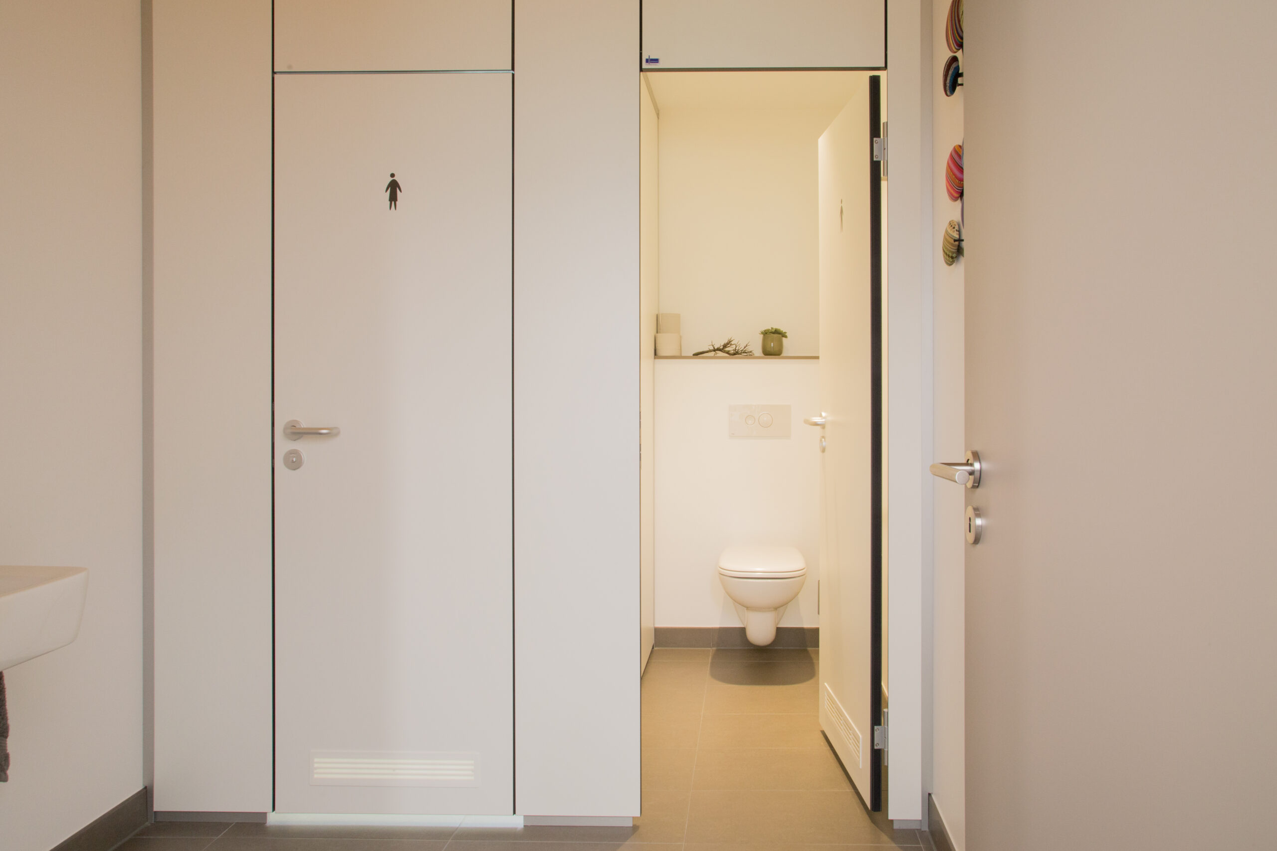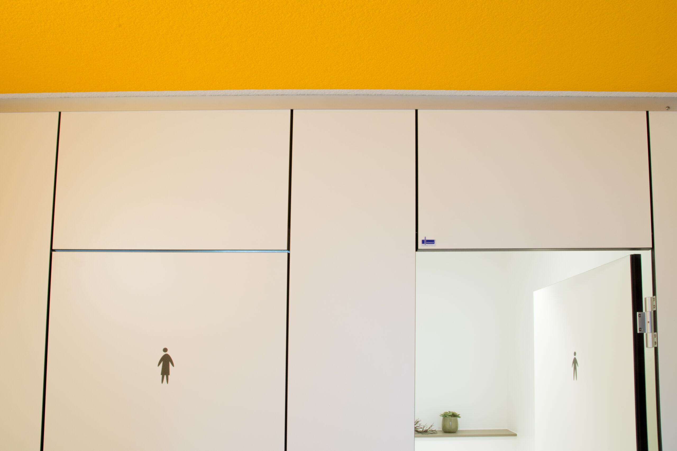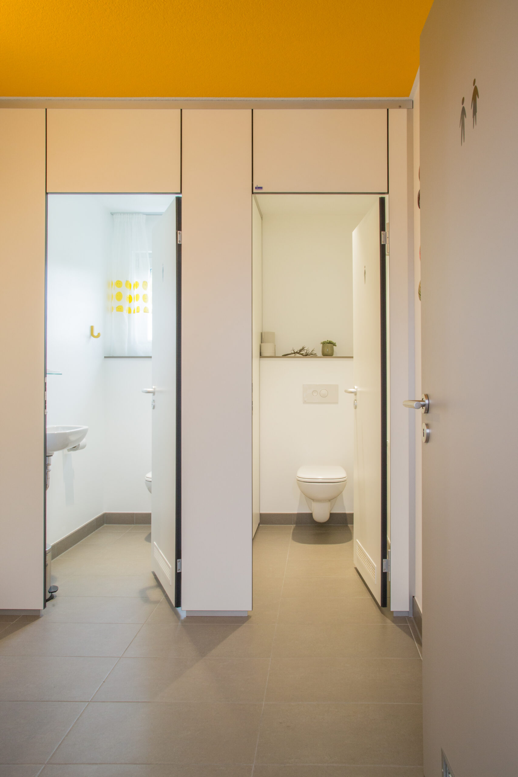 Um den Nutzern ein Maximum an Privatsphäre und Schallschutz zu bieten, wurde die Anlage raumhoch geschlossen und ohne Bodenfreiheit realisiert. Die Kabinen wirken dadurch wie massive Wände und bieten einen vollständigen Sichtschutz. Technisch überzeugt PRIMO F durch eine glattflächige Front aus 30 mm starken Verbundelementen, die besonders pflegeleicht und stabil sind.
