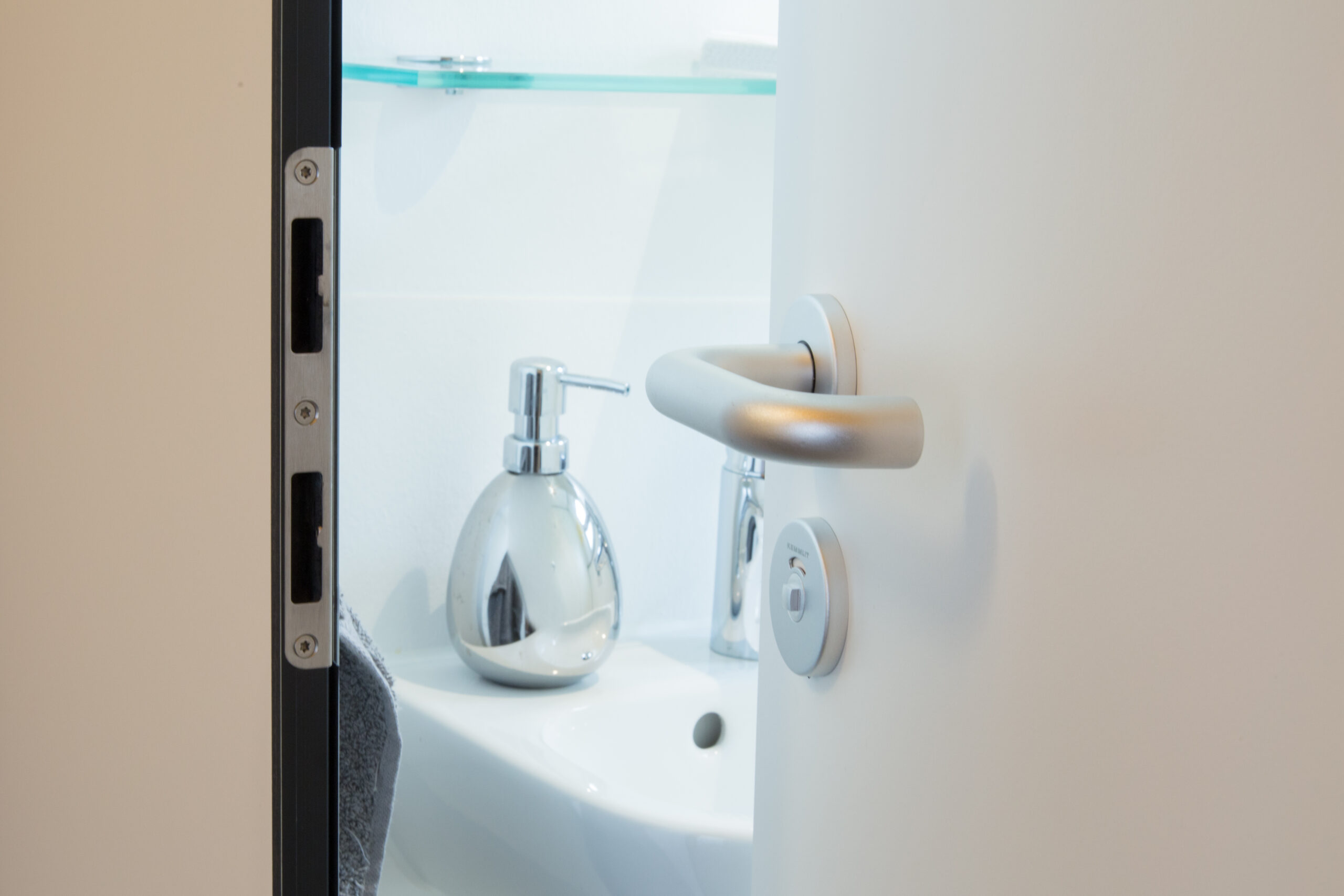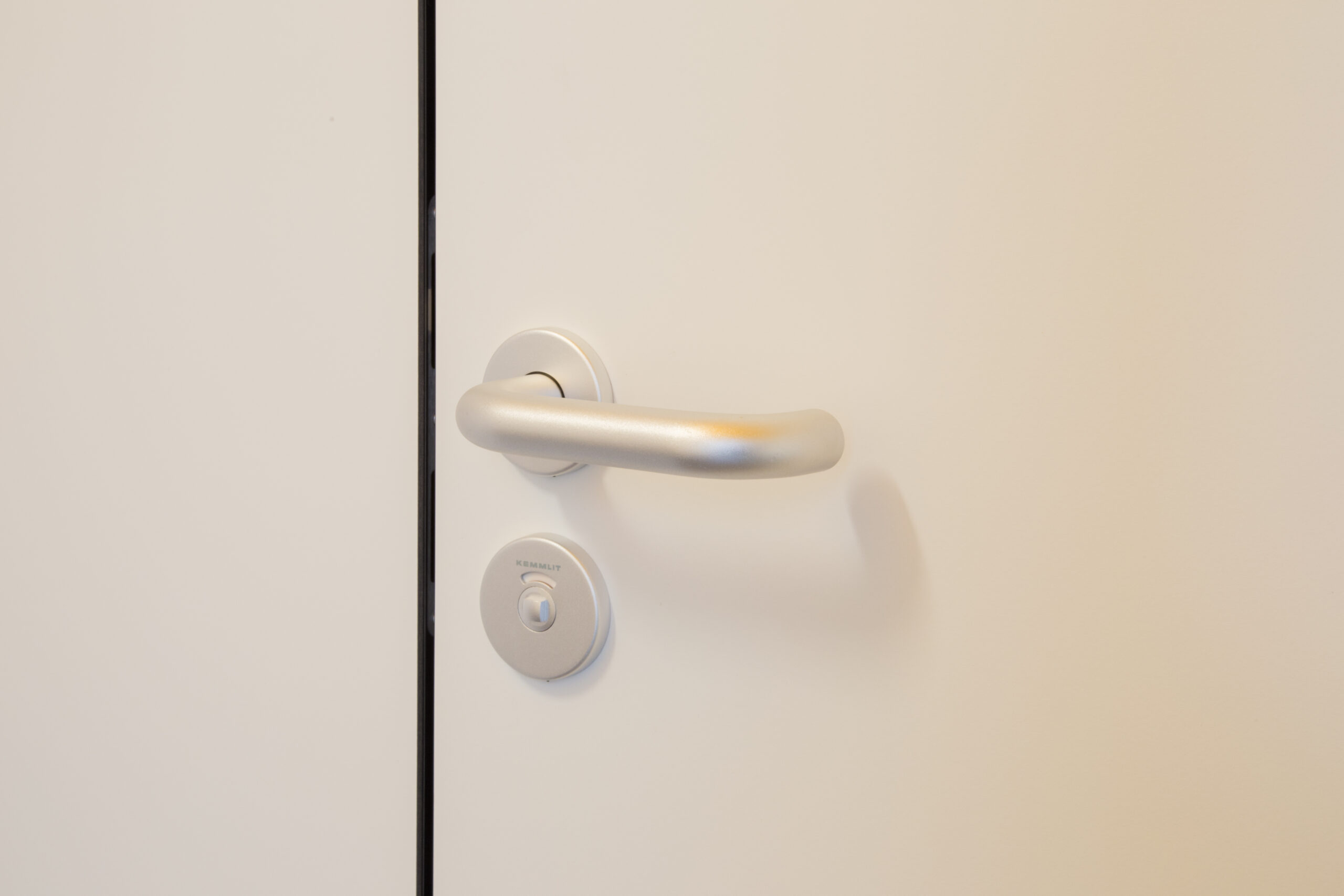 Das Design ist bewusst zeitlos gehalten: Die Flächen in klassischem Weiß harmonieren perfekt mit den hochwertigen Profilen, Bändern und Garnituren aus eloxiertem Aluminium, was dem Raum eine helle und hygienische Atmosphäre verleiht.