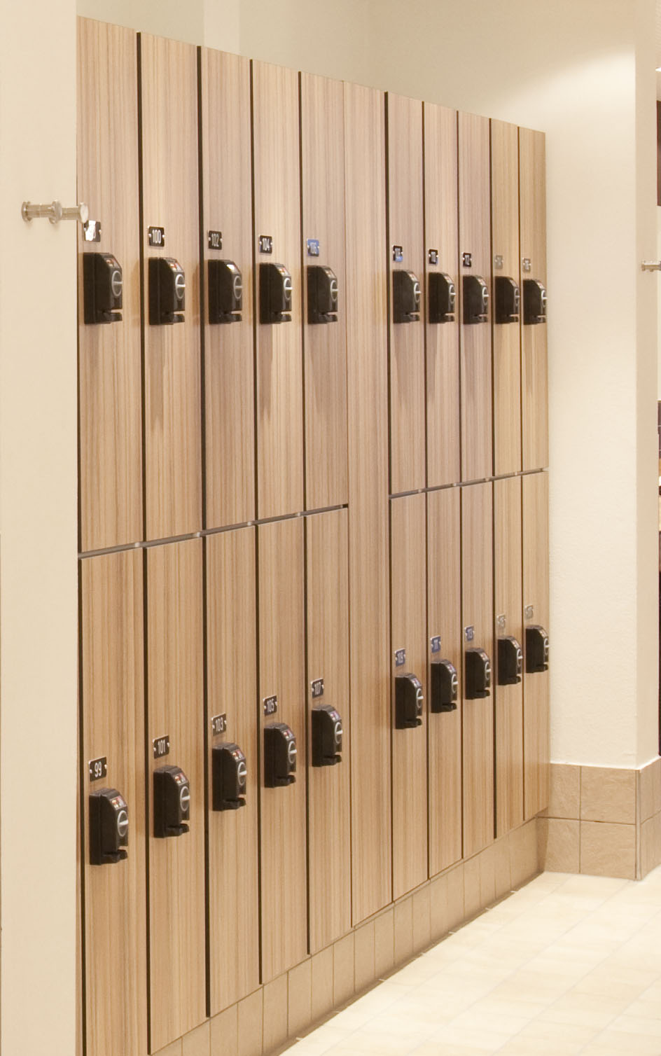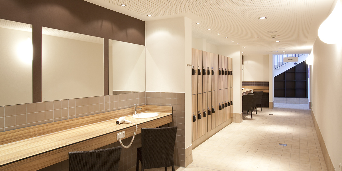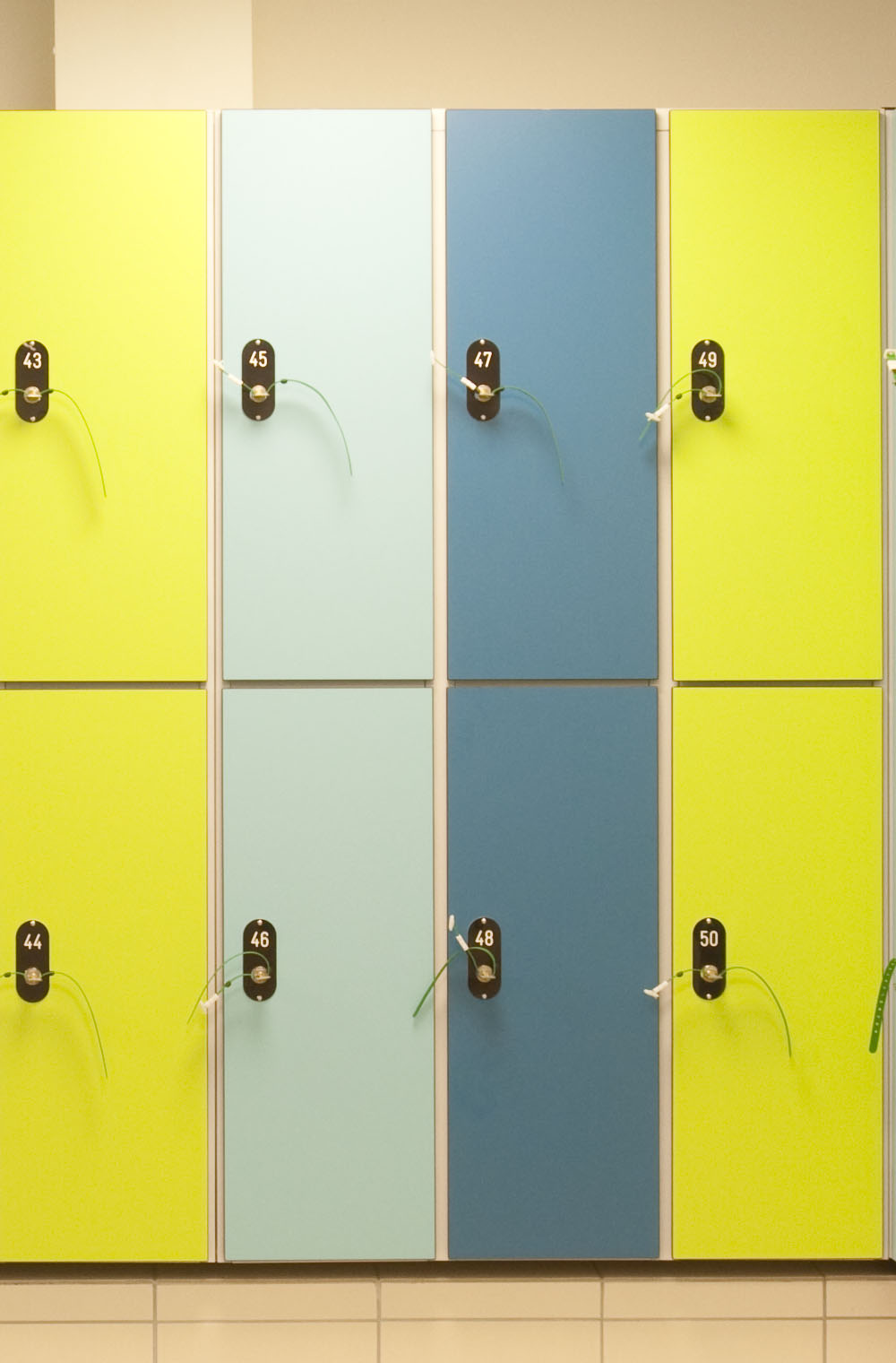 Im Umkleidebereich sorgen Garderobenschränke Typ R von KEMMLIT für ein modernes und funktionales Raumkonzept. Der korrosionsbeständige Aluminium-Korpus und das spezielle Pressfügeverfahren bieten höchste Stabilität, während Türen aus HPL eine harmonische Optik und Kratzfestigkeit gewährleisten.