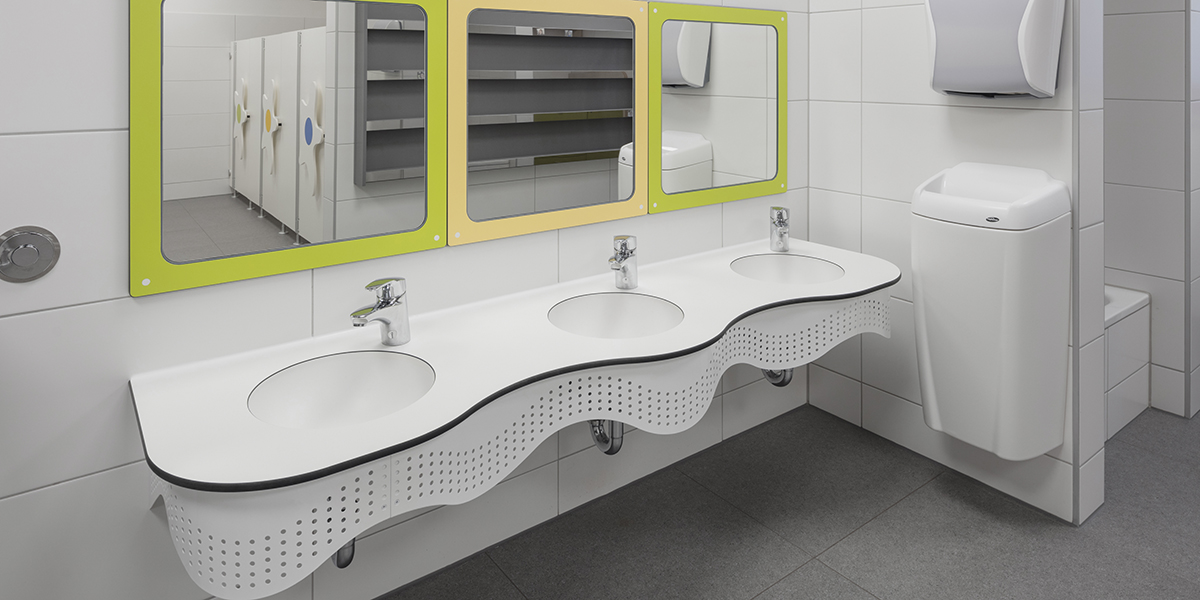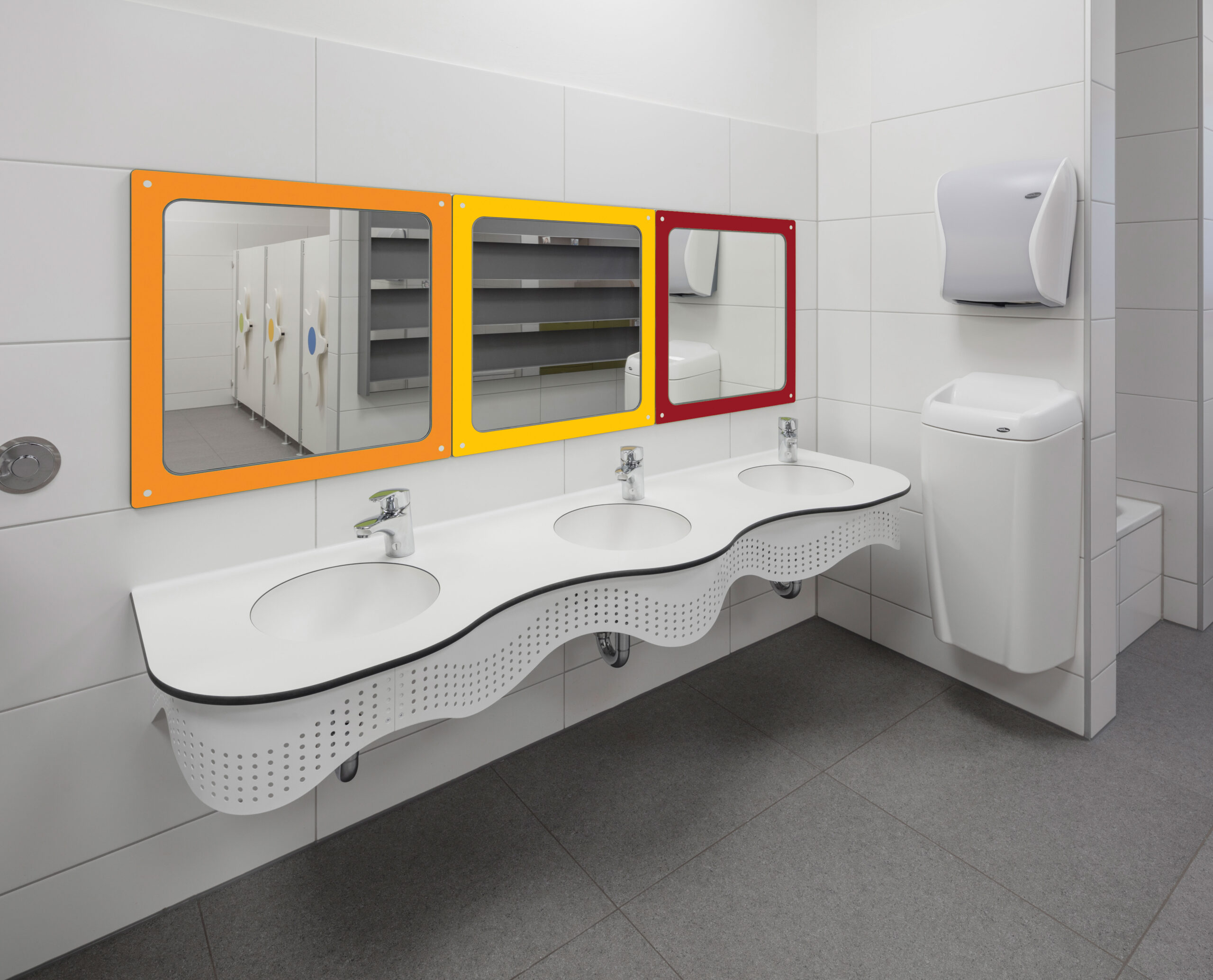 Besondere Sicherheitsmerkmale wie Bänder, Fingerklemmschutz, Füße und Plattenhalter aus eloxiertem Aluminium gewährleisten höchste Sicherheit im täglichen Gebrauch. Ergänzt wird die Ausstattung durch die Bambino Waschplätze mit Spiegeln, die ergonomisch auf die Bedürfnisse der Kinder abgestimmt sind und gleichzeitig die Hygiene im Kindergarten fördern.