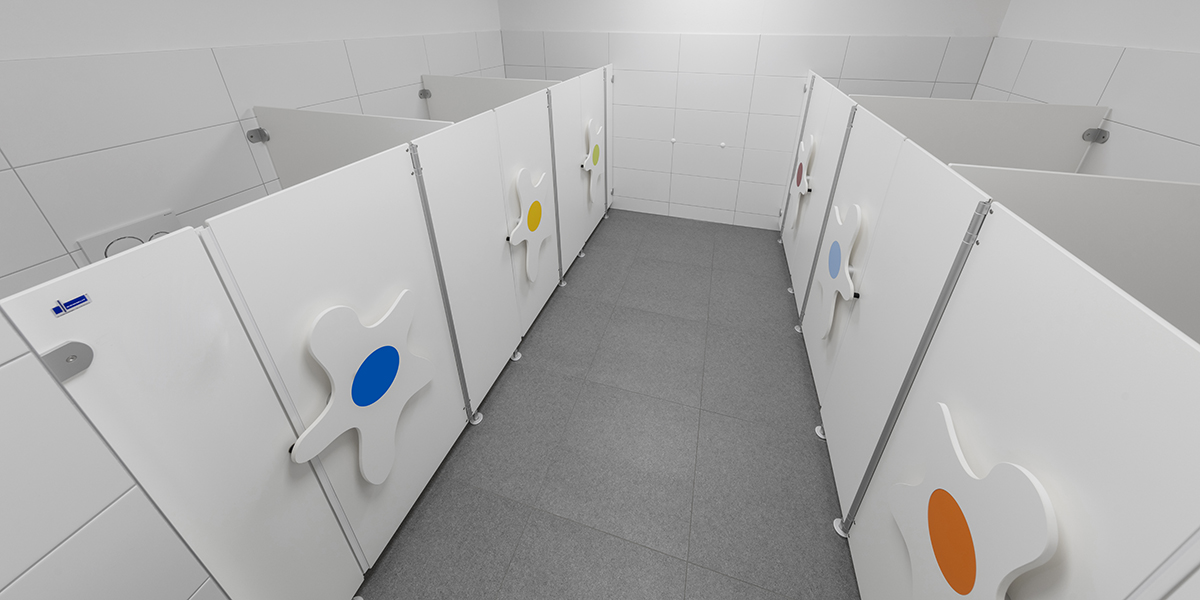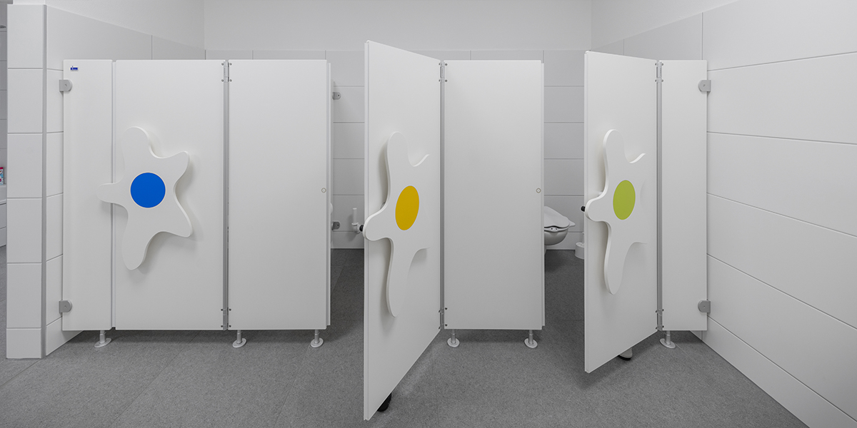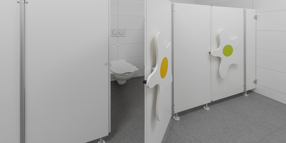 Im Paul-Gerhardt-Kindergarten in Kulmbach sorgt die Ausstattung von KEMMLIT für eine kindgerechte und funktionale Sanitärausstattung. Die WC-Trennwände B-Bambino Exklusiv in der Ausführung „Bianco Kleckse“ schaffen eine freundliche und ansprechende Atmosphäre und laden Kinder zum selbstständigen Nutzen der Sanitärräume ein.