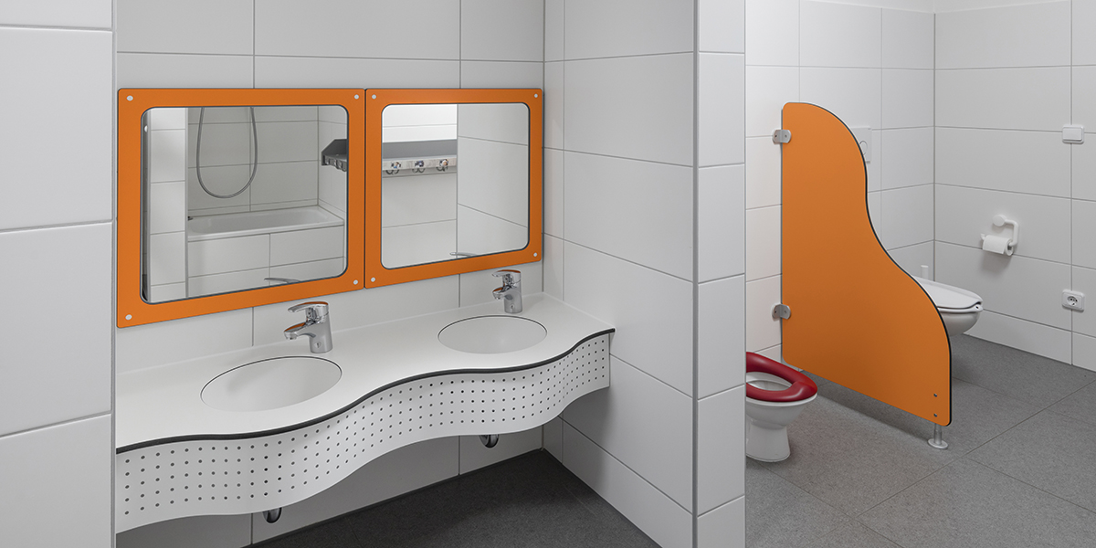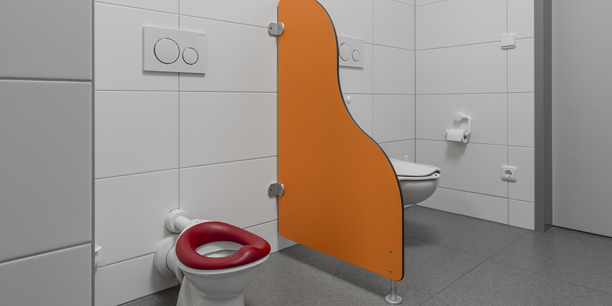 Durch die Kombination aus farbenfrohen Trennwänden, sicheren Griffen und funktionalen Waschplätzen entsteht ein harmonisches und kindgerechtes Umfeld, das den Alltag im Kindergarten angenehm und sicher gestaltet.