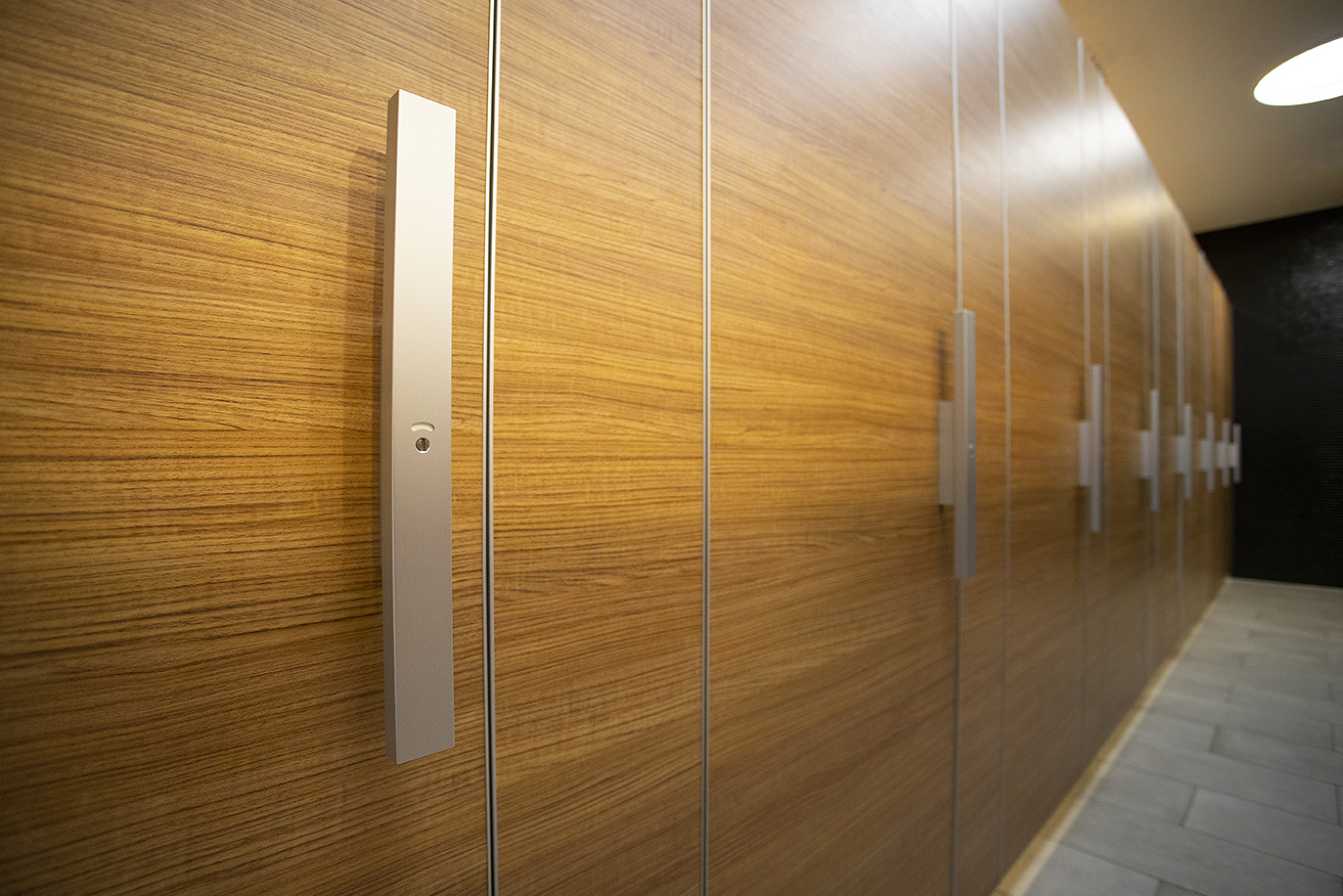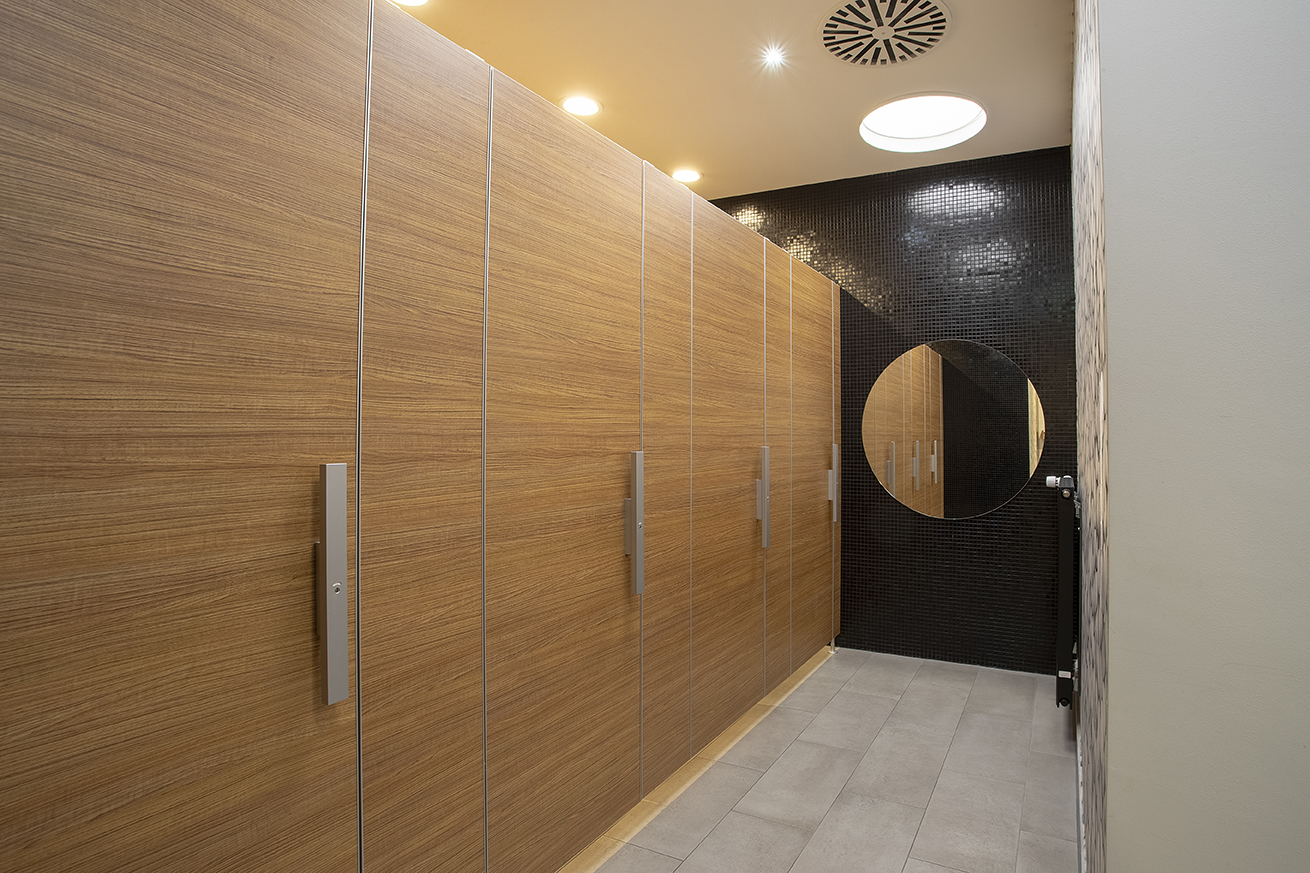 Die Trennwände bestehen aus robusten, 38 mm starken Holzwerkstoffelementen, die mit einer langlebigen ABS-Kante versehen sind. Bänder, Profile und Füße aus eloxiertem Aluminium gewährleisten Stabilität und eine moderne Optik, während die Griffstange GS 40 430 M aus Aluminium zusätzlichen Bedienkomfort bietet.