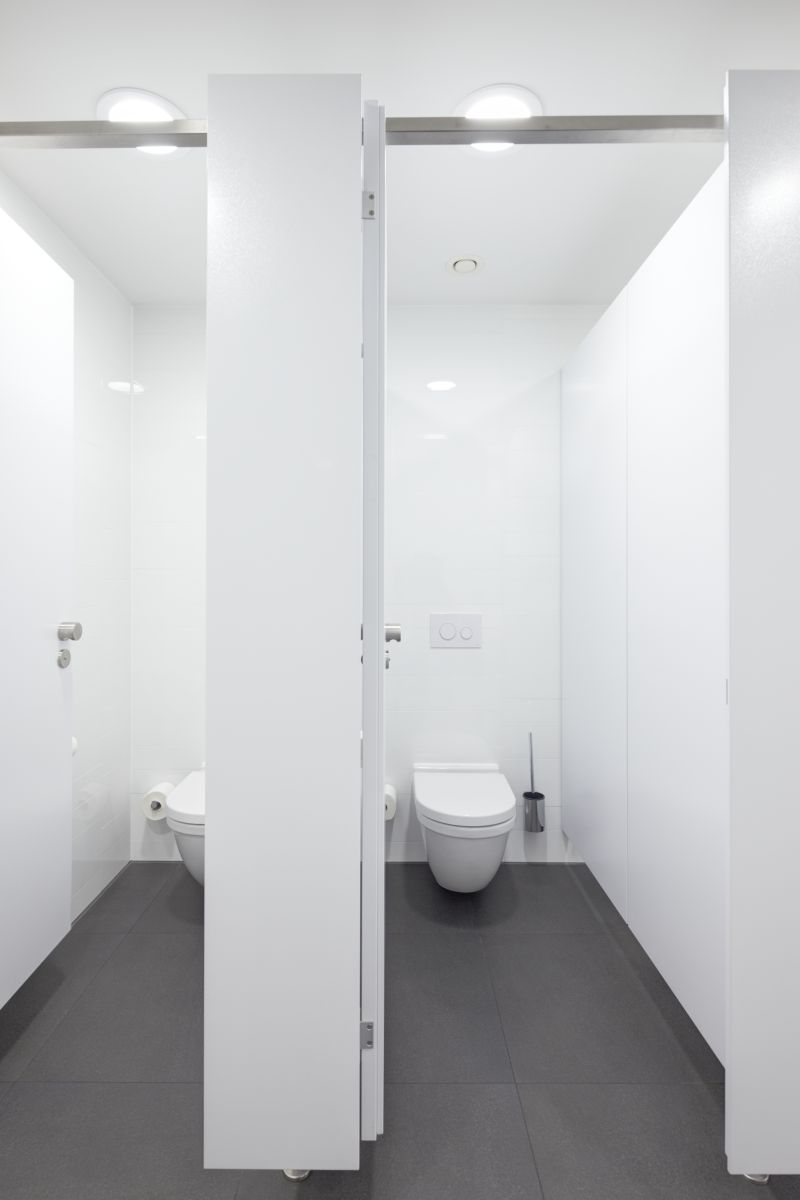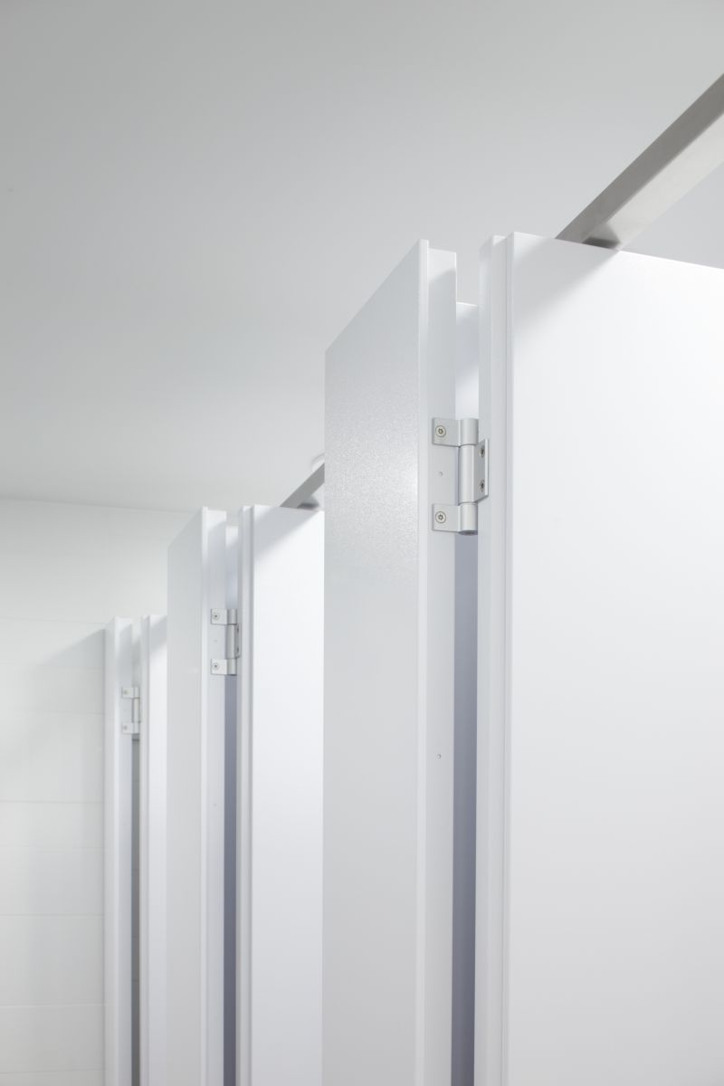 Durch die fast raumhohe Ausführung mit decken- und bodennahen Türen wird ein hohes Maß an Privatsphäre, Schallschutz sowie optimale Be- und Entlüftung erreicht. Der verdeckt integrierte Stabilisator unterstützt zudem das klare, ruhige Erscheinungsbild der Front.