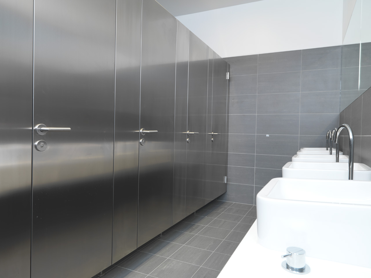 Die raumhohen Türen und Wandelemente sorgen für maximale Privatsphäre, Schallreduktion und optimale Be- und Entlüftung. Dank der flexiblen Bauweise können Reihenanlagen und Querkabinen frei gestaltet werden, während die antibakterielle Oberfläche für hygienische WC-Bereiche sorgt.