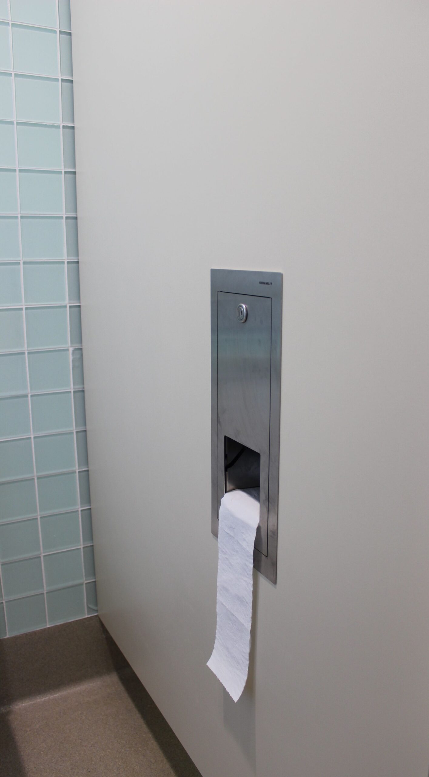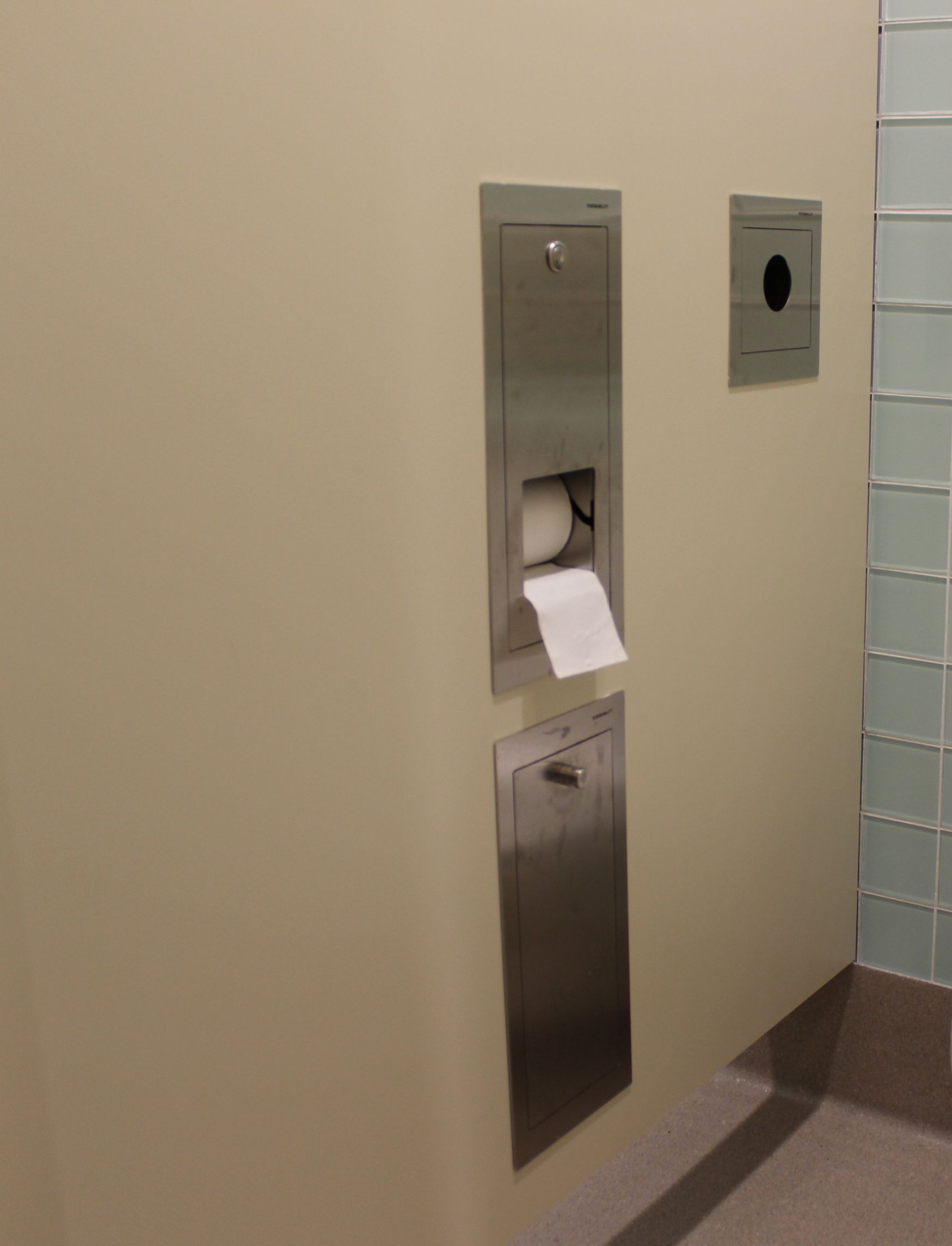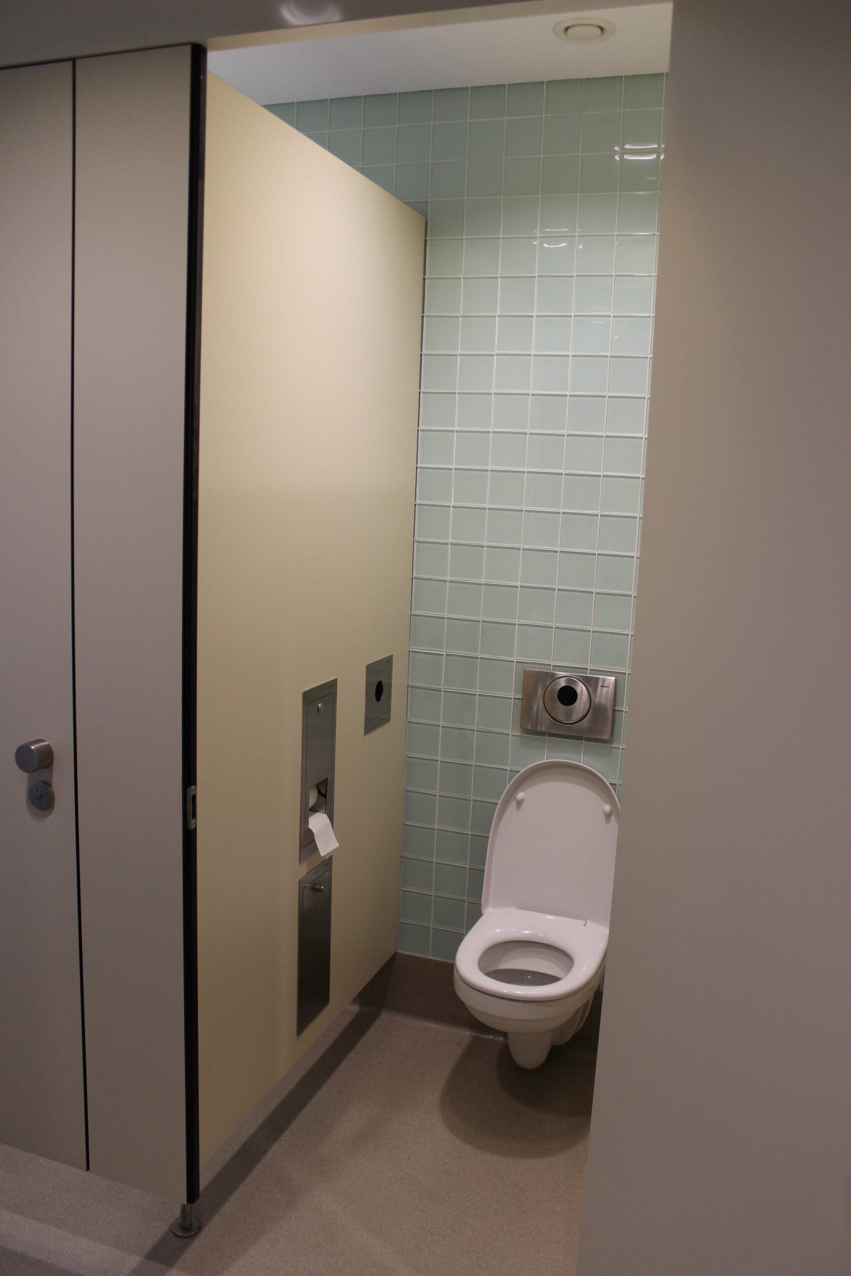 Das herausragende Merkmal von saniQub ist die Integration der Zubehörteile: Die Komponenten der saniApp-Serie – darunter Abfallbehälter und Hygienebeutelspender – sind bündig und platzsparend direkt in das Wandsystem eingelassen. Dies sorgt für eine aufgeräumte Optik und erschwert Vandalismus. Ein wichtiges Detail in diesem öffentlichen Bereich ist der Zweifach-WC-Rollenhalter mit Zylinderhebelschloss, der den Diebstahlschutz gewährleistet.