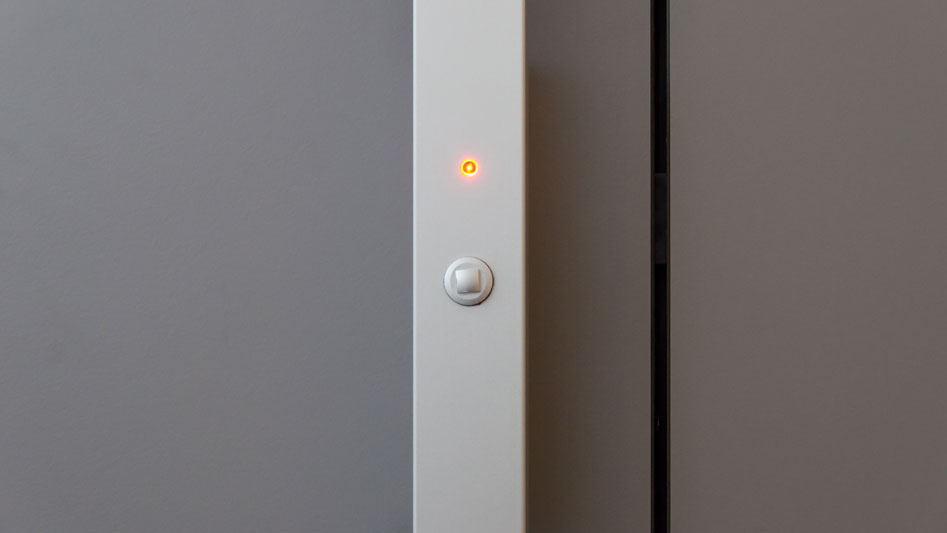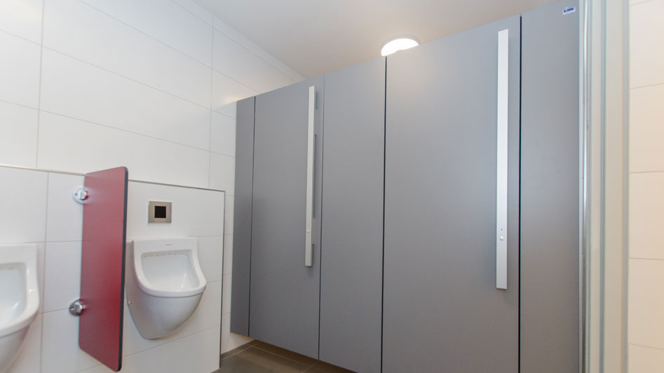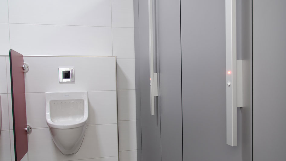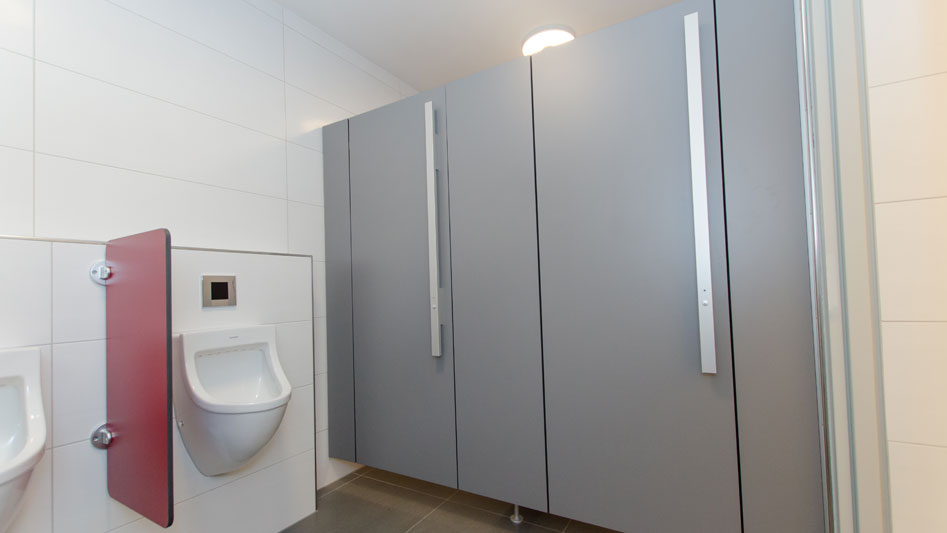 Auch technisch setzt die Anlage Maßstäbe: Die hochwertige Griffstange aus Aluminium verfügt über eine innovative LED-Verriegelung, die den Besetzt-Status gut sichtbar signalisiert. Die schwebende Ausführung mit zurückgesetzten Füßen unterstreicht das moderne Design, das durch den Farbkontrast von granatroten Zwischenwänden und quarzgrauen Türen abgerundet wird.