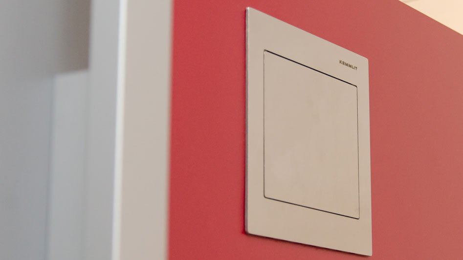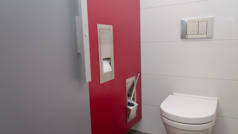 - Systemwand saniQub in Verbindung mit WC-Trennwand PRIMO in schwebender Ausführung mit zurückgesetzten Füßen und Stabilisatoren, Zwischenwandfarbe in granatrot, Türfarbe in quarzgrau, Garnituren als Griffstange aus hochwertigem Aluminium und LED-Verriegelung.