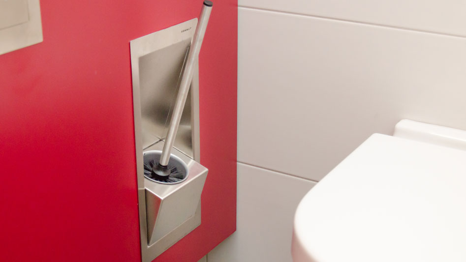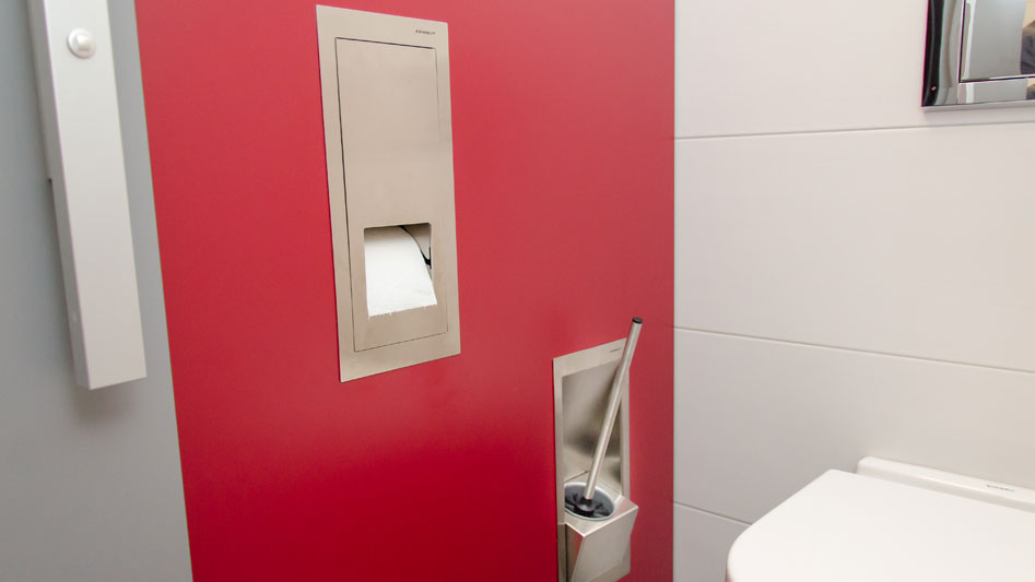 Das herausragende Merkmal von saniQub ist die Integration der Zubehörteile: Die Komponenten der saniApp-Serie – darunter Zweifach-Rollenhalter, WC-Bürstengarnitur, Abfallbehälter sowie Hygienebeutel- und Duftspender – sind bündig und platzsparend direkt in das Wandsystem eingelassen. Dies sorgt für eine absolut aufgeräumte Optik und erleichtert die Reinigung.